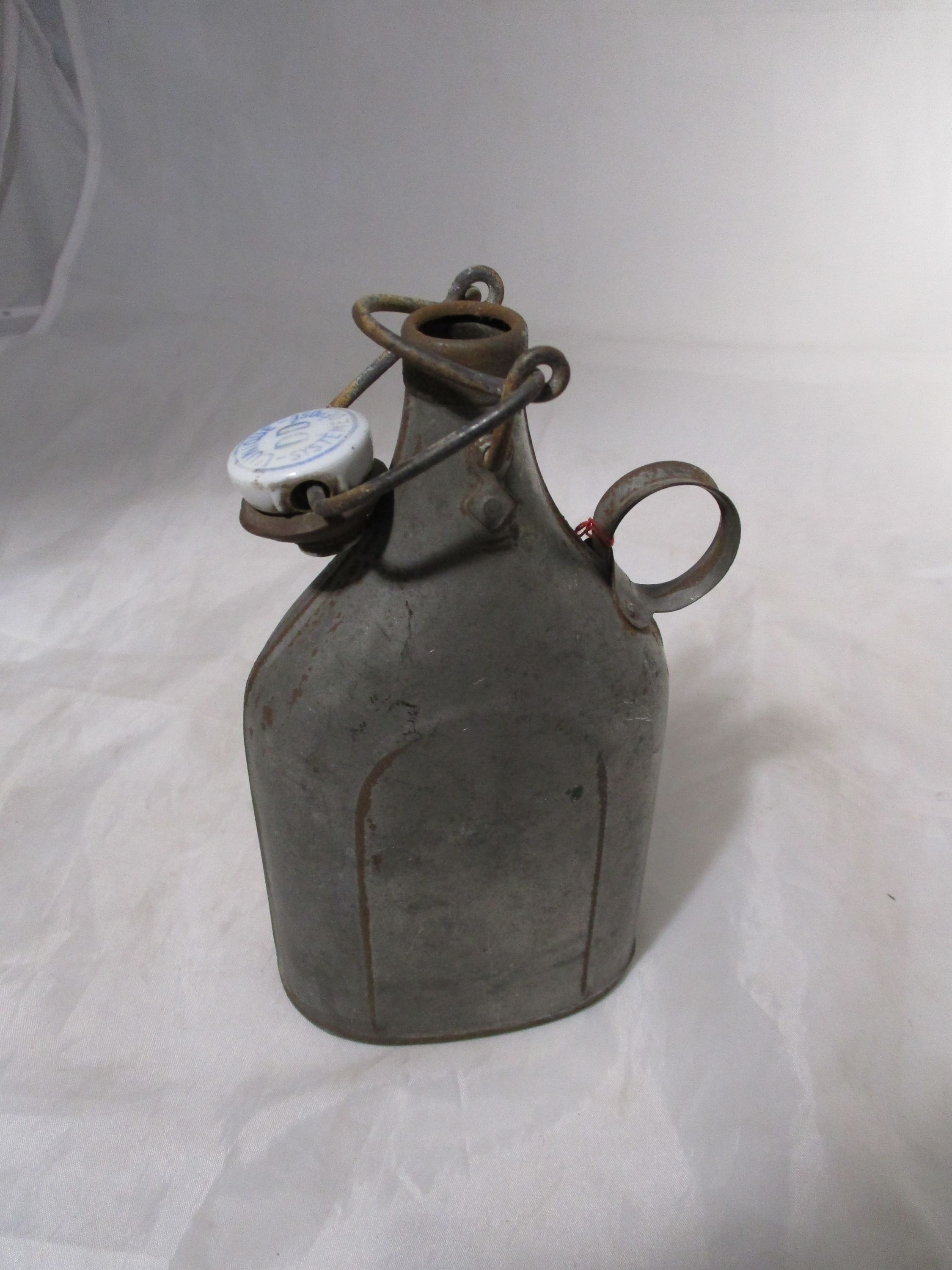 Gourde ou boutelot en métal avec un bouchon en porcelaine articulé.