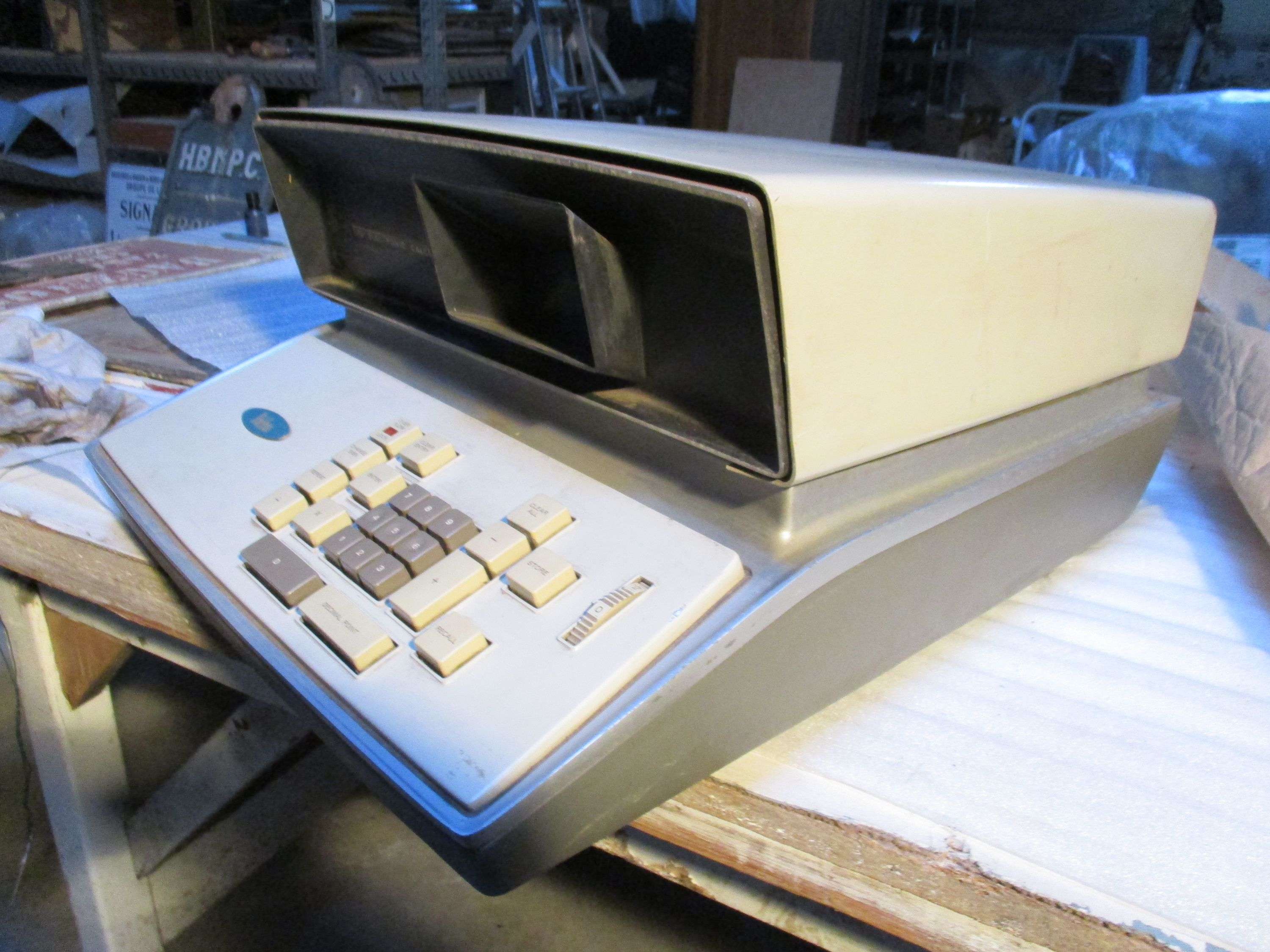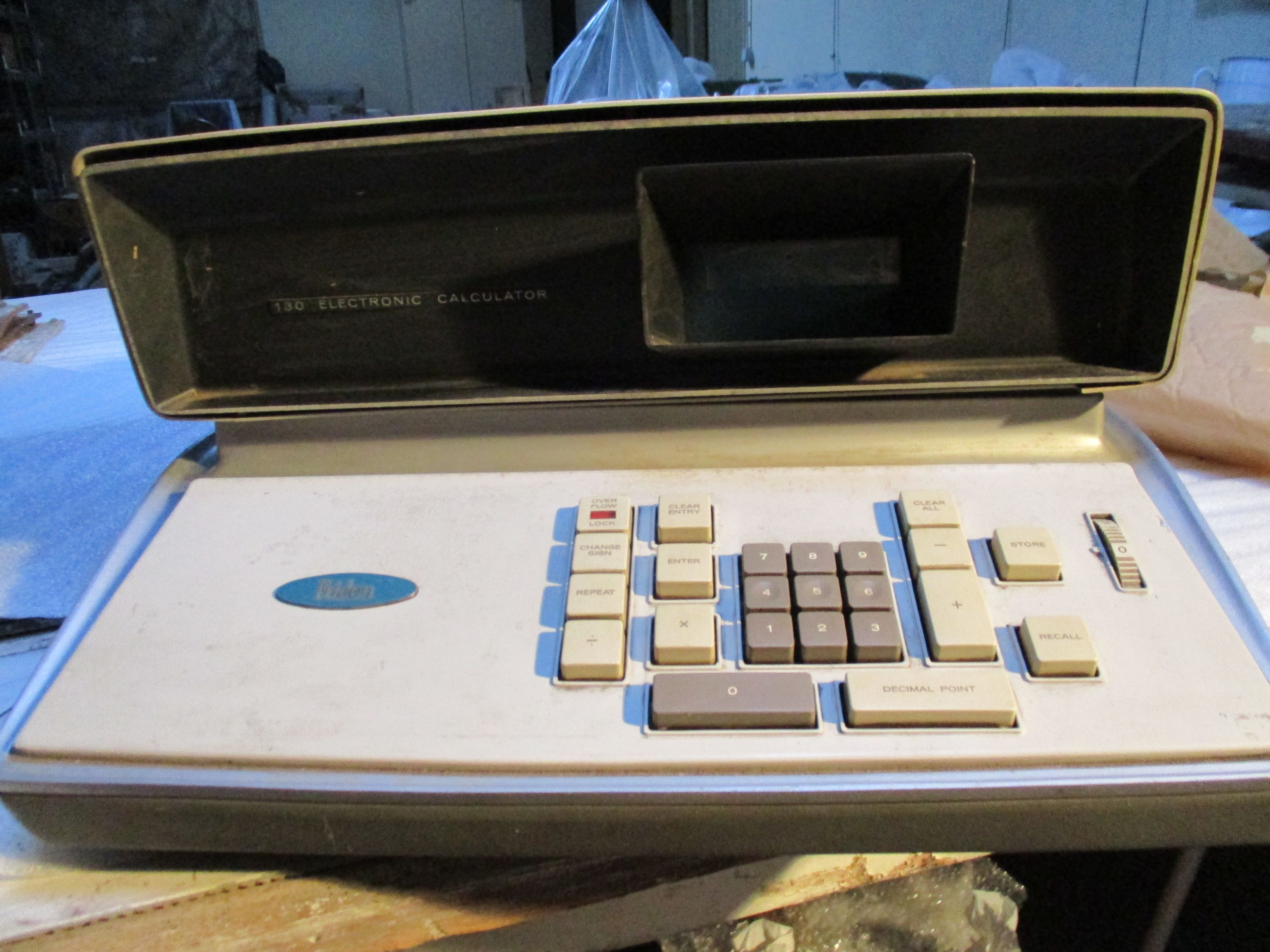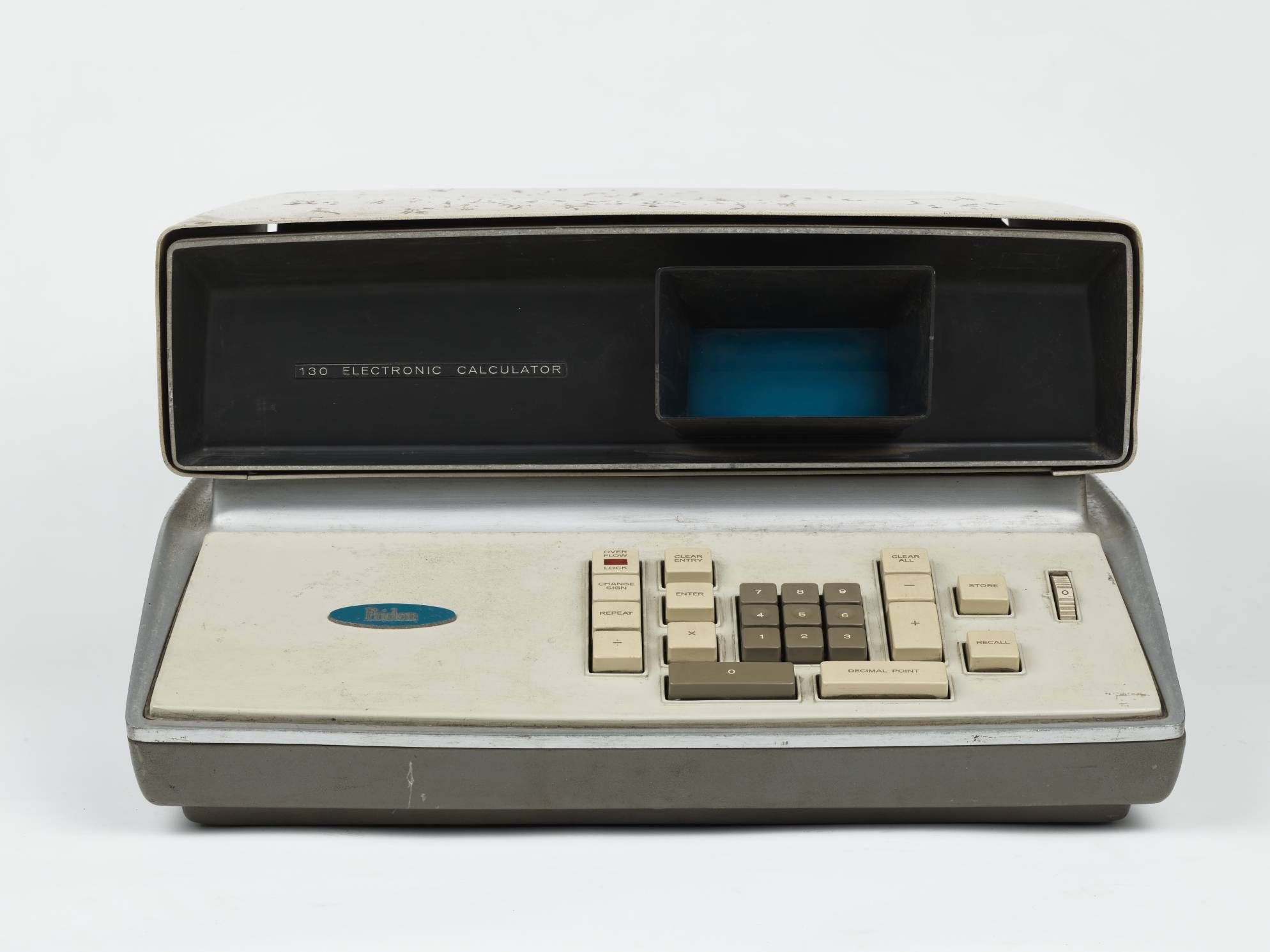 Calculatrice électronique Friden EC-130. Il s'agit de l'une des premières calculatrices électroniques entièrement transistorisées. Cet instrument imposant est doté de neuf touches numériques carrées en plastique, surmontées d'une barre de zéro et d'une barre de virgule décimale. Outre les touches pour les quatre opérations arithmétiques, il dispose des touches de changement de signe, de validation, de répétition, d'effacement, de suppression totale, de mémorisation, de rappel et de verrouillage de dépassement. Un sélecteur de virgule décimale se trouve à droite.