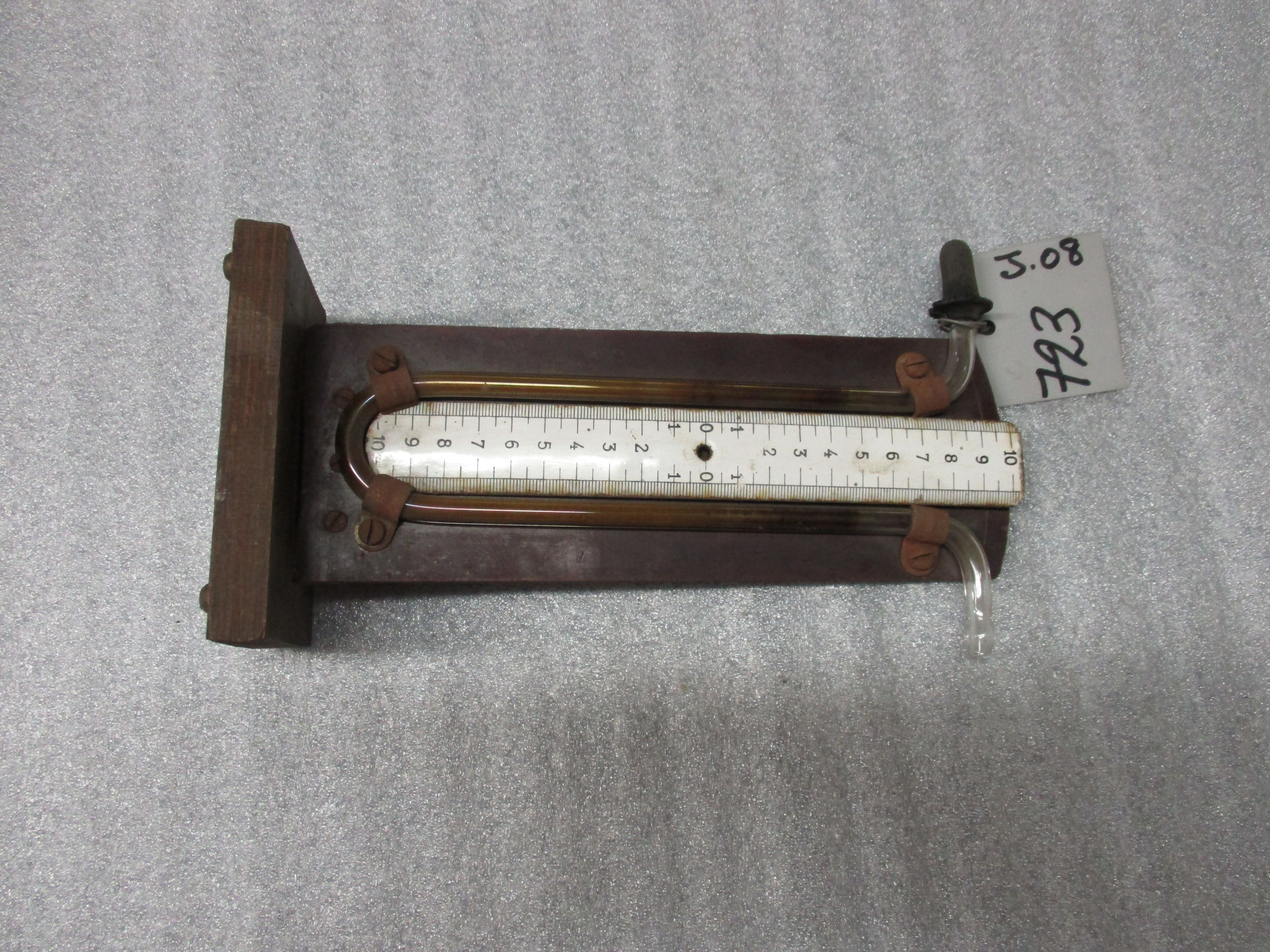 Déprimomètre de laboratoire composé d'un tube courbé associé à une graduation. Le tout est fixé sur un support vertical en bois.