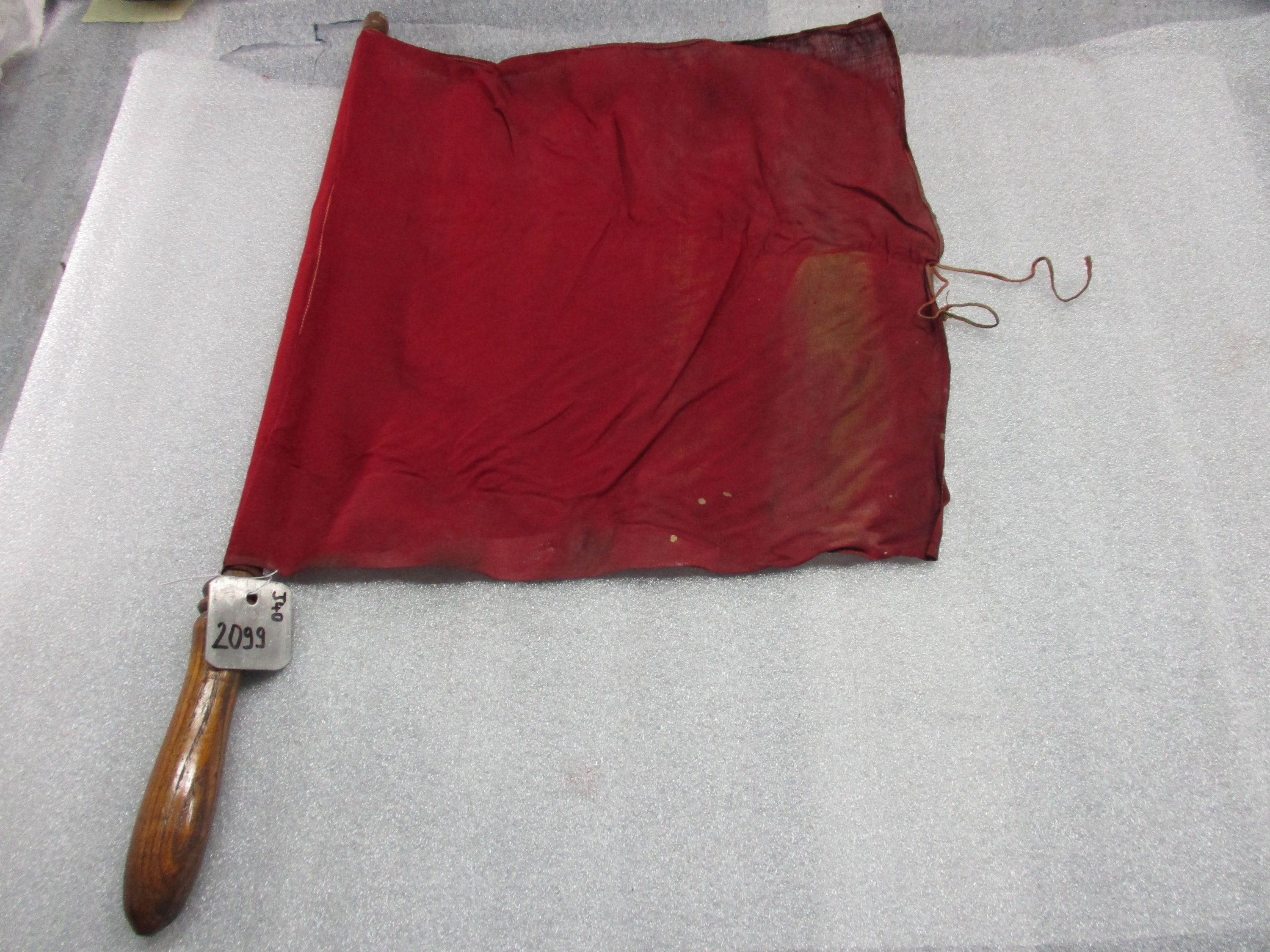 Drapeau en tissu rouge fixé à un manche en bois