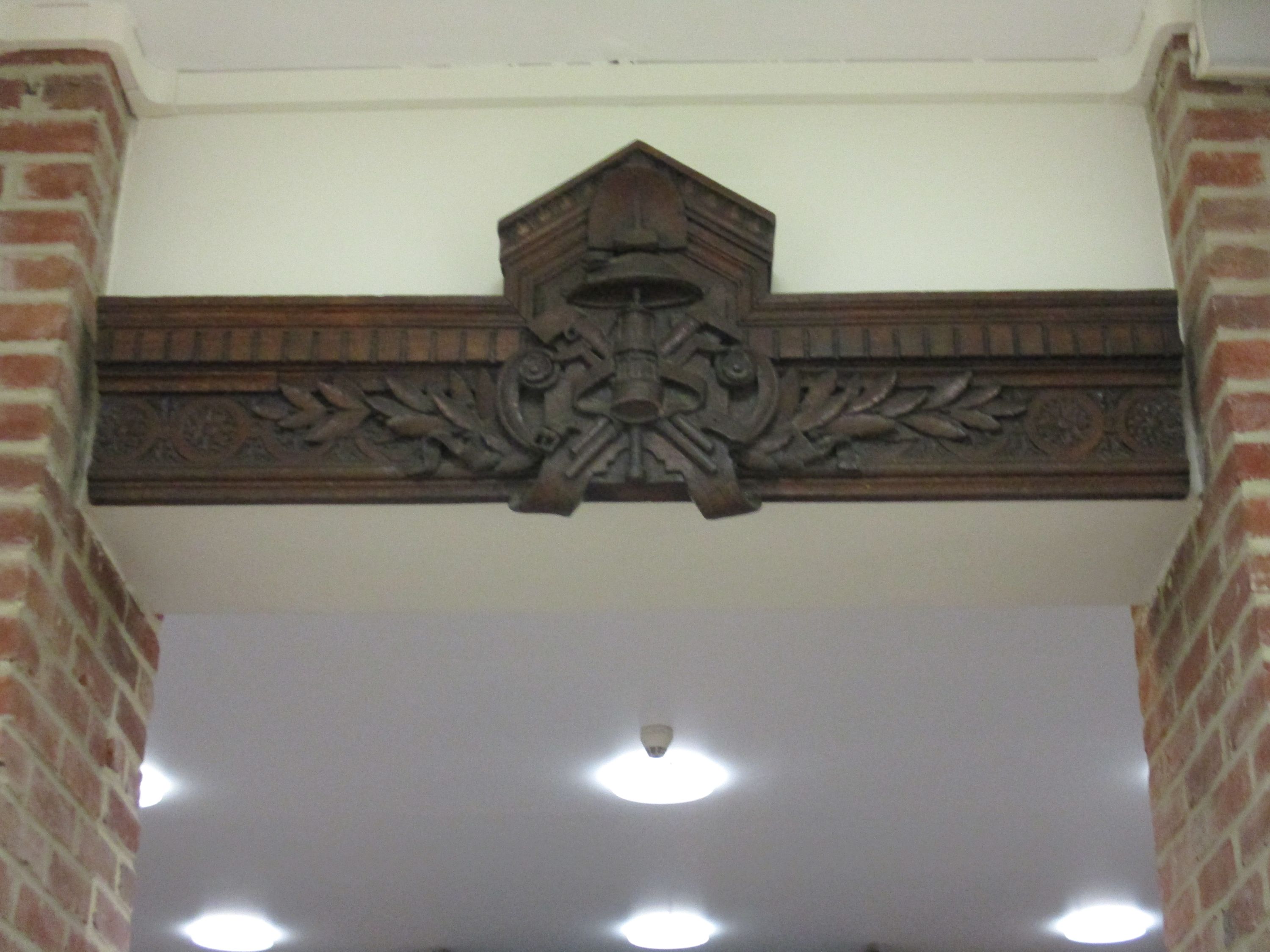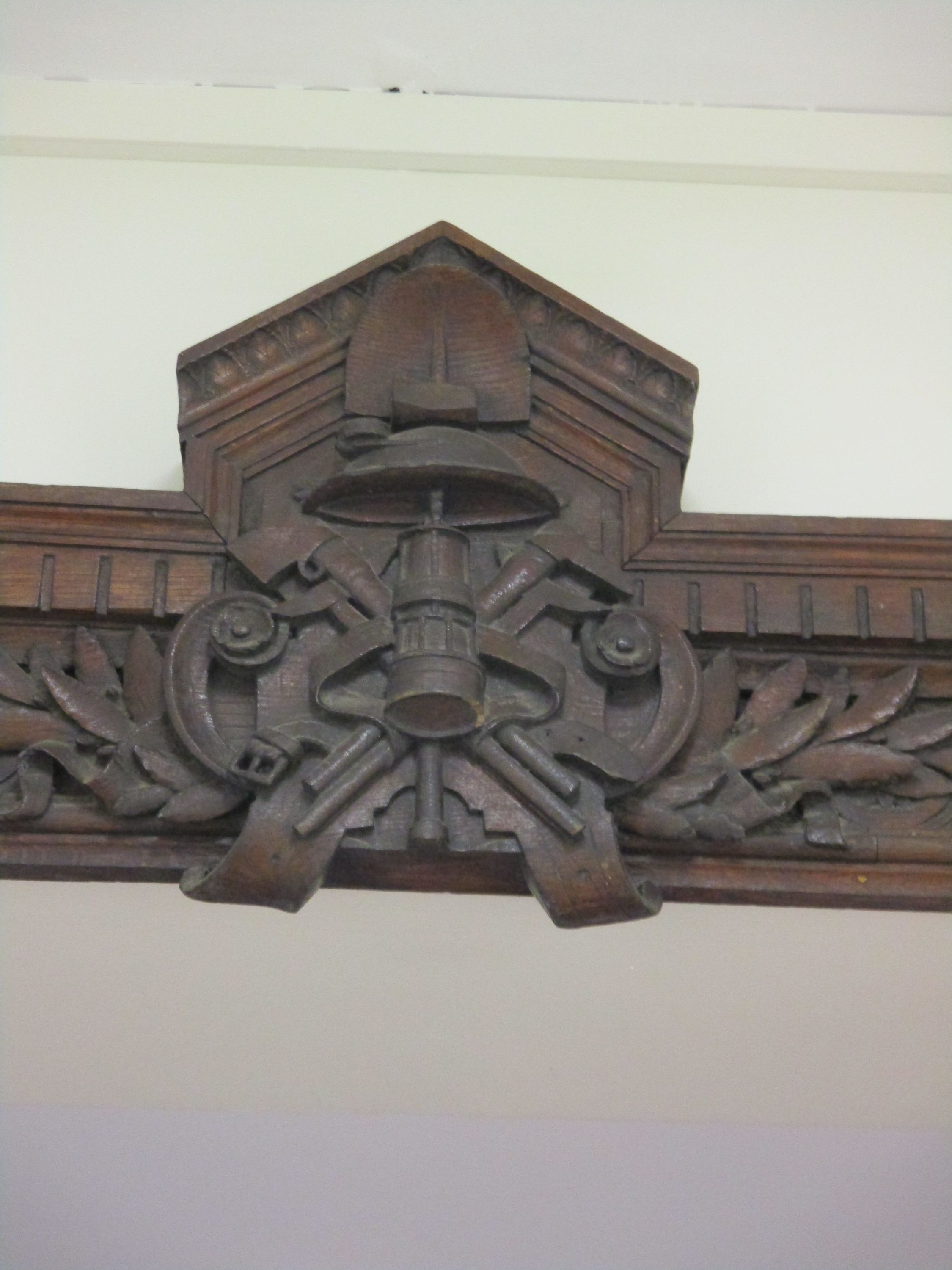 Fronton en bois sculpté avec un décor floral et un trophée du mineur (une pelle, une barette de mineur, une lampe, un pic, une rivelaine, une hache et une ceinture).