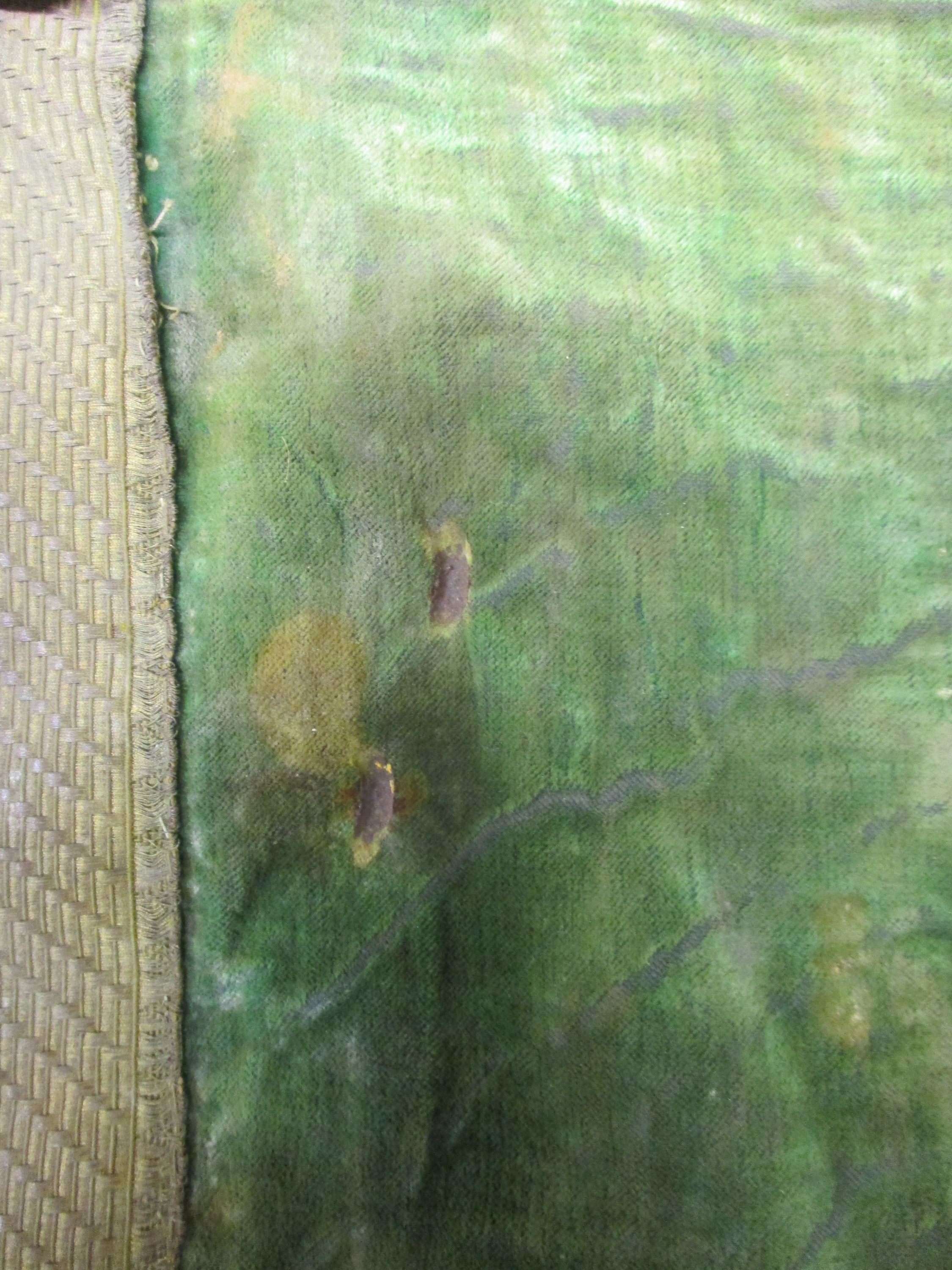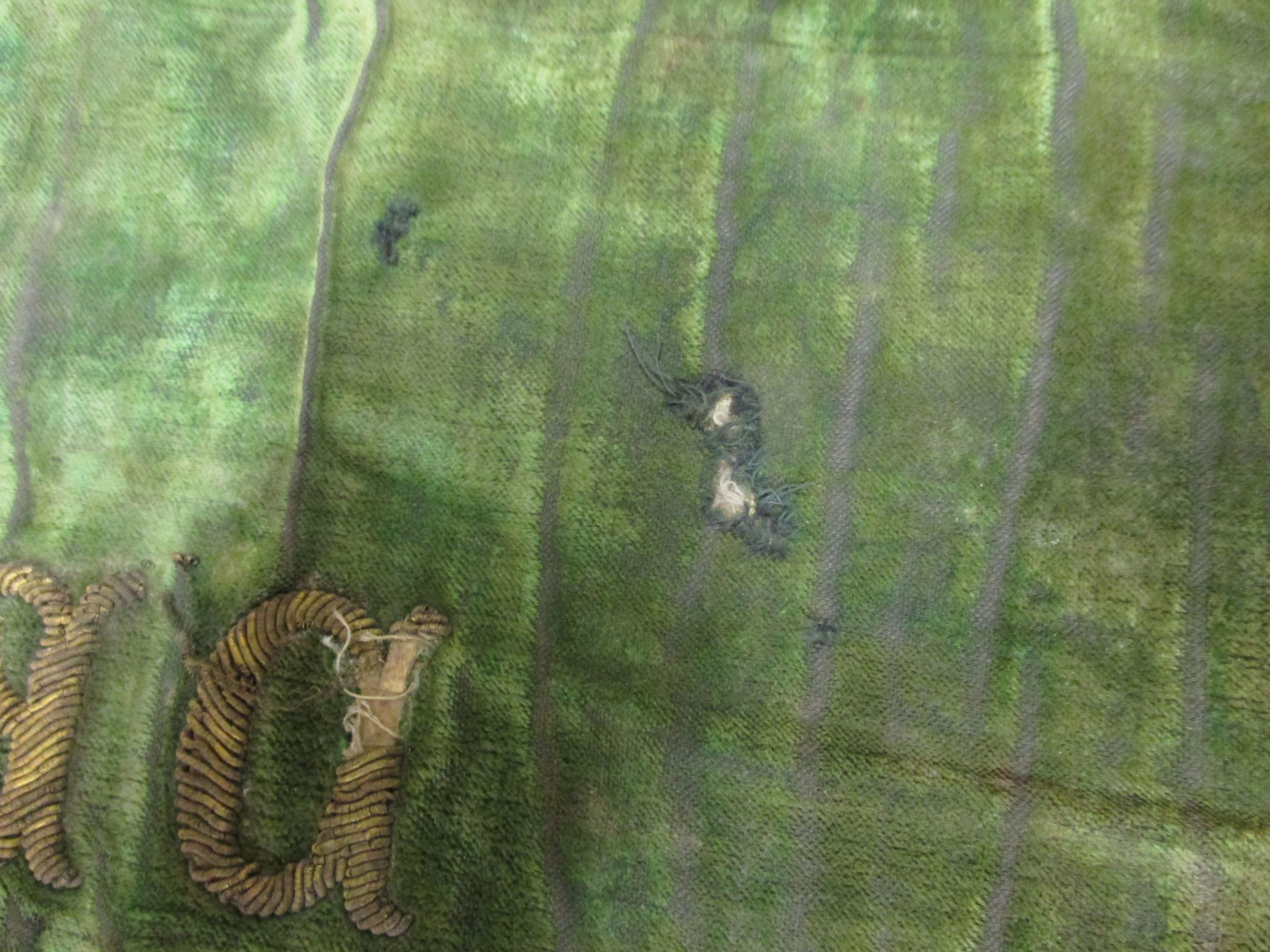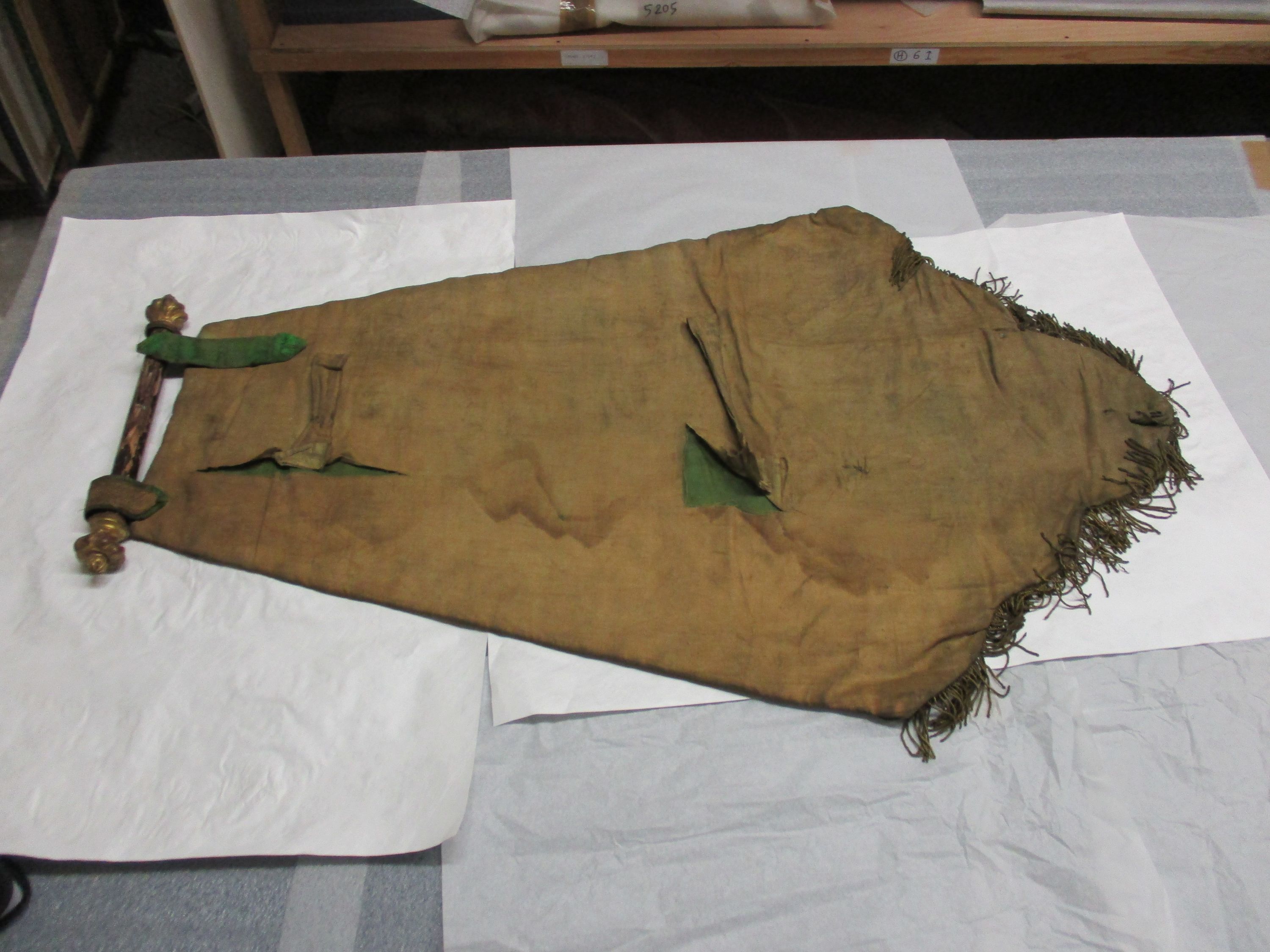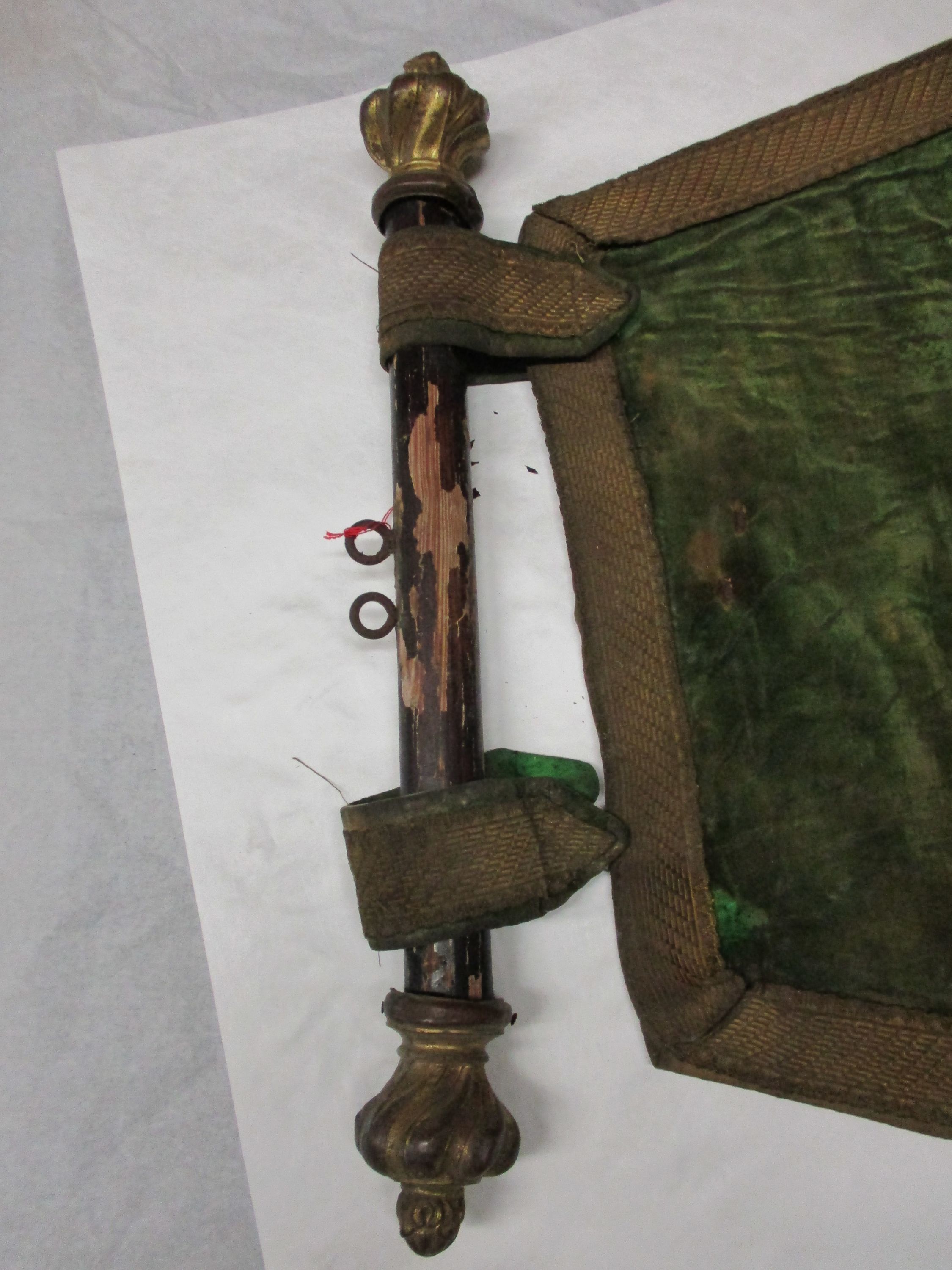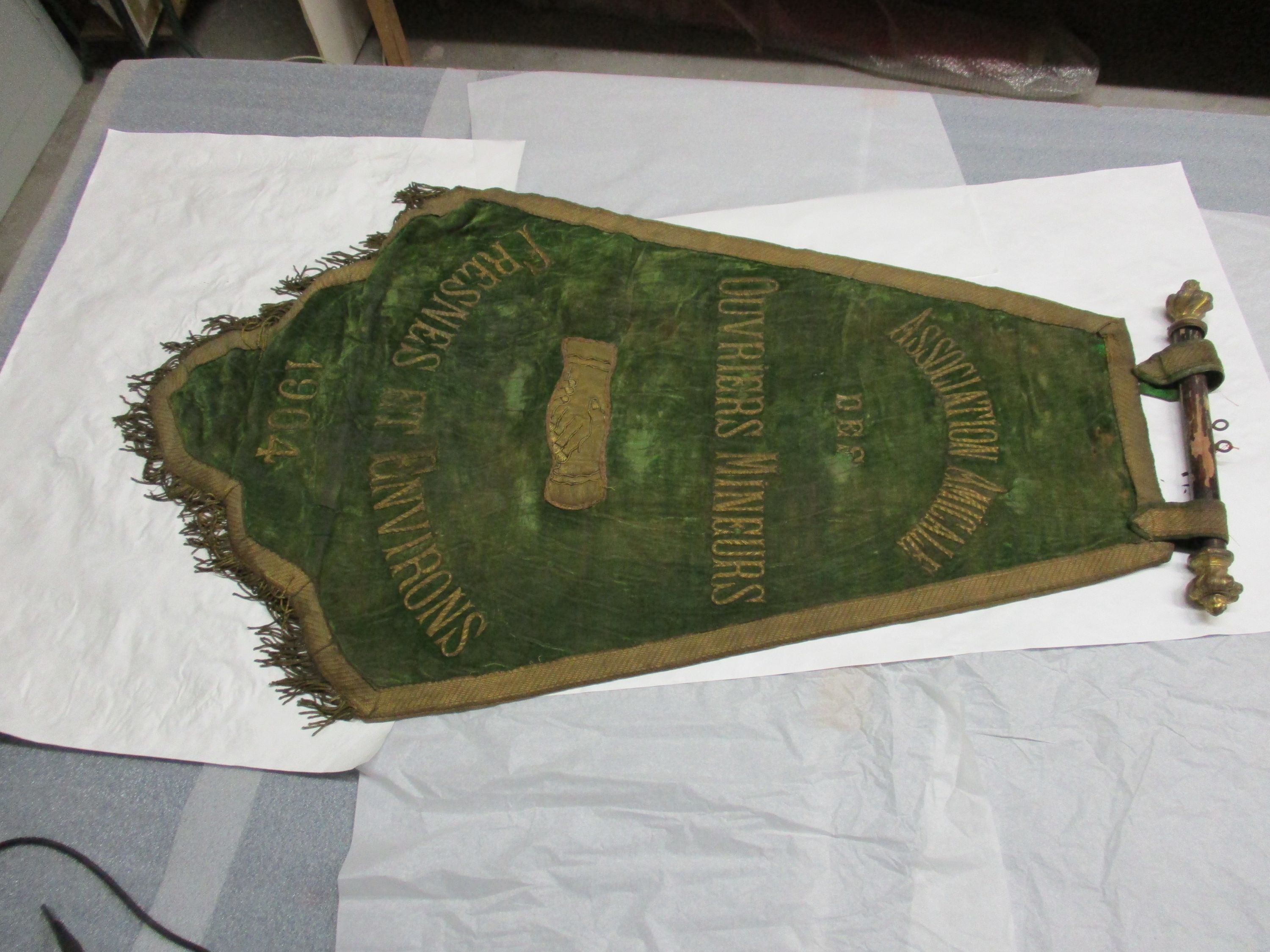 Bannière en velours vert portant une inscription et le motif d'une poignée de mains brodés de fils dorés. Au sommet, la bannière est accrochée à un bâton.
