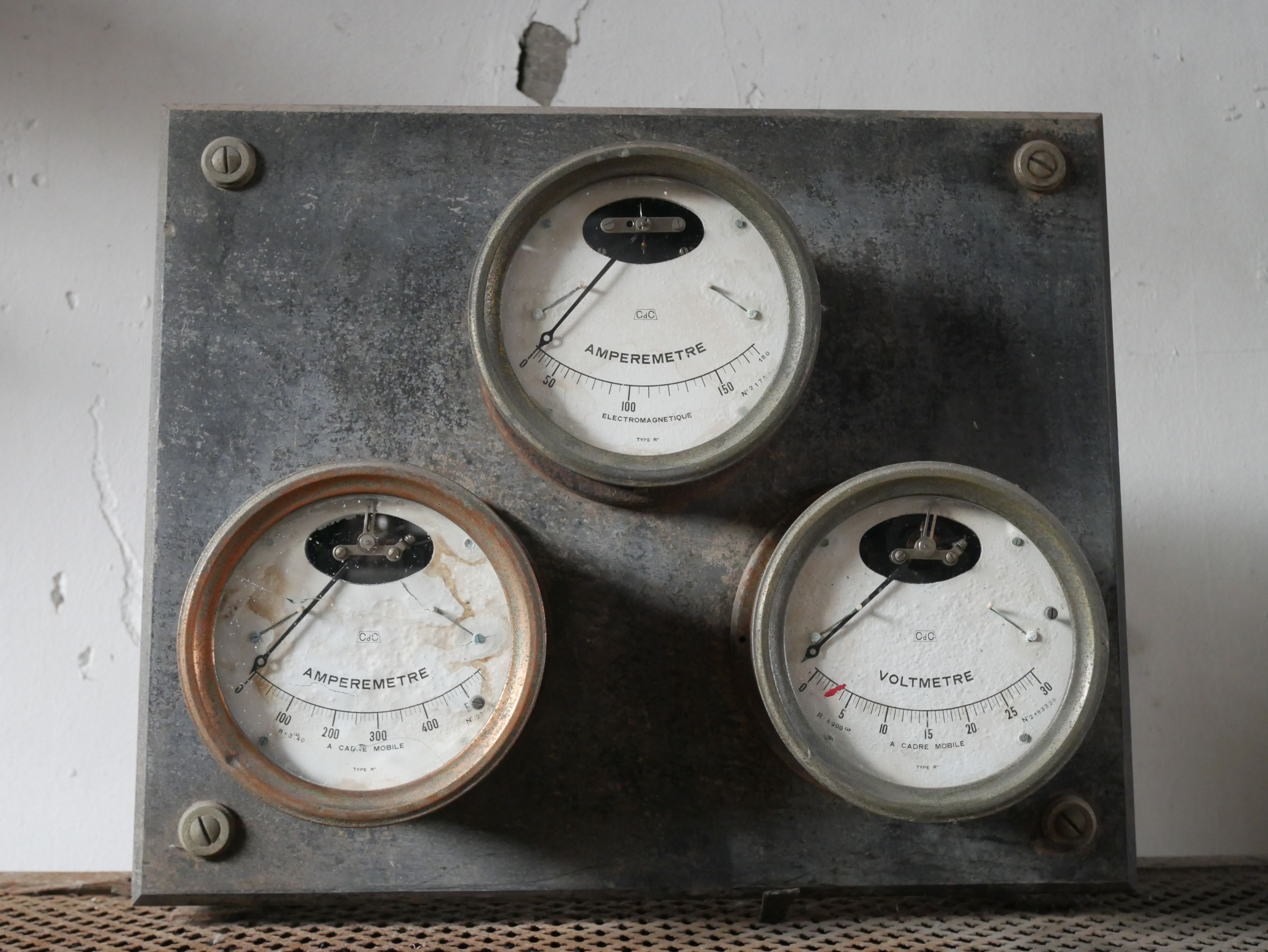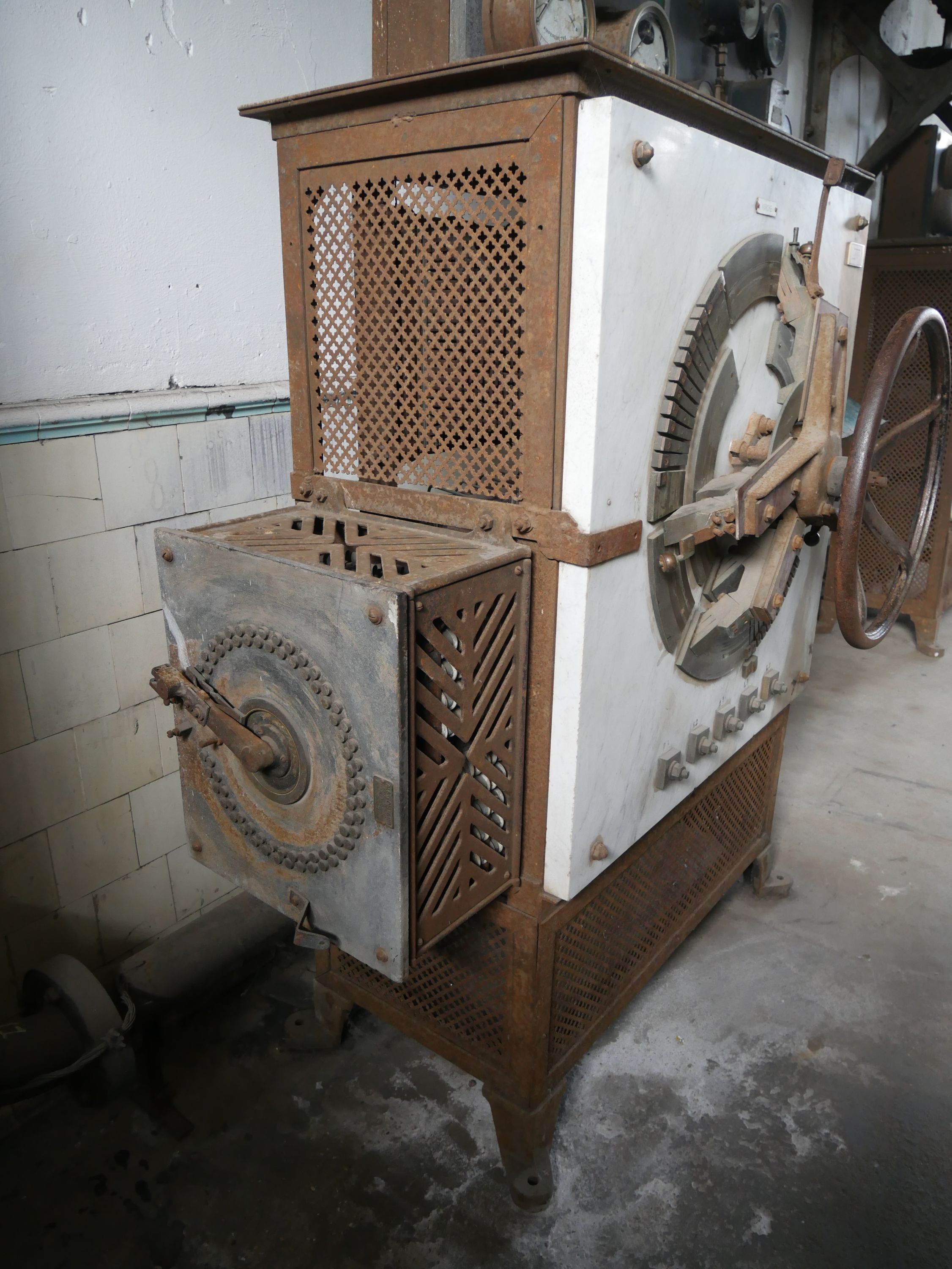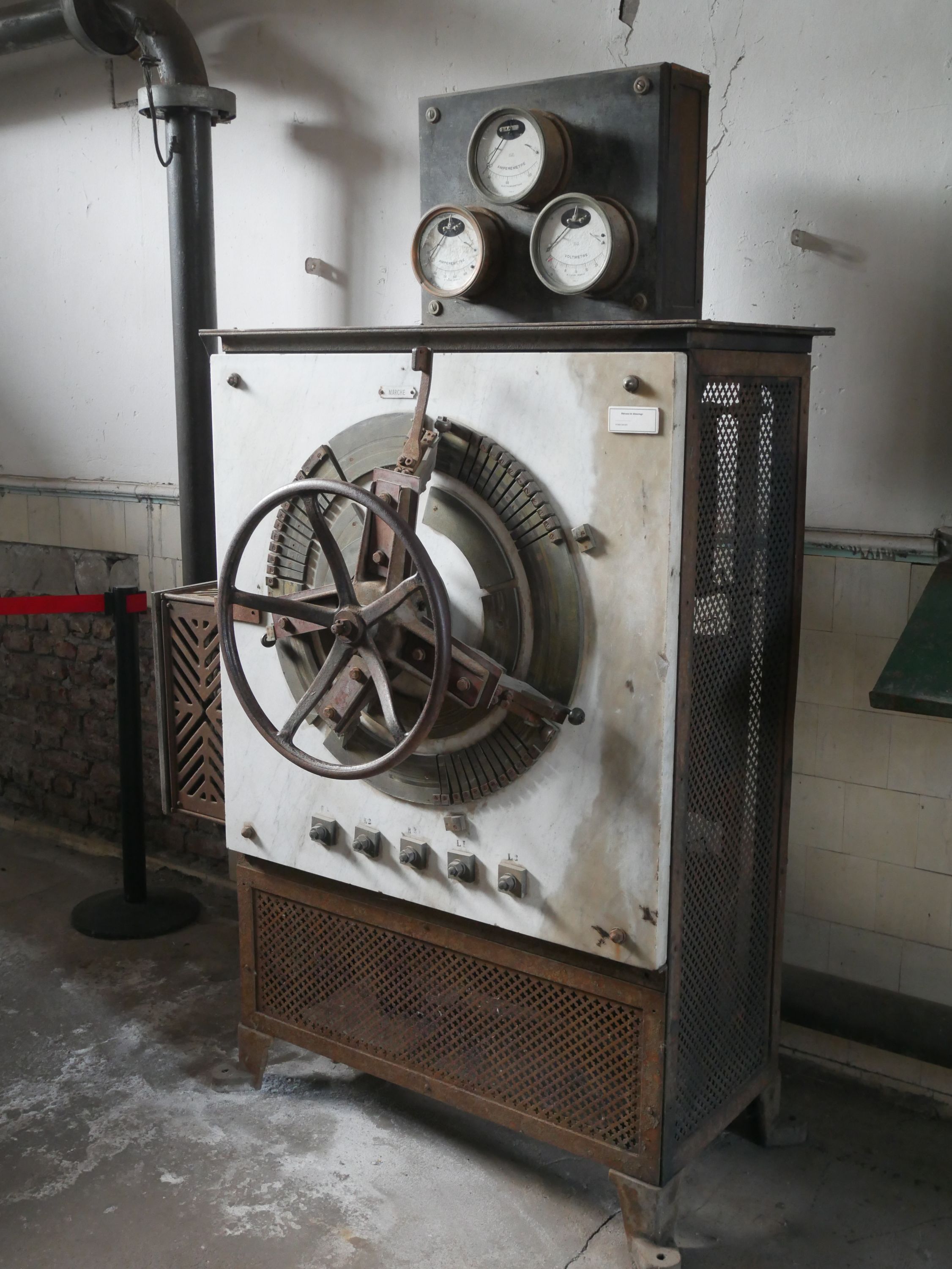Rhéostat de démarrage de compresseur composé d'un caisson plaqué de marbre blanc et surmonté de trois cadrans (deux ampèremètres et un voltmètre). Une manivelle se trouve en façade.