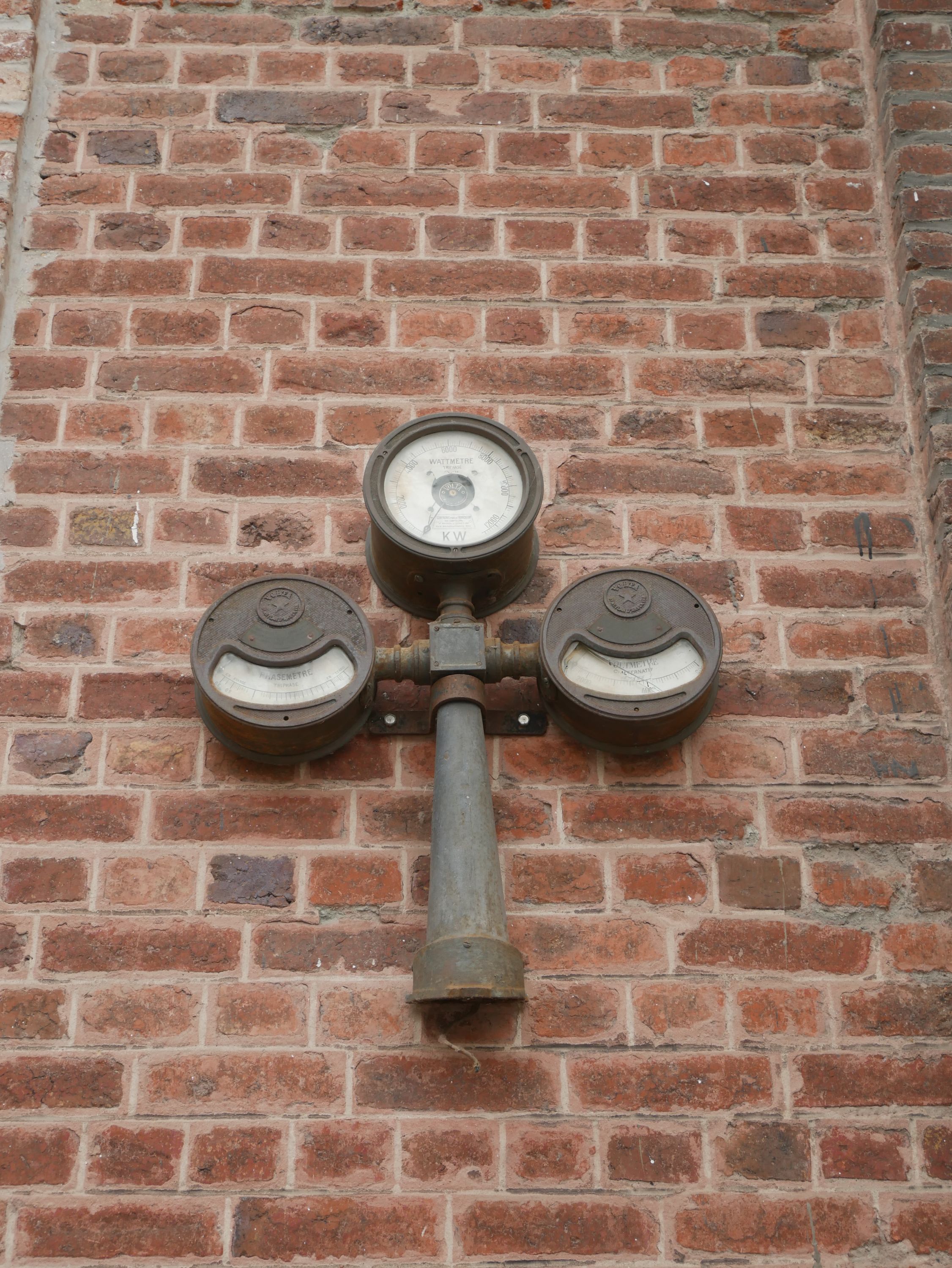 Cadran d'un phasemètre réuni avec celui d'un wattmètre et celui d'un volmètre sur un même support.