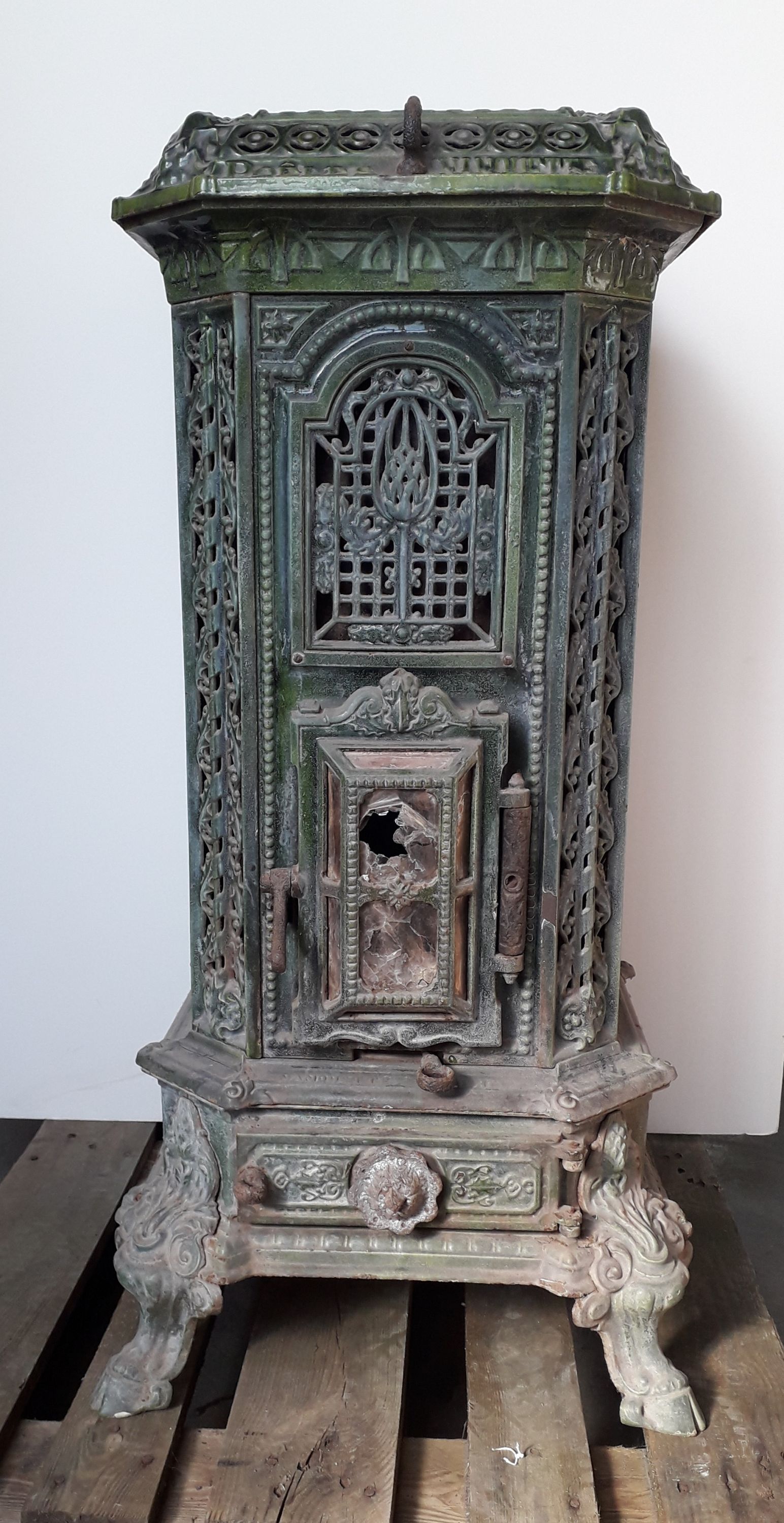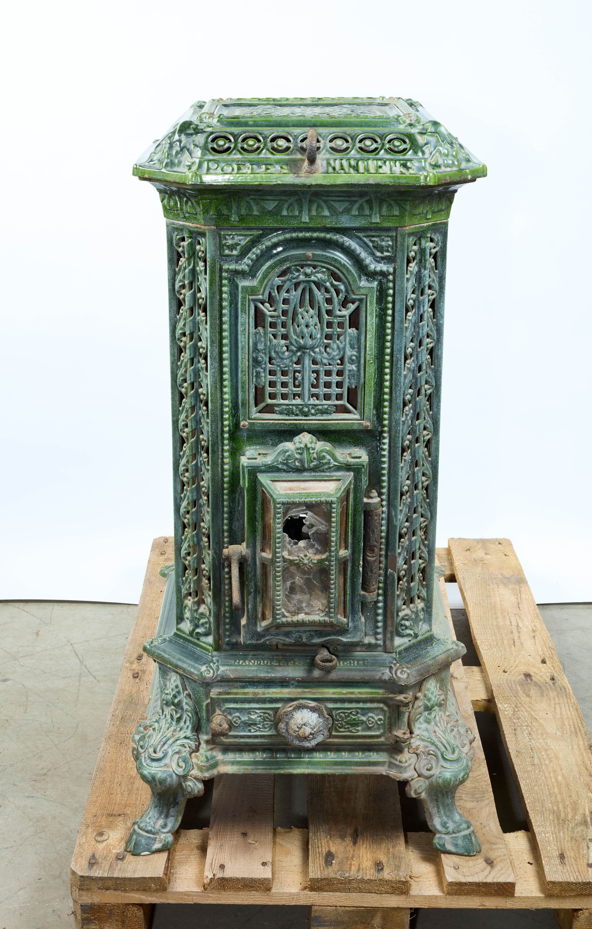 Poêle de section carrée en métal émaillé vert à décor ajouré avec deux portes en façade.