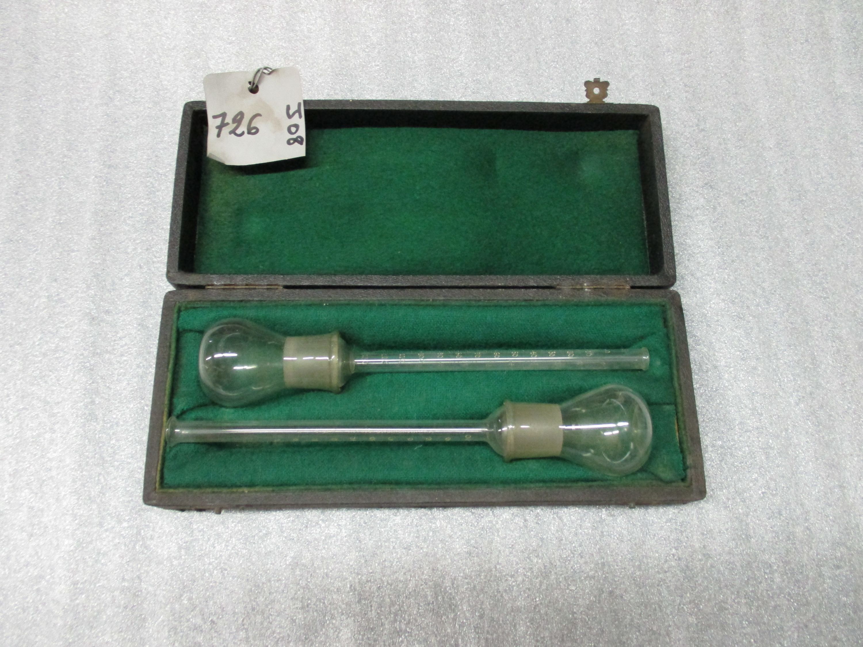 Voluménomètre de Taffanel dans son coffret composé de deux ampoules en verre avec chacune un tube gradué.