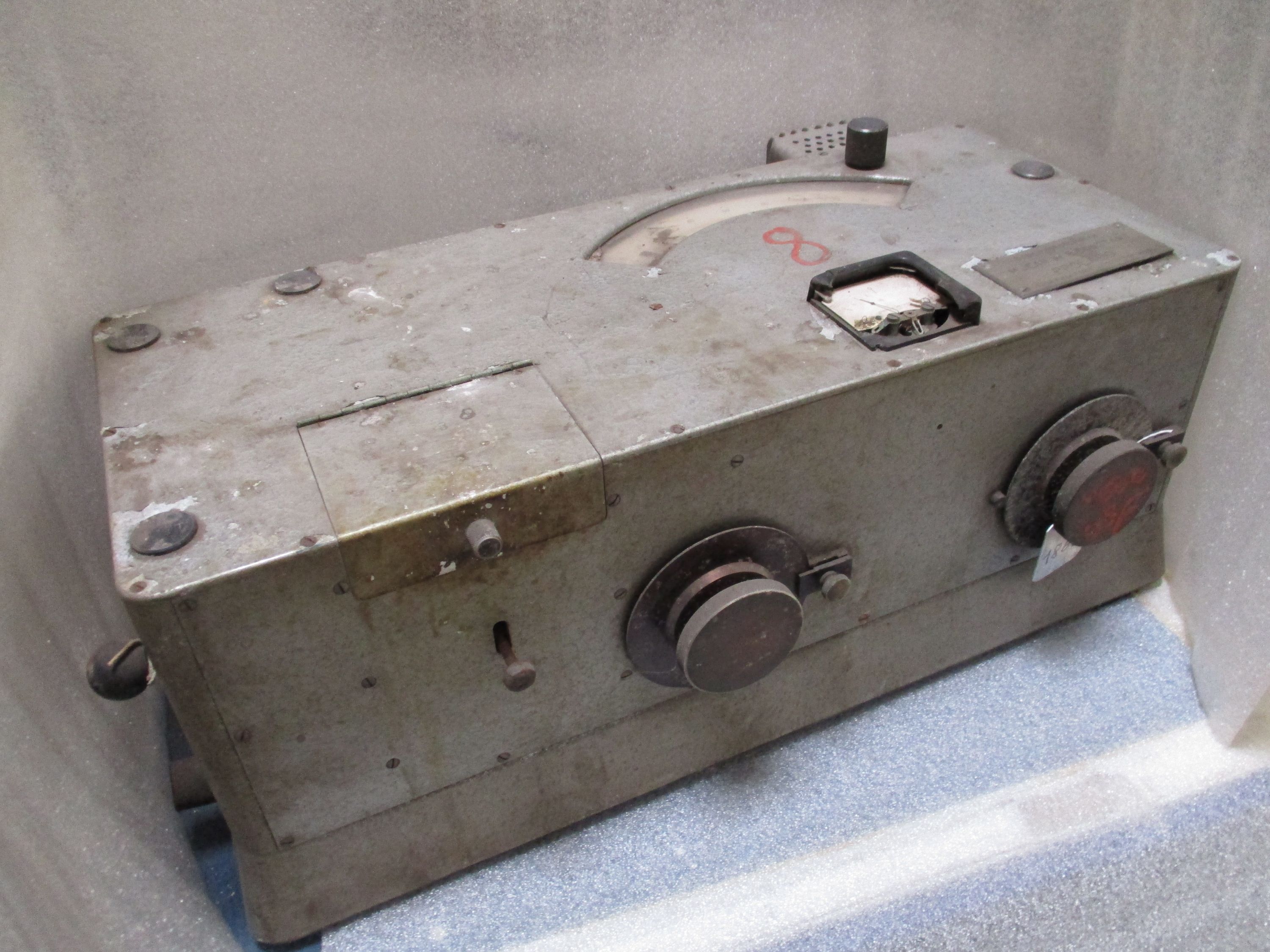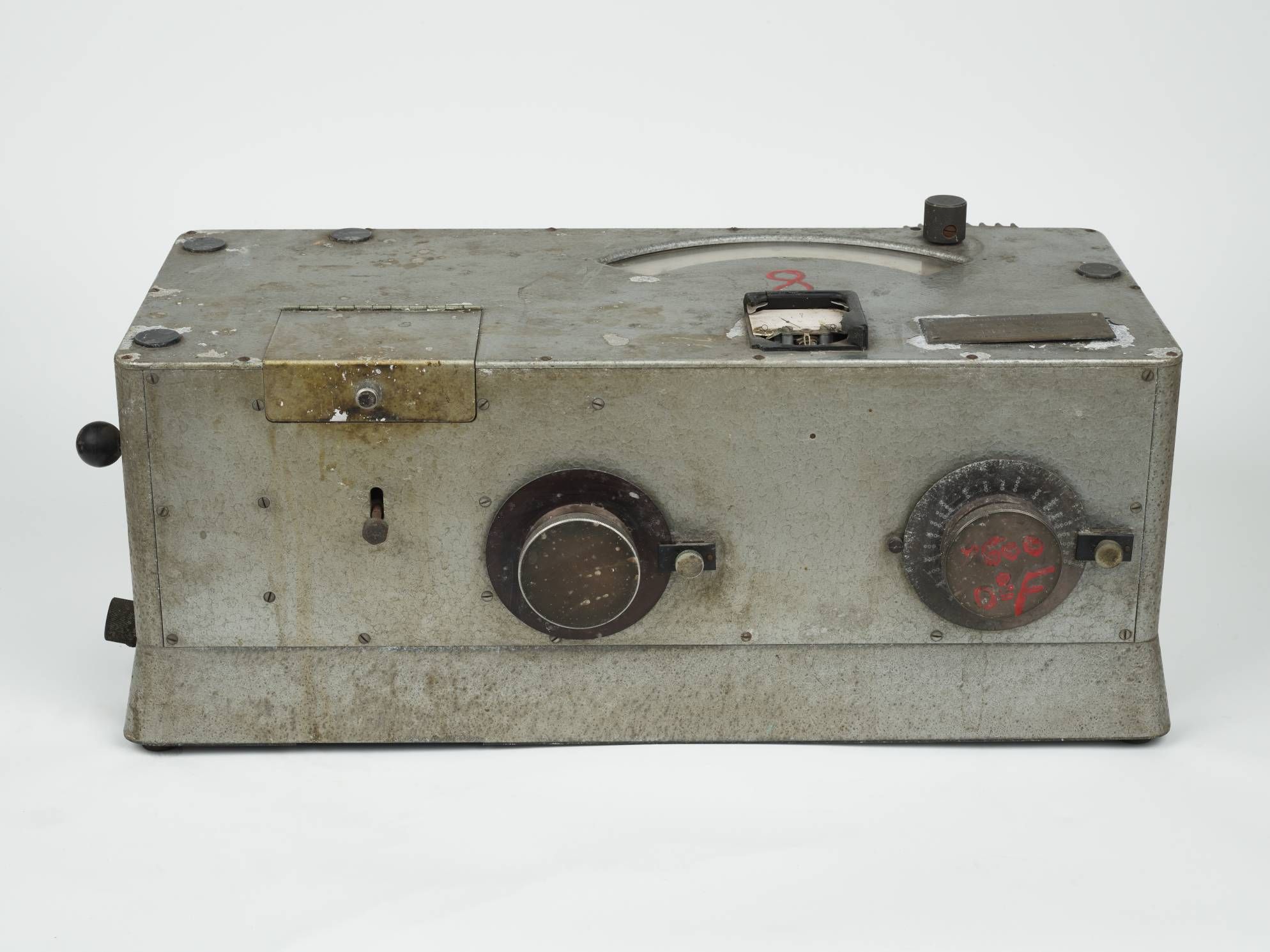 Spectrophotomètre composé d'un boîtier rectangulaire en tôle émaillée argentée avec des boutons et un cadran gradué.