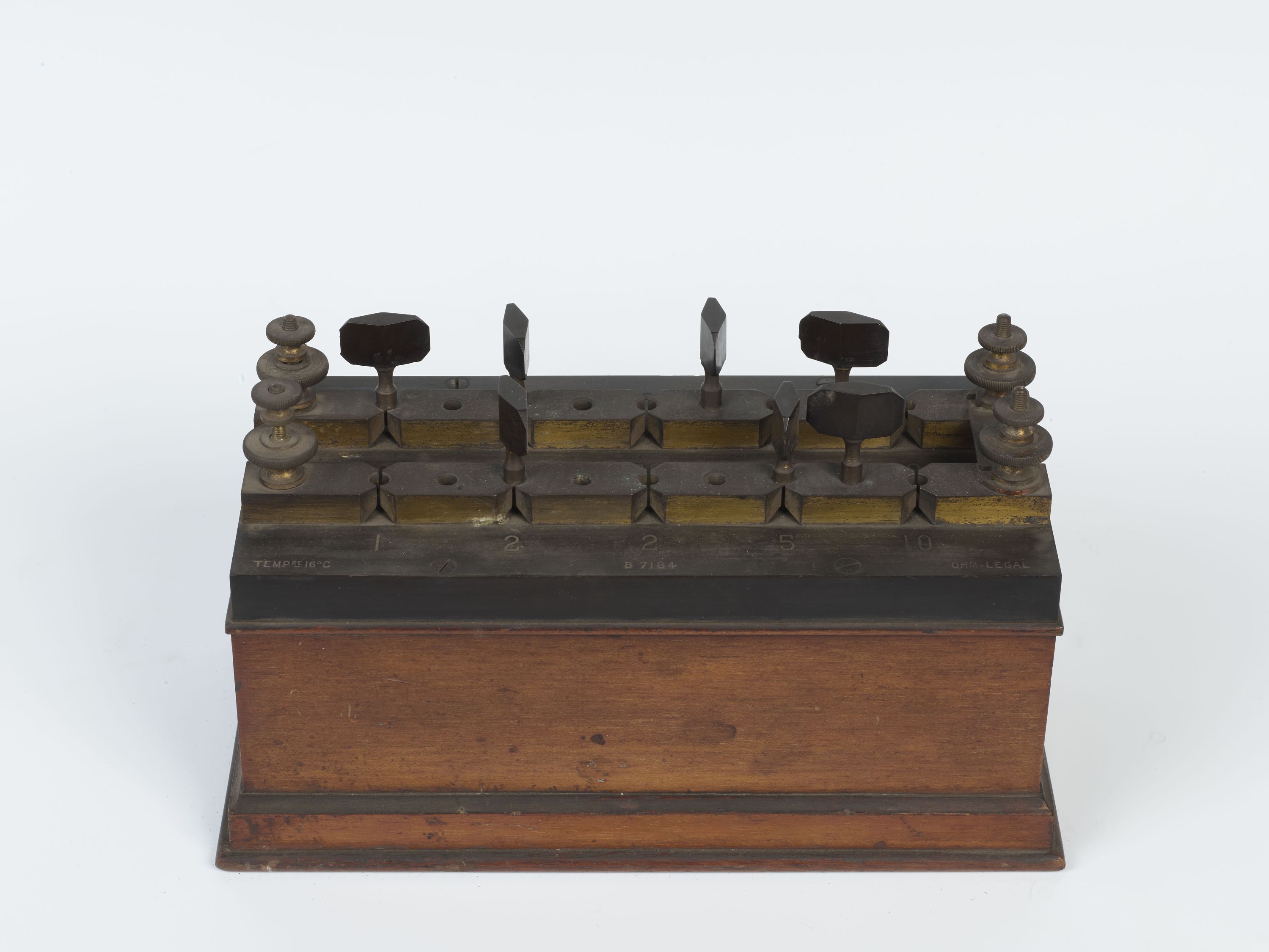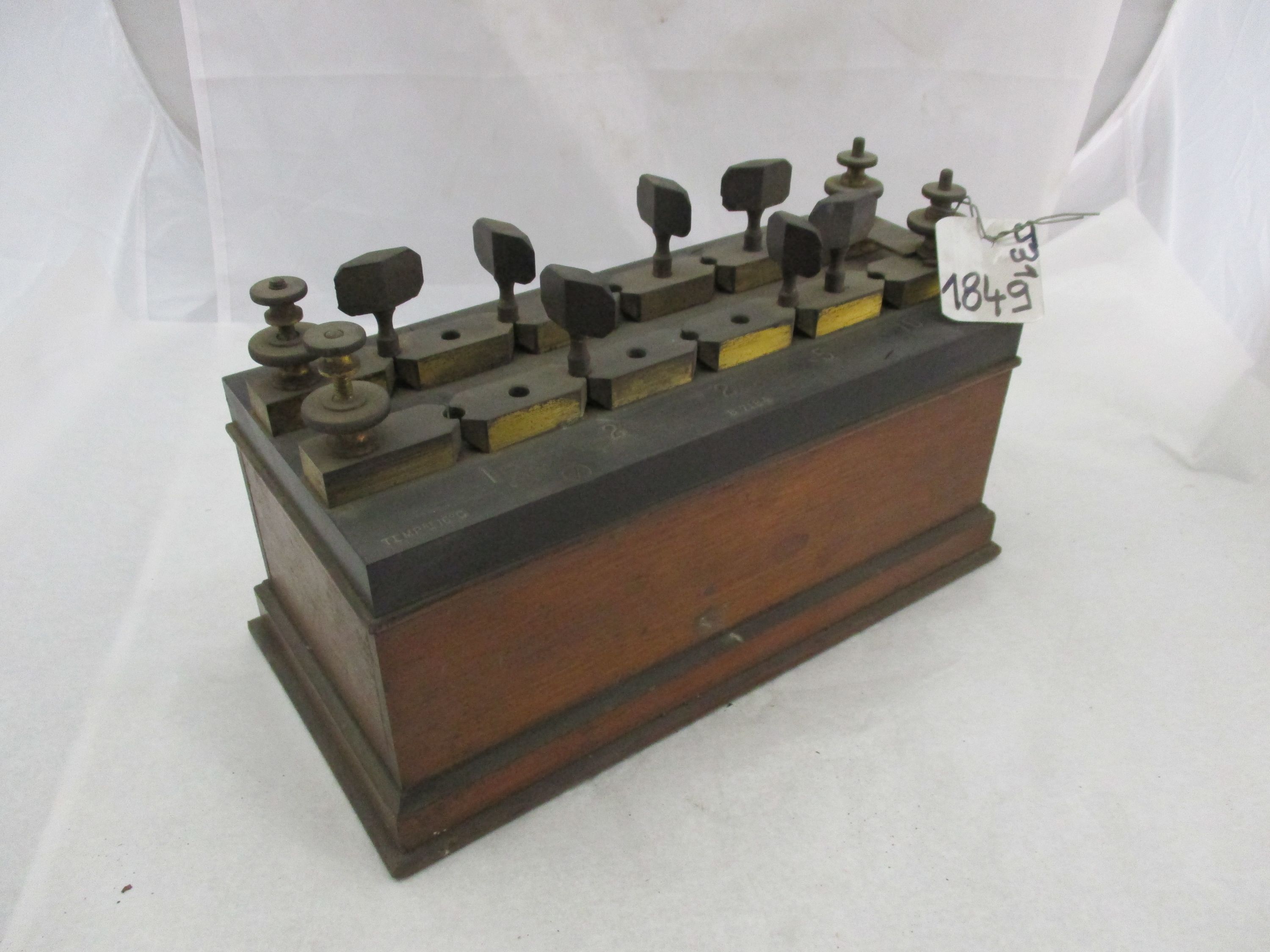 Appareil à shunter composé d'un coffret en bois avec des molettes de branchement sur le dessus.