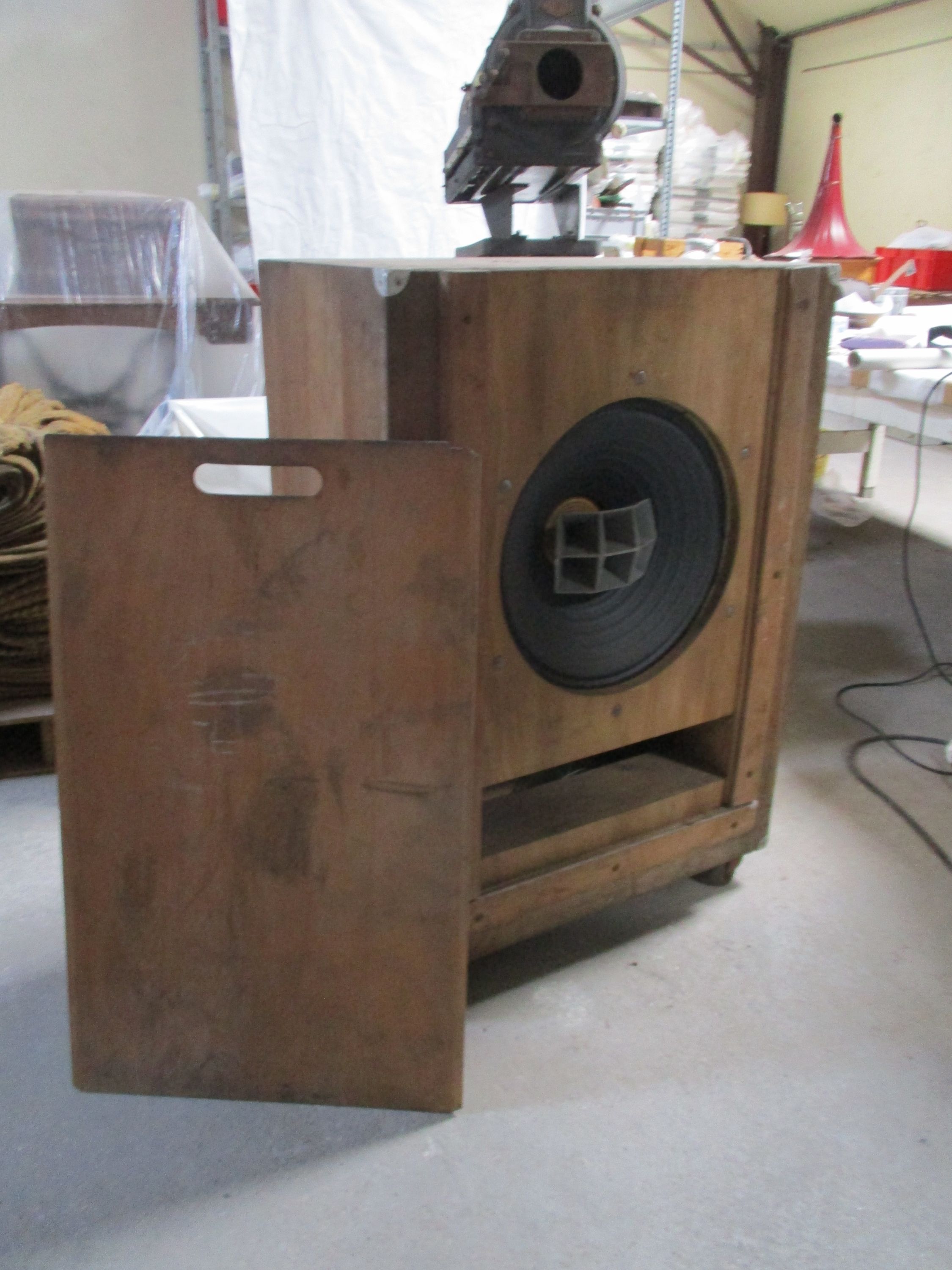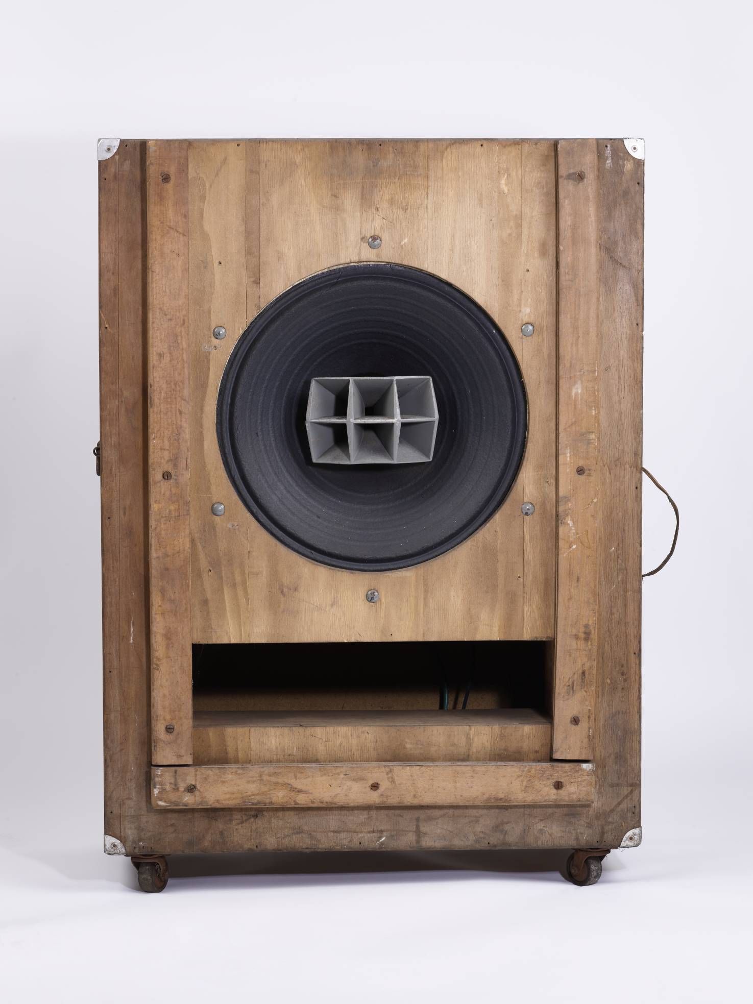Haut-parleur dans un caisson en bois à roulettes et protégé par un volet coulissant.