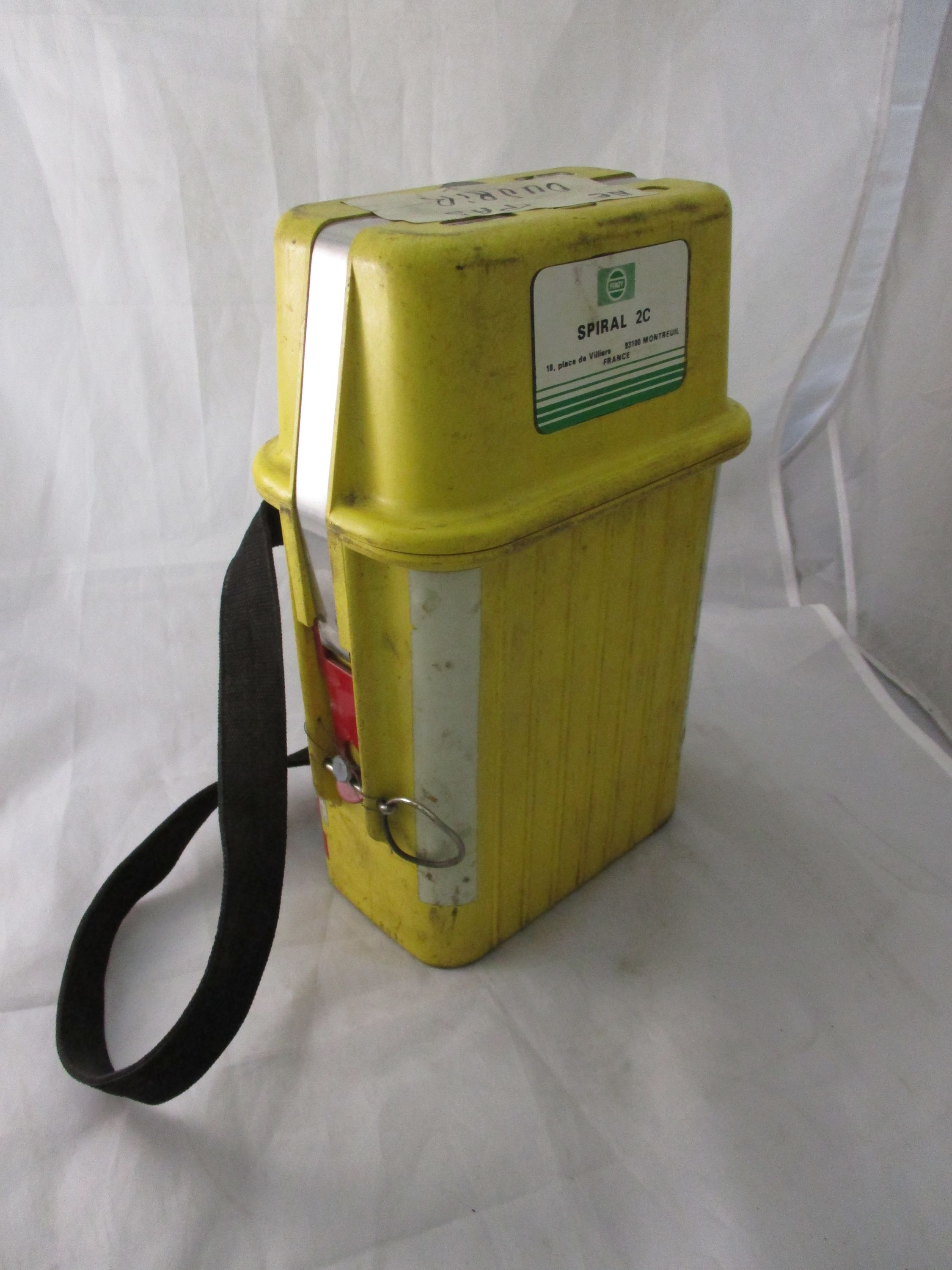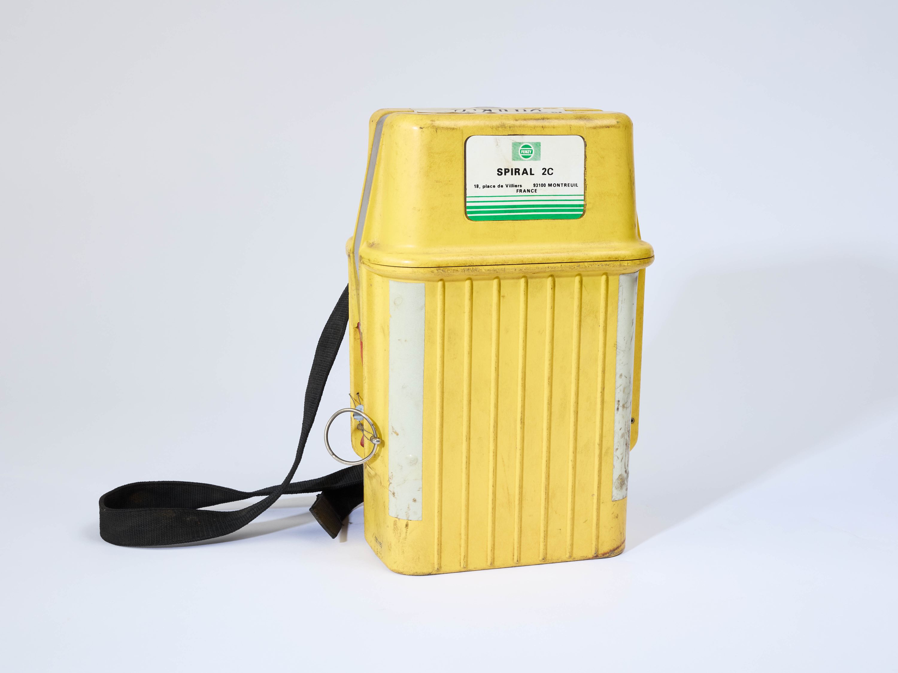 Appareil respiratoire de secours Spiral 2 dans un boitier en plastique jaune scellé.