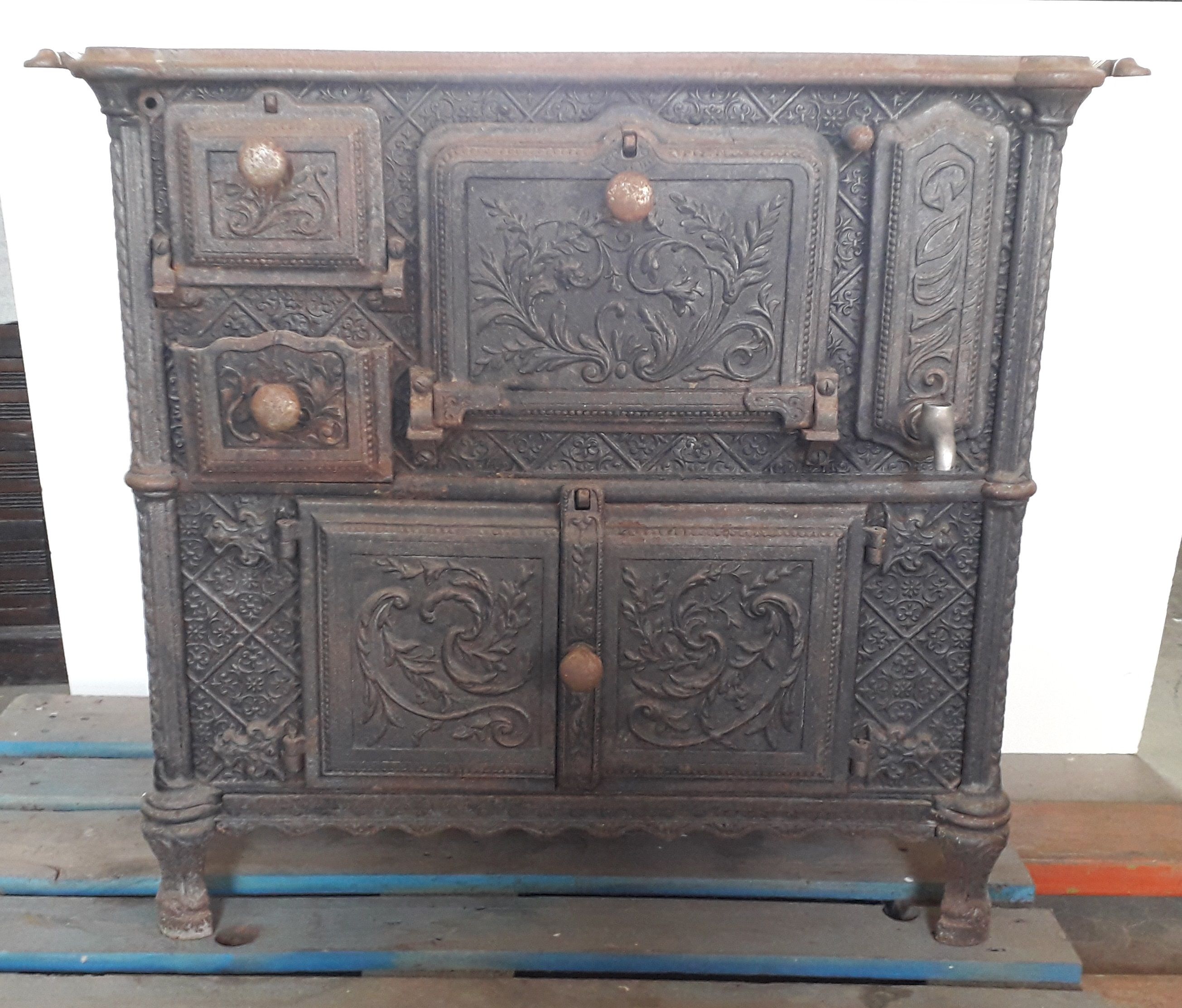 Cuisinière de forme rectangulaire avec quatre feux, deux couvercles sur le plateau, en façade trois portes, un tiroir et un robinet, et une porte sur le côté gauche. La cuisinière porte un décor végétal.