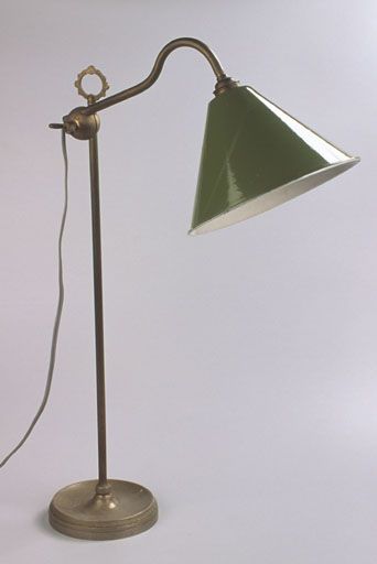 Lampe de bureau sur un pied métallique avec un abat-jour vert.