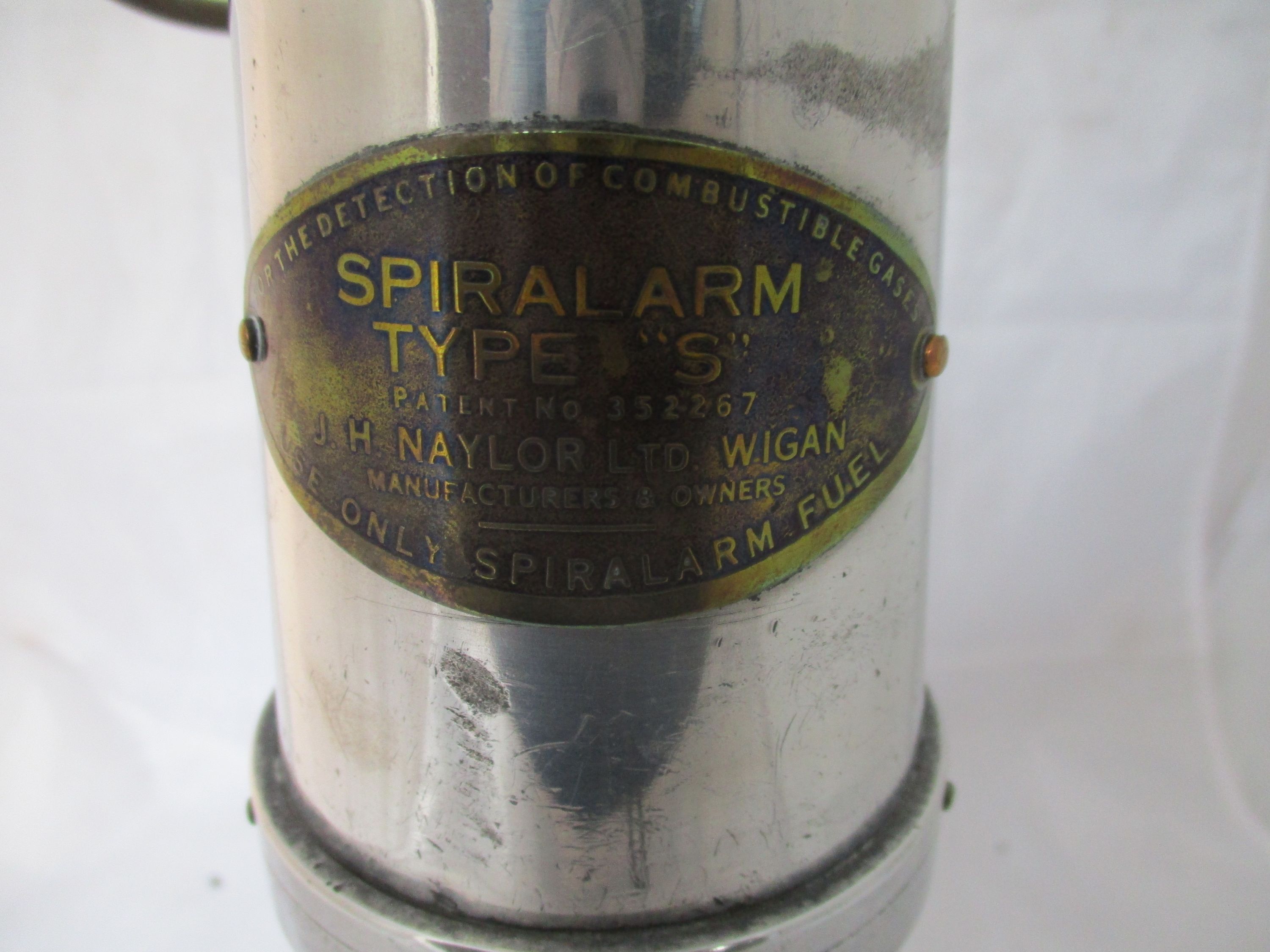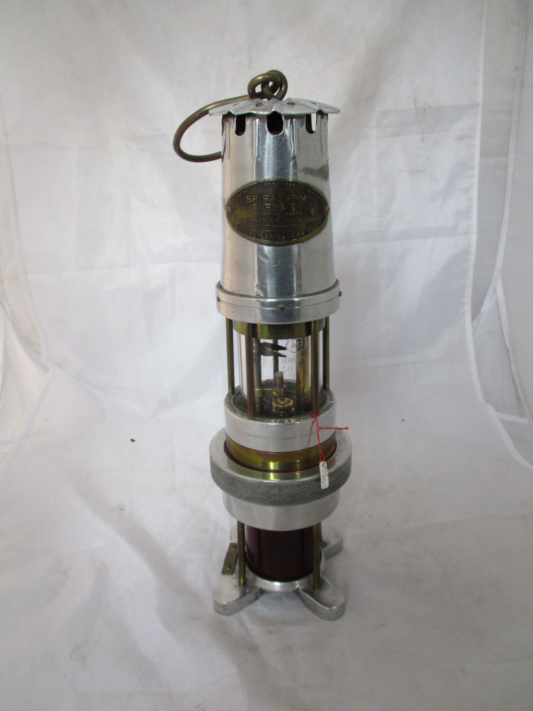 La mèche surmontée d'une spirale métallique qui, se déformant sous l'effet de la chaleur, établissait un contact électrique mettant en service une ampoule électrique de 2,5 volts placée sous le reservoir. Cette dernière était entourée d'un verre rouge protégé par 4 montants de laiton. L'appareil permettait de signaler des teneurs en grisou comprises entre 1,25 et 2,5 %.