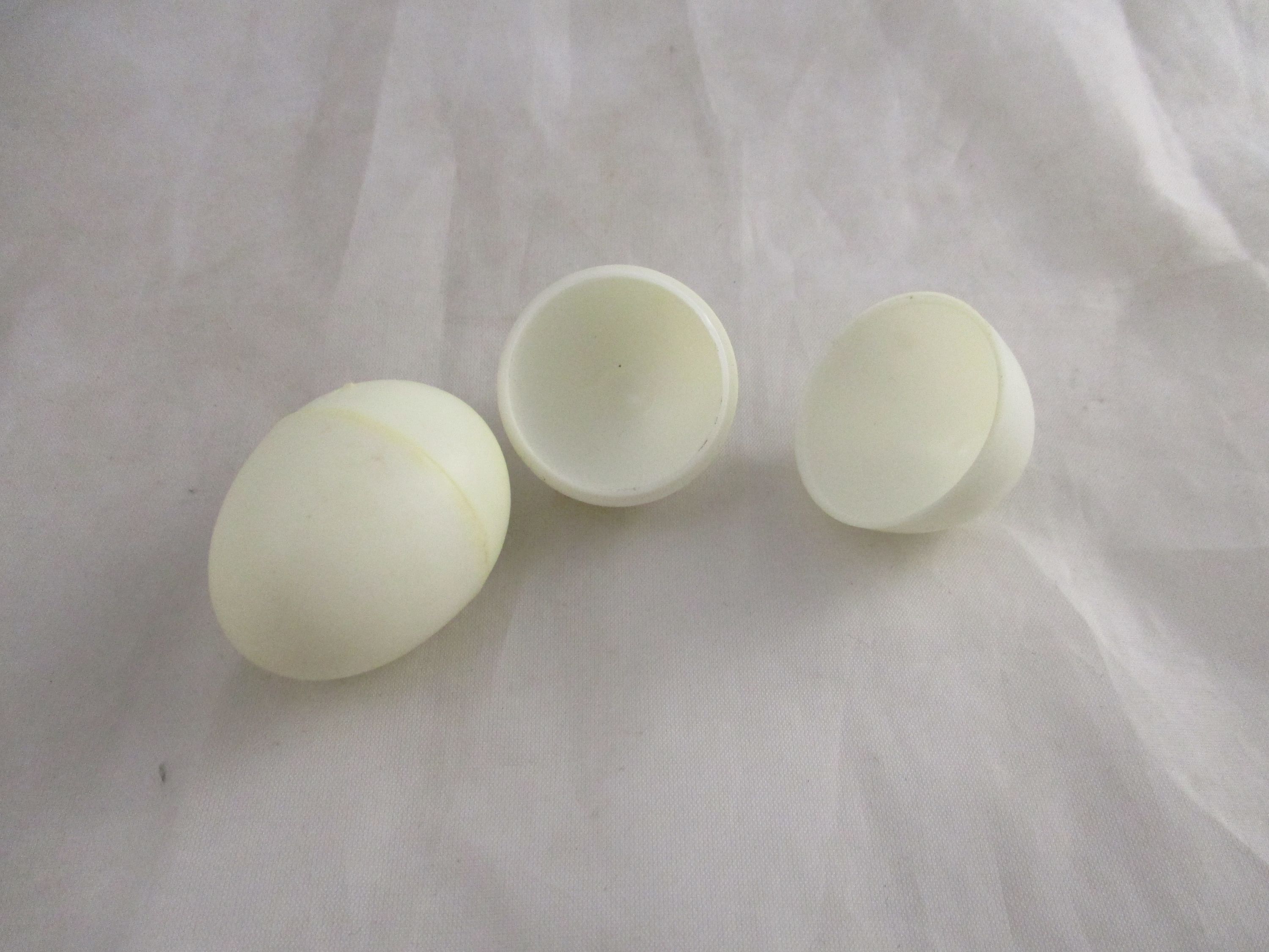 Lot de deux oeufs de pigeons en plastique blanc. Chaque oeuf s'ouvre en deux.