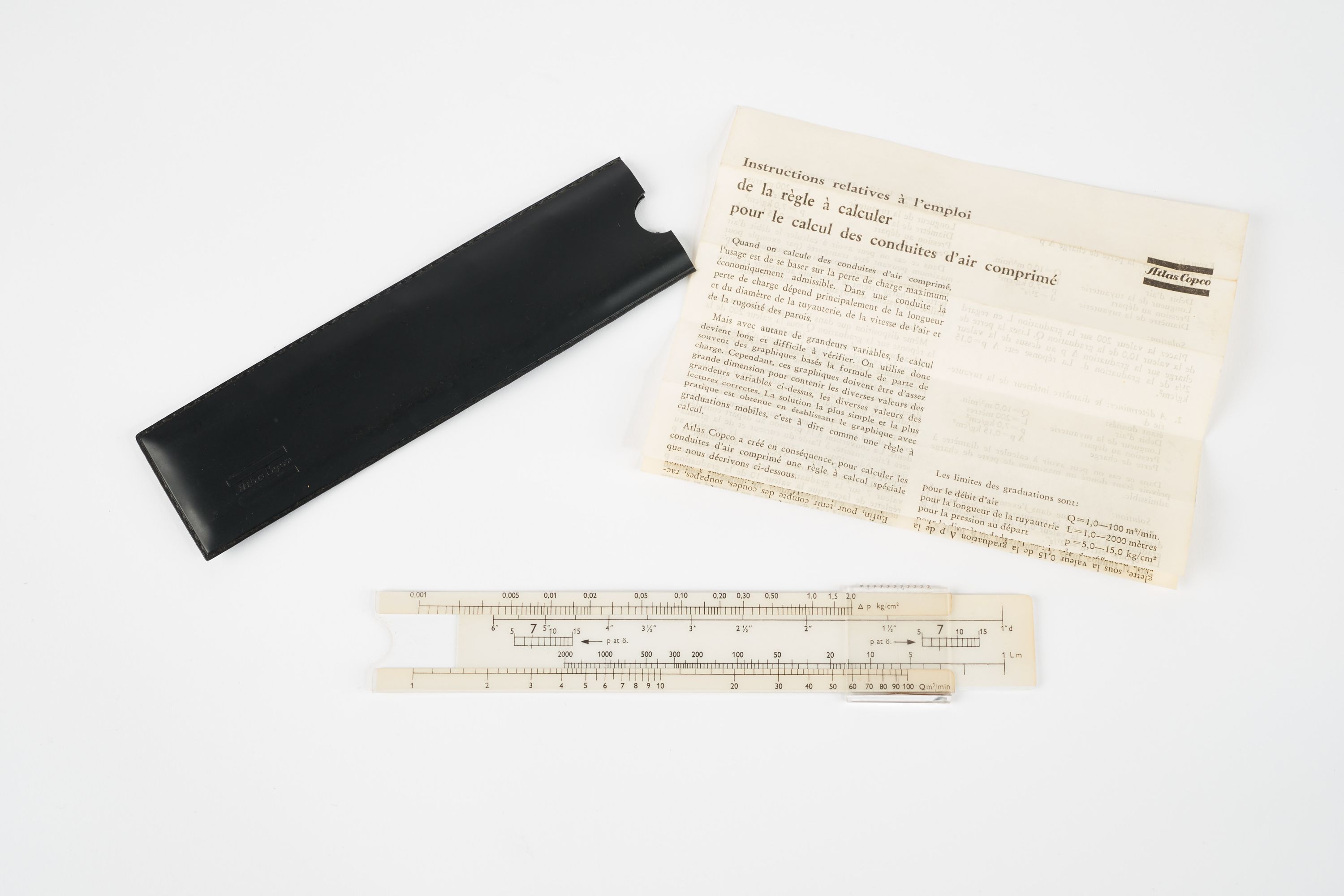 Règle composée de deux parties qui coulissent l'une sur l'autre, d'un étui et d'une notice mode d'emploi. Cette règle de marque Atlas Copco servait pour le calcul des conduites d'air comprimé.