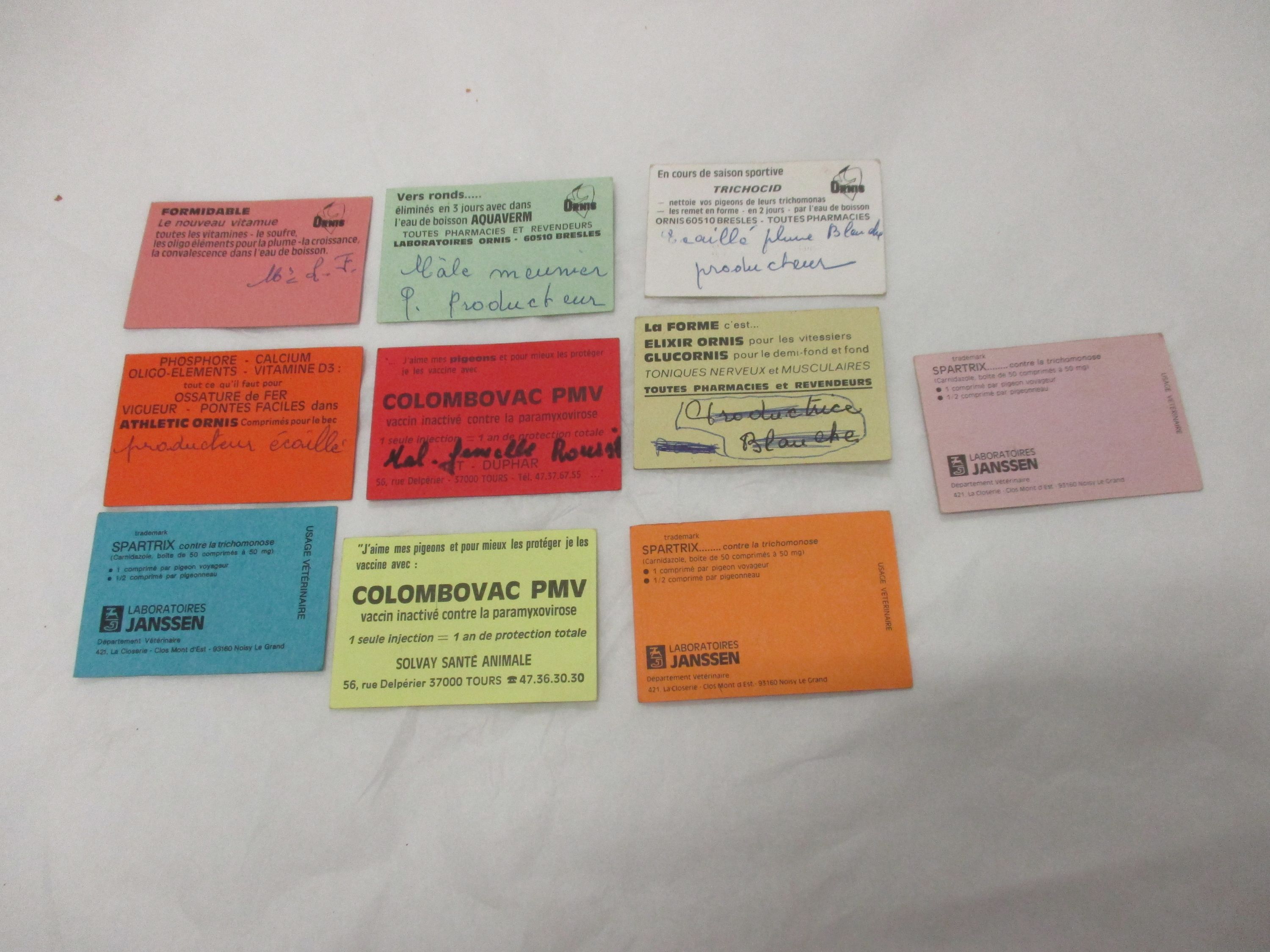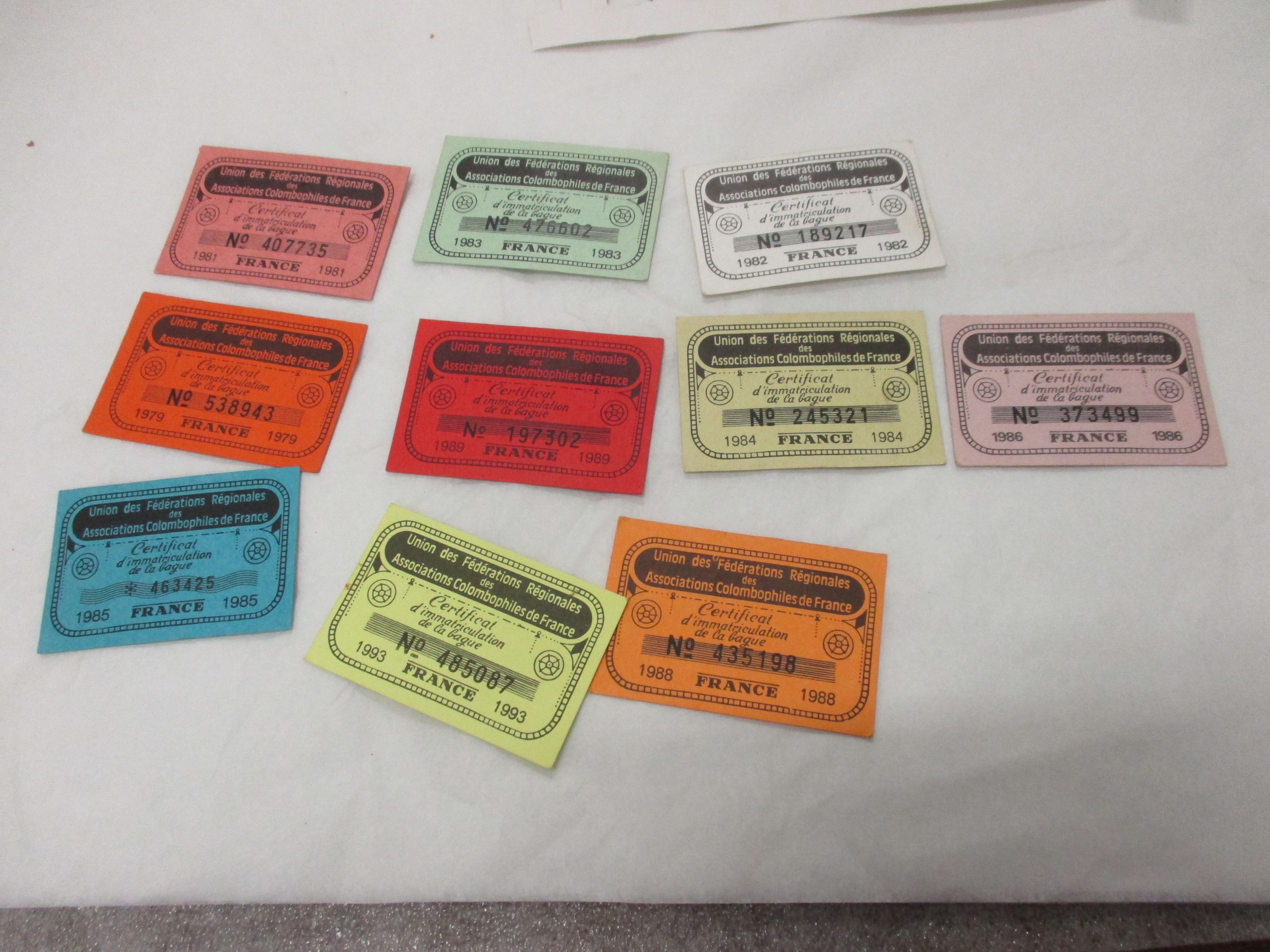Lot de 10 certificats d'immatriculation pour bagues de pigeons voyageurs, de différentes couleurs.