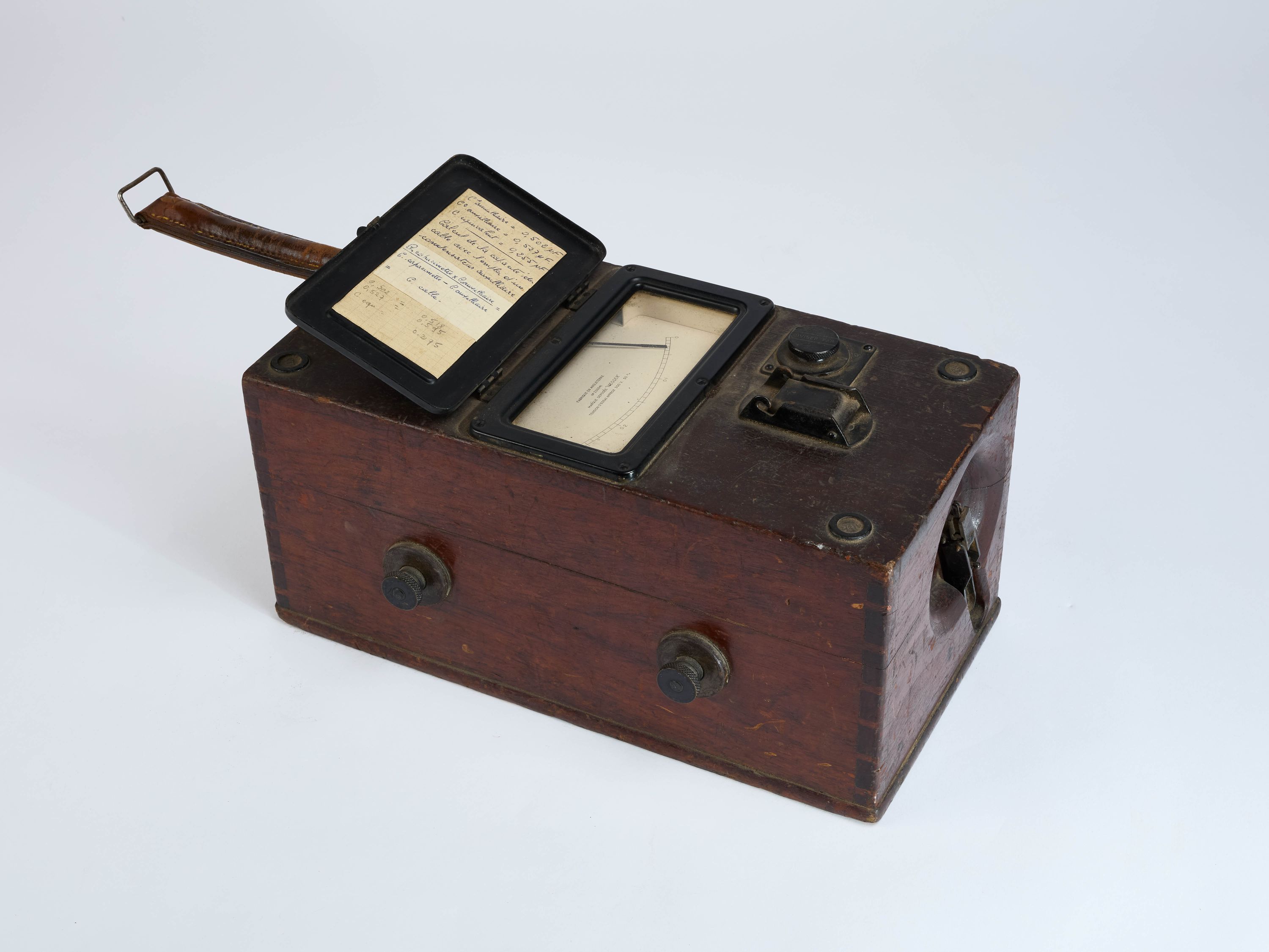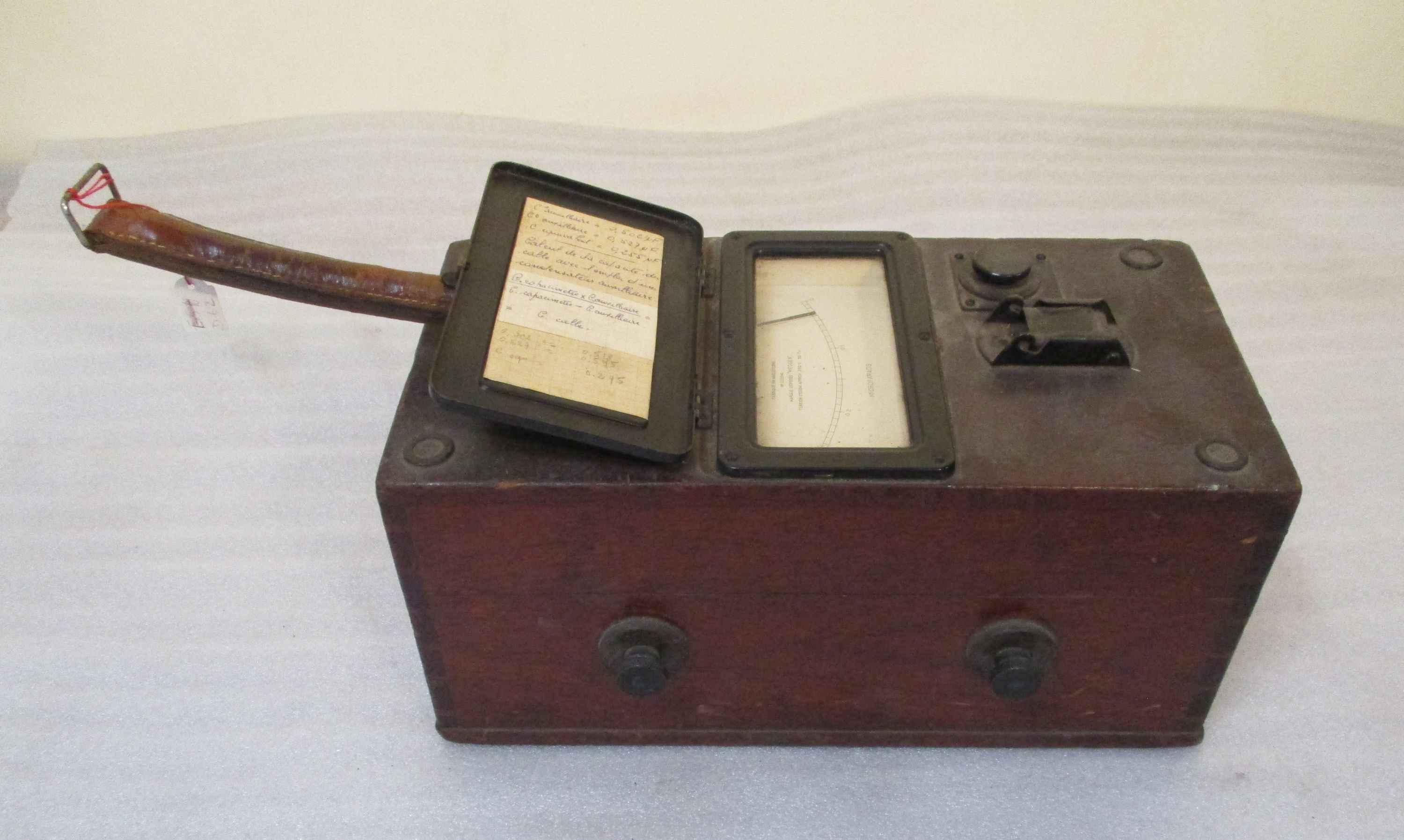 Capacimètre "Megger" composé d'un coffret en bois avec un cadran ggradué en microfarads. Il est de la marque anglaise Everched and Vignoles. Il permet de mesurer la capacité d'un condensateur et à tester la résistance d'isolement d'un câble.