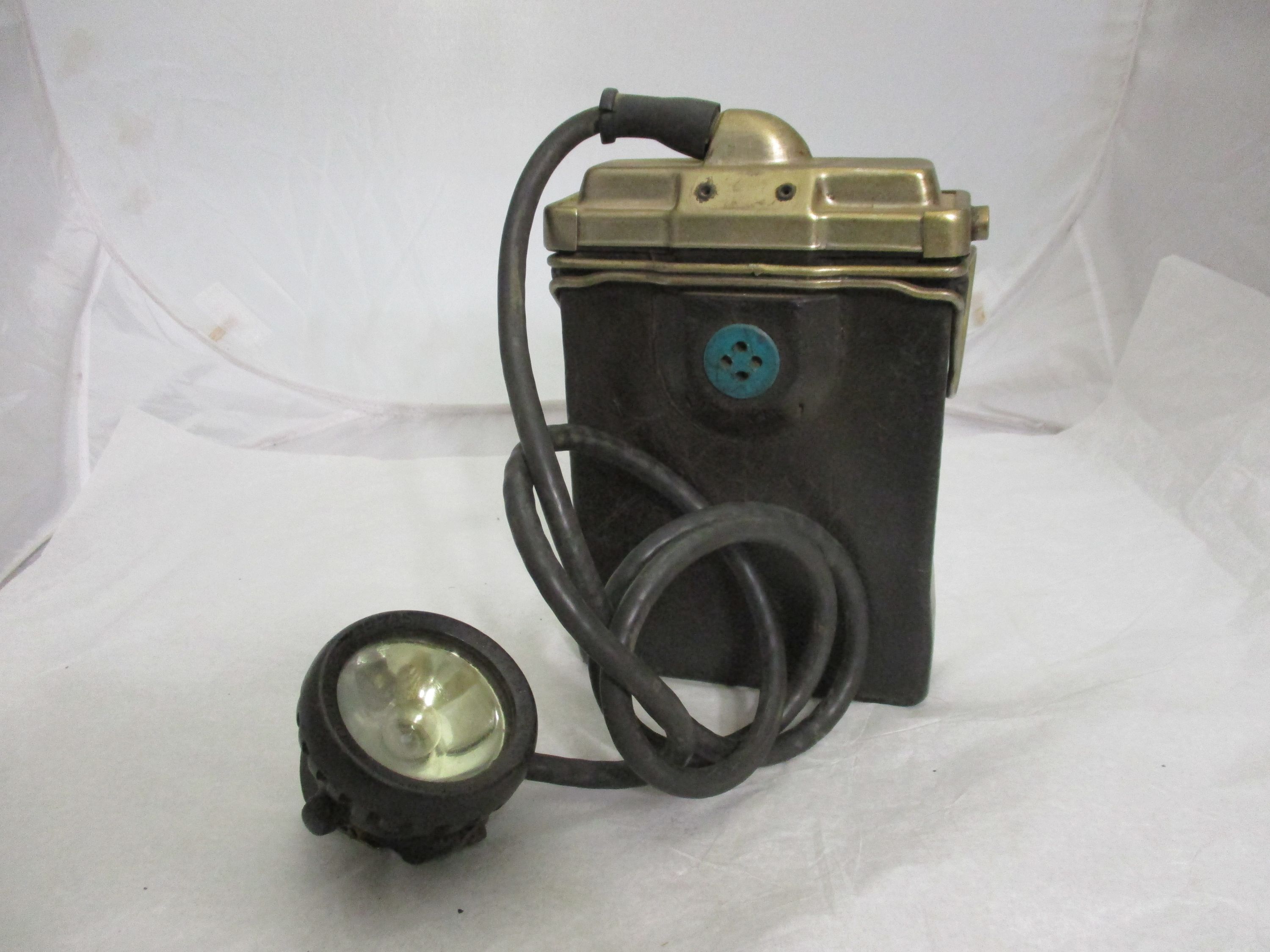 Lampe électrique au chapeau de marque OLDHAM-ARRAS composée d'un accumulateur et d'un phare relié par un flexible.