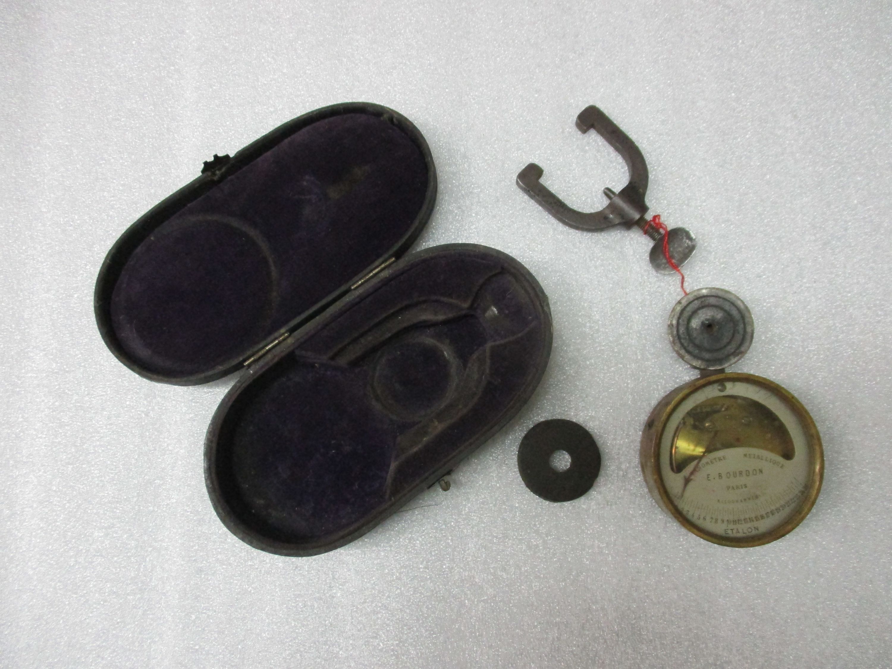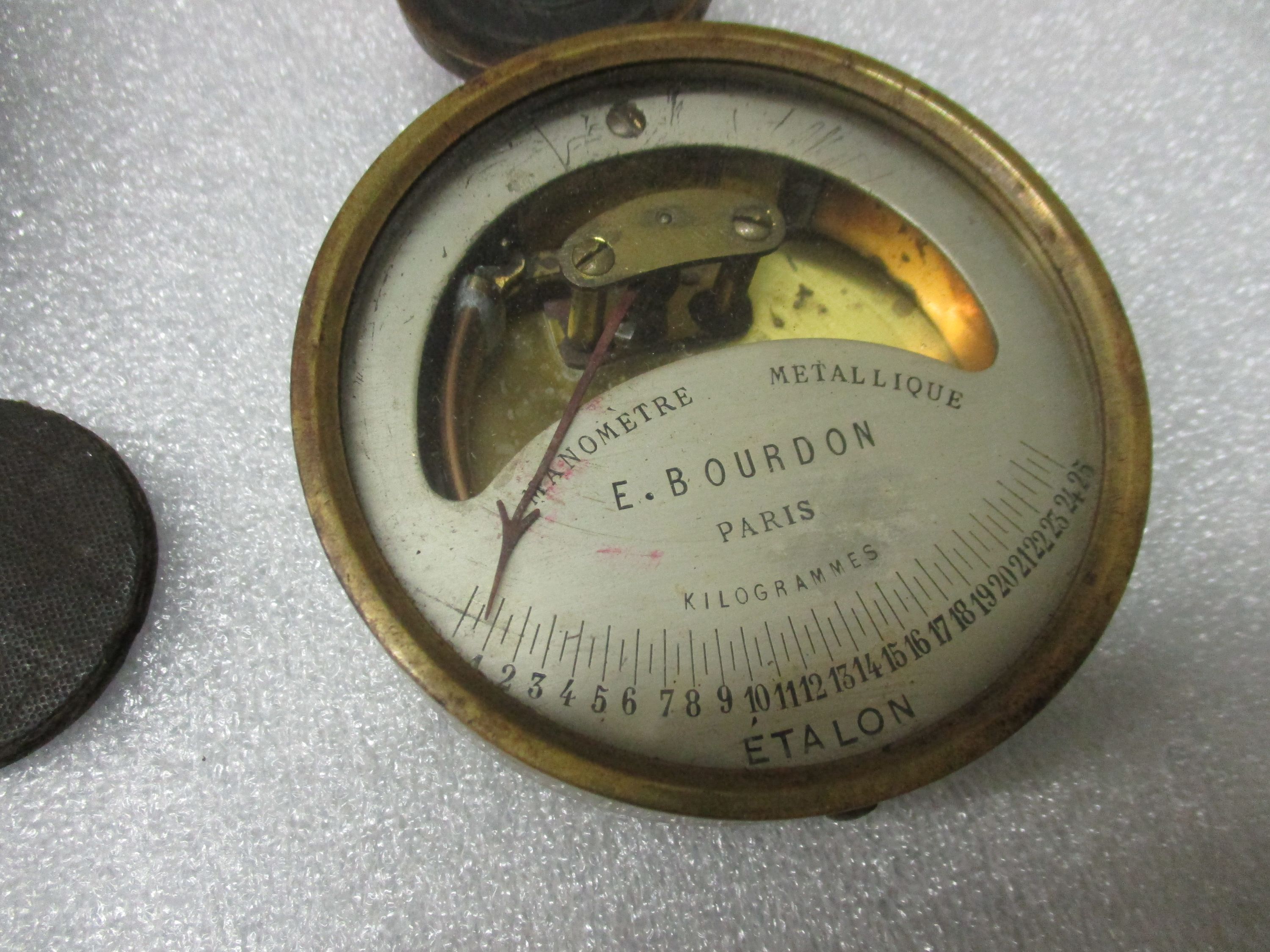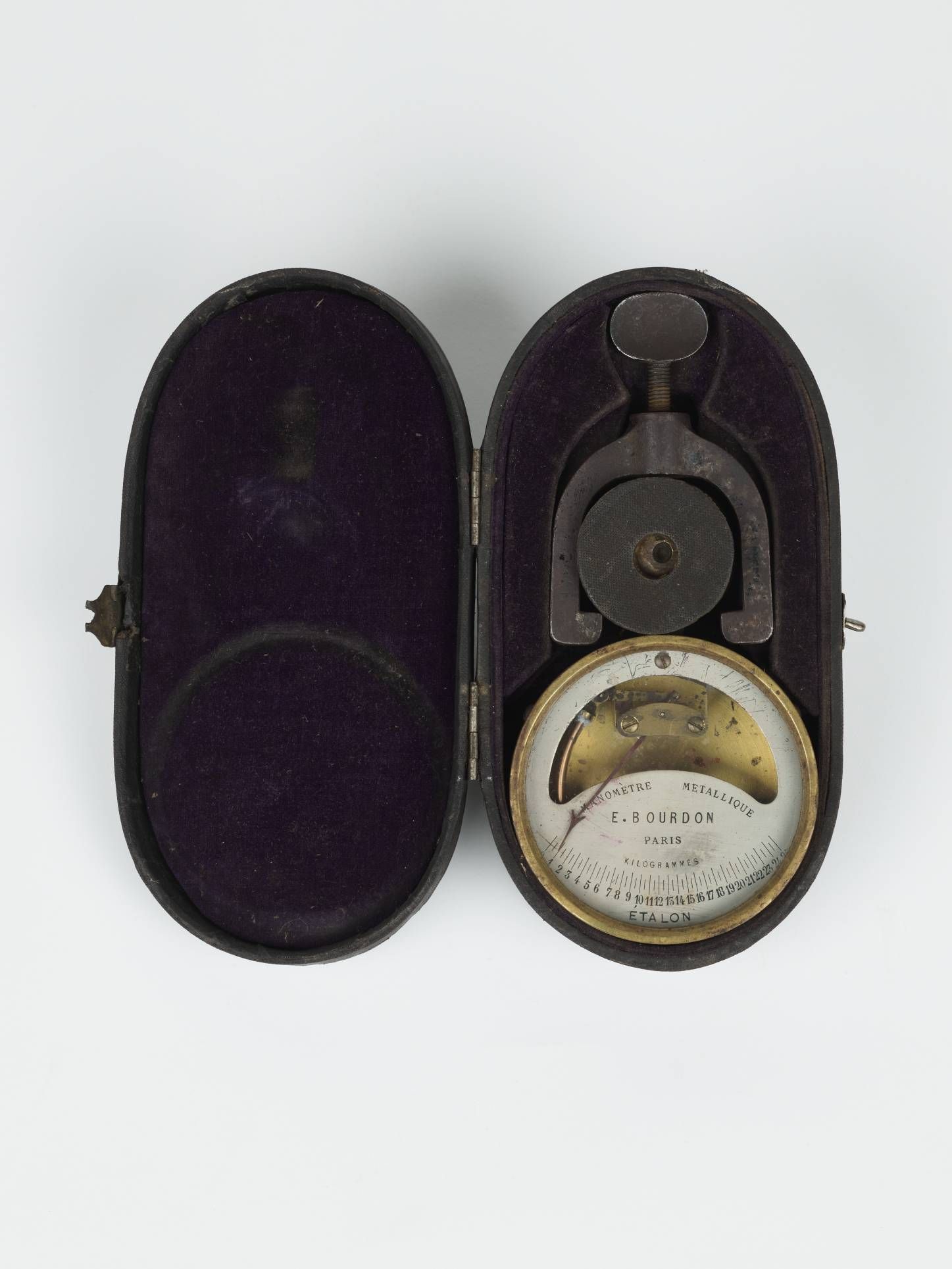 Manomètre anéroïde ou mécanique fabriqué par les ateliers Eugène Bourdon à Paris conservé dans son étui d'origine.