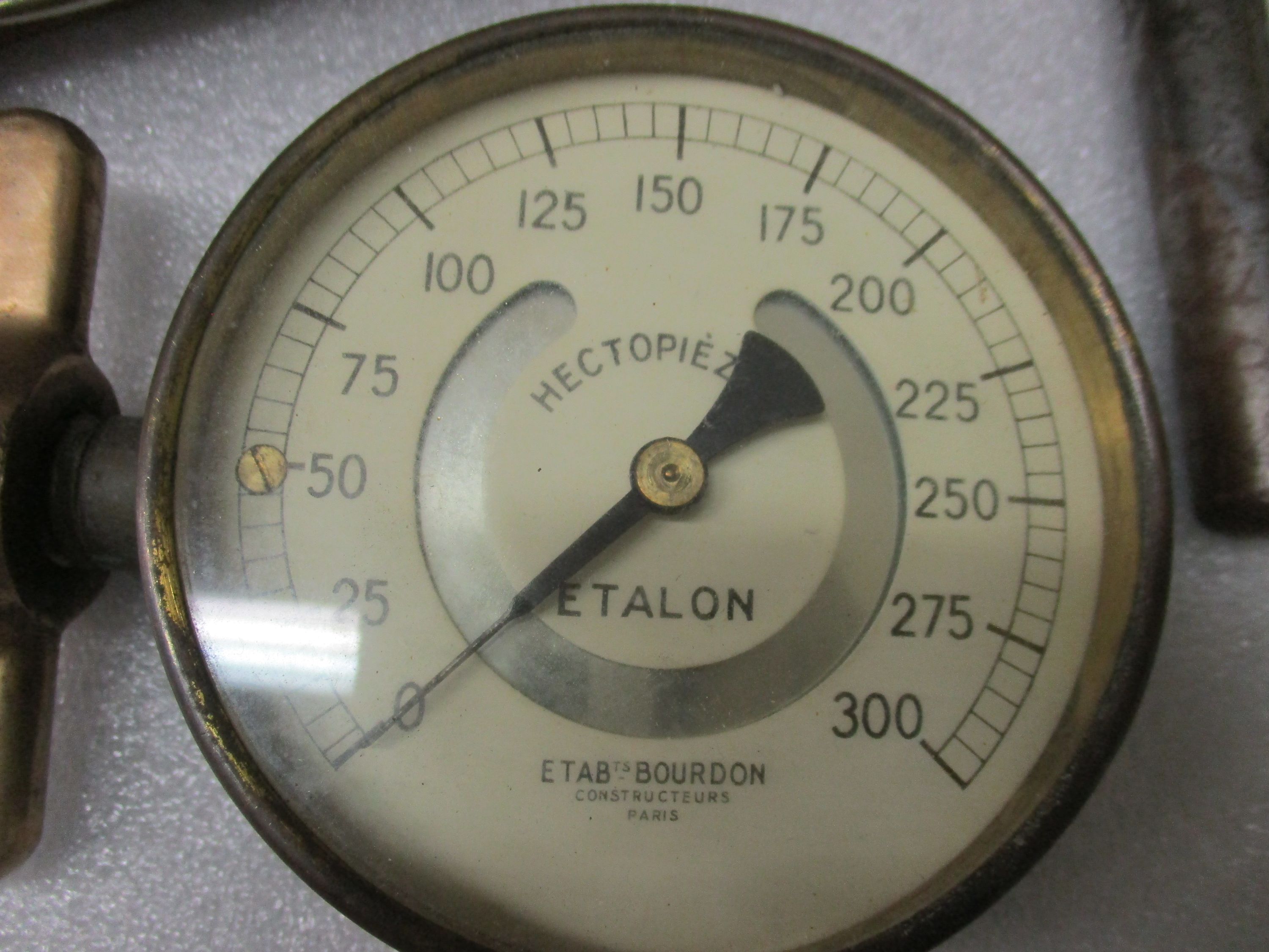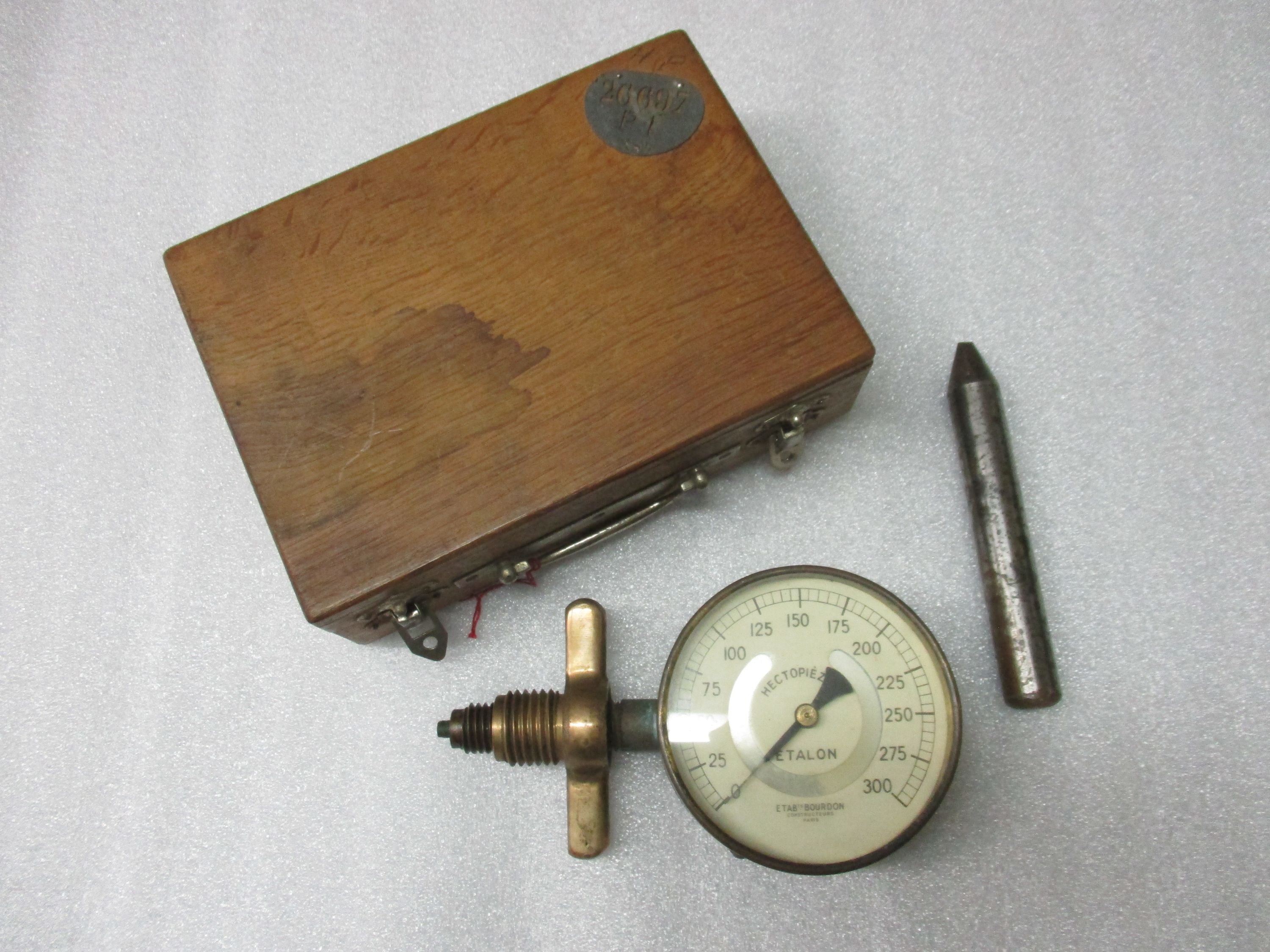 Manomètre fabriqué par les établissements Bourdon à Paris conservé dans son coffret d'origine et avec un plomb servant à maintenir l'appareil en place pendant la prise de mesure.