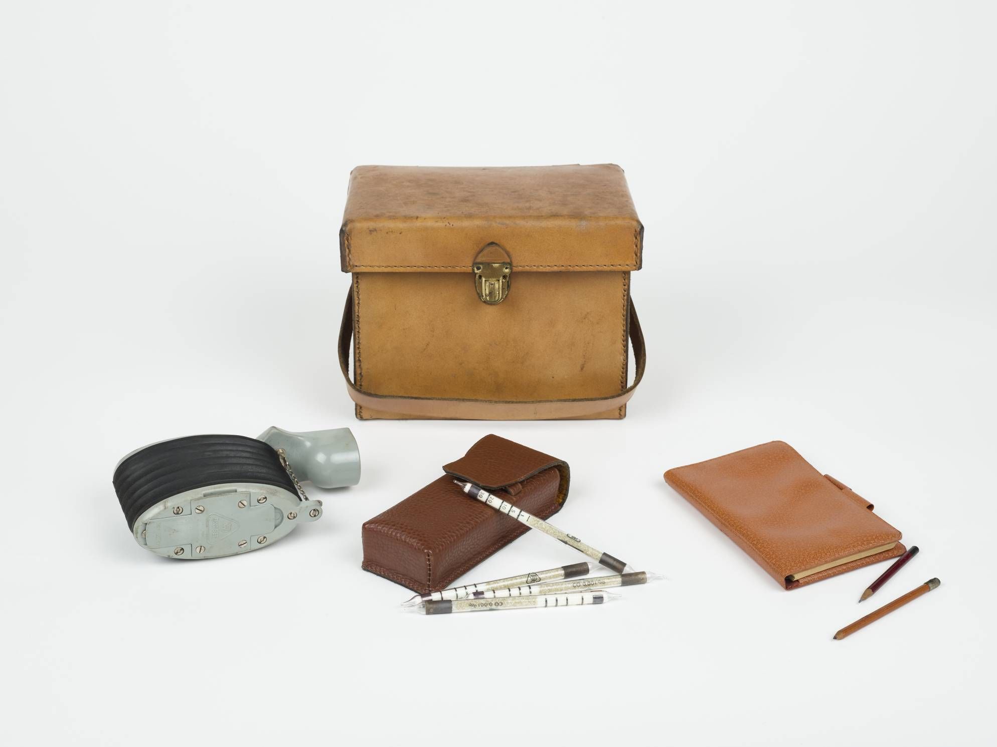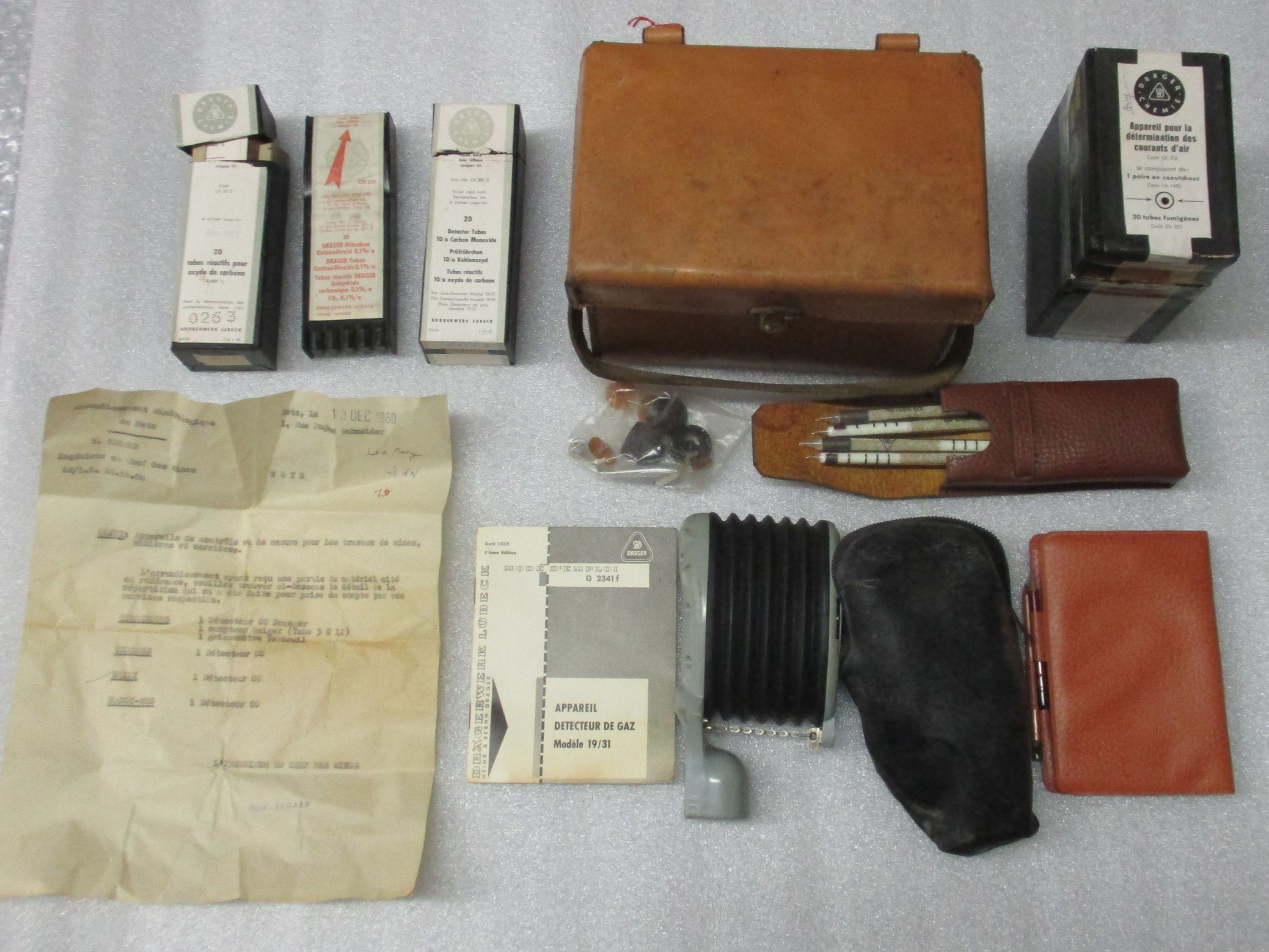 Détecteur de gaz toxiques de la marque DRAGER composé dune pompe à main, de trois boîtes de réactifs, d'une boîte de fumigènes, dune pochette avec des tubes de réactifs, dun mode d'emploi, dun carnet, d'un courrier et dune sacoche.