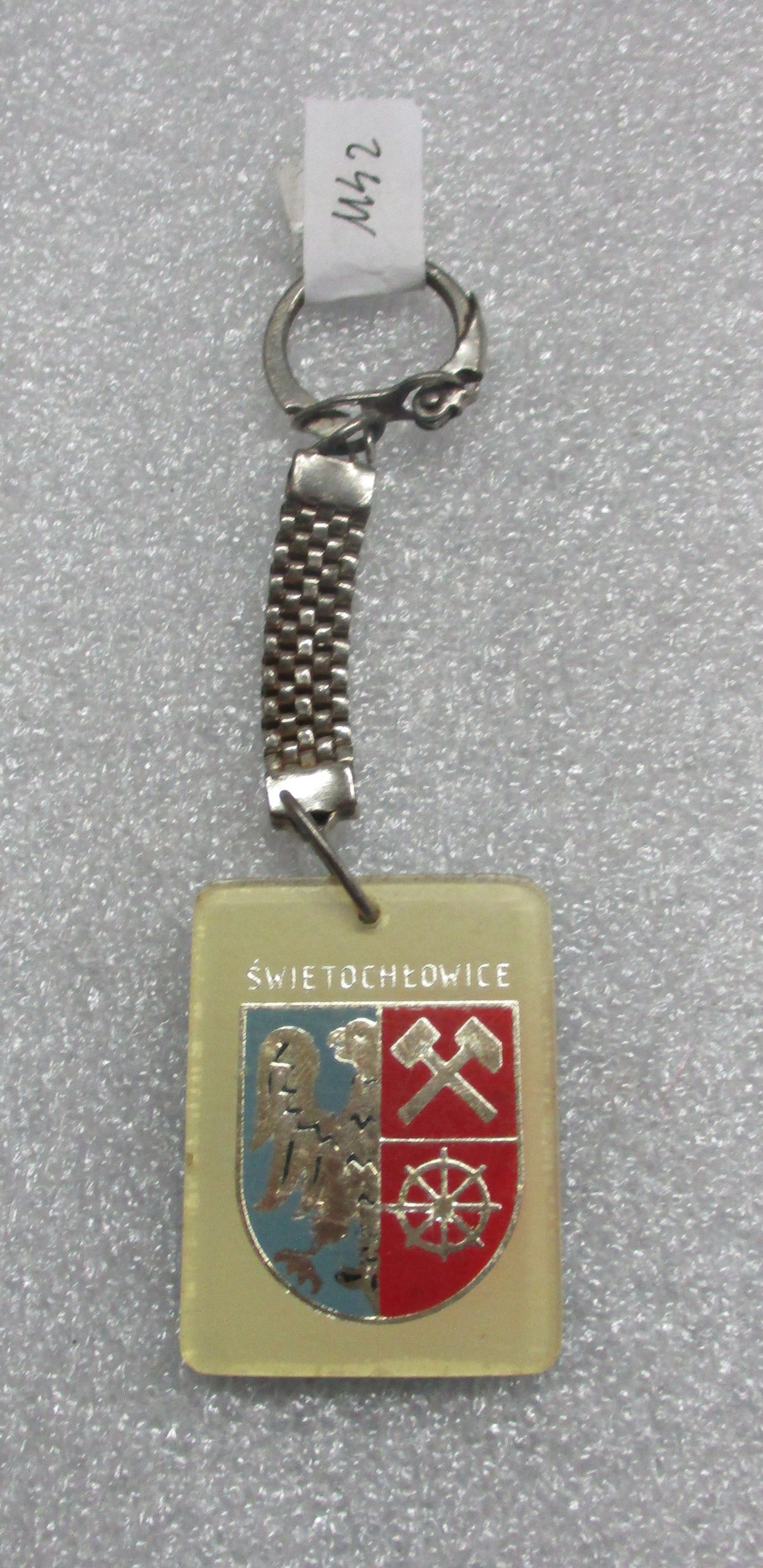 Porte-clefs composé d'un rectangle de plastique et d'un anneau de suspsension. Le blason de la ville polonaise de Swietochlowice est représenté sur une face. Sur l'autre, la date de 1791 apparait sur la silhouette d'un chevalement dont la base est un shako (chapeau à plumes faisant partie de l'uniforme de parade des mineurs polonais).