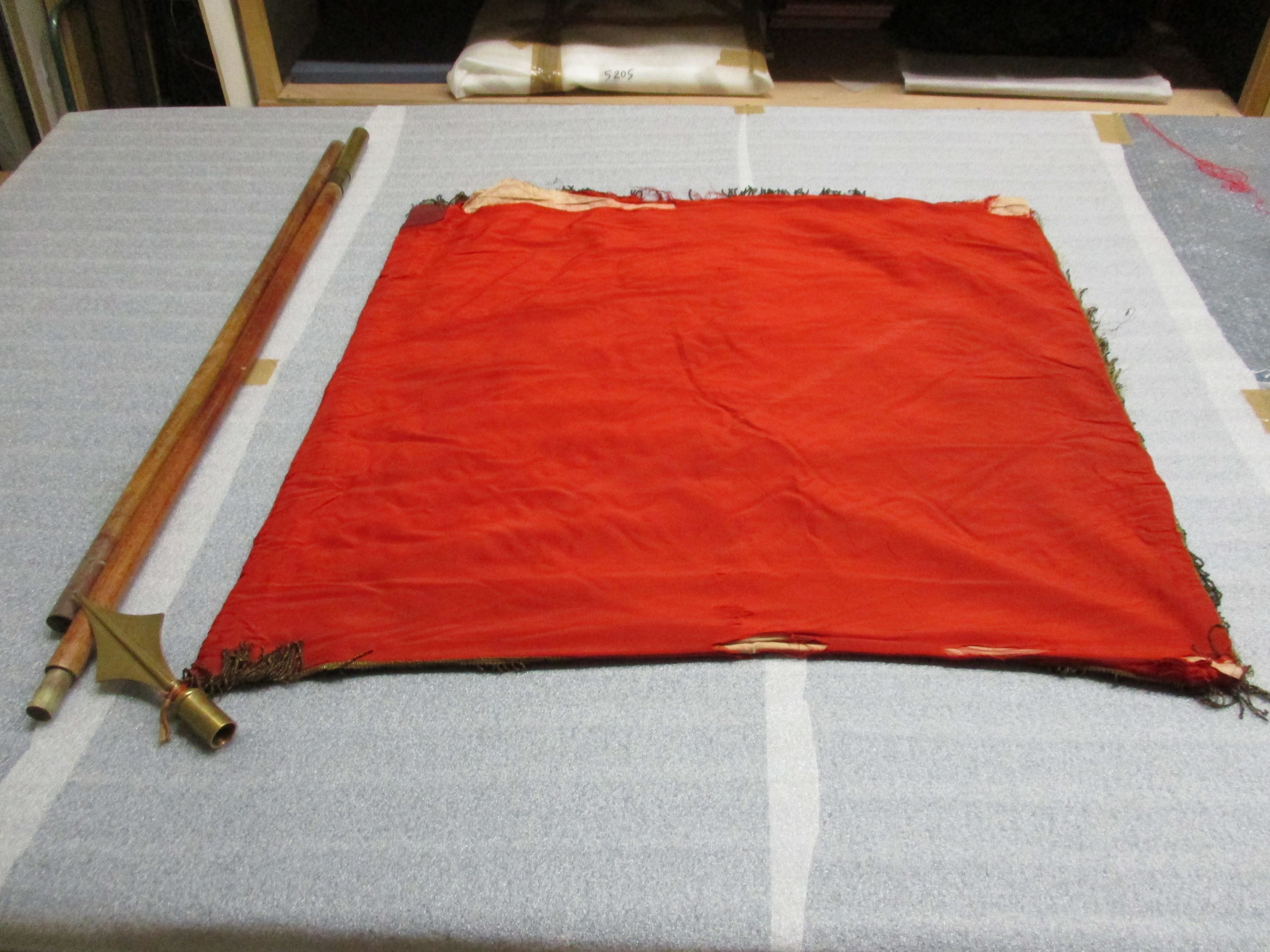 Bannière rectangulaire en soie rouge avec un galon à franges de fils métalliques. L'inscription est brodée. La bannière était fixée à un mât démonté en trois parties dont un pic.