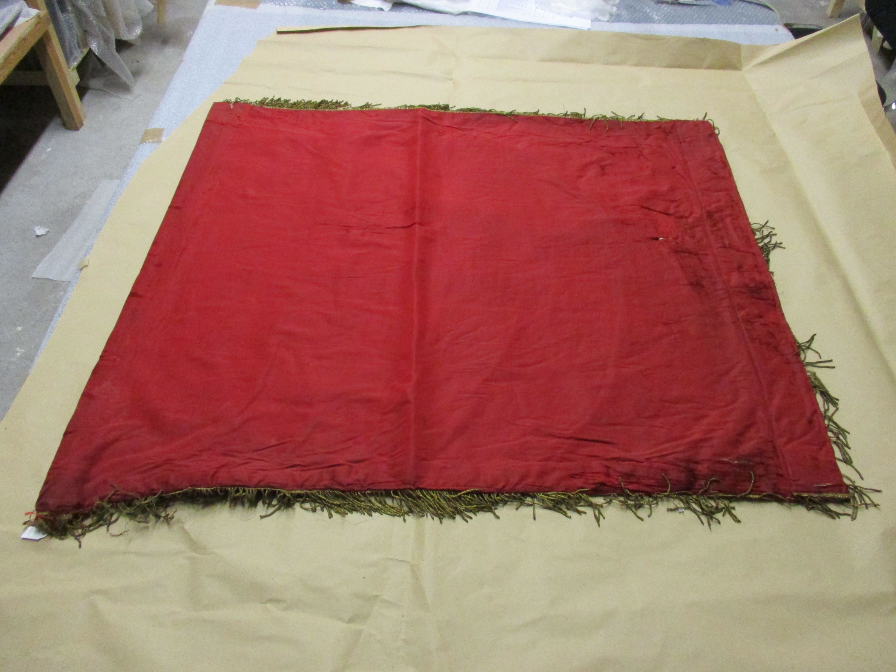 Bannière rectangulaire en soie rouge avec un galon de franges de fils métalliques. Le motif de la poignée de mains et les inscriptions sont brodés.