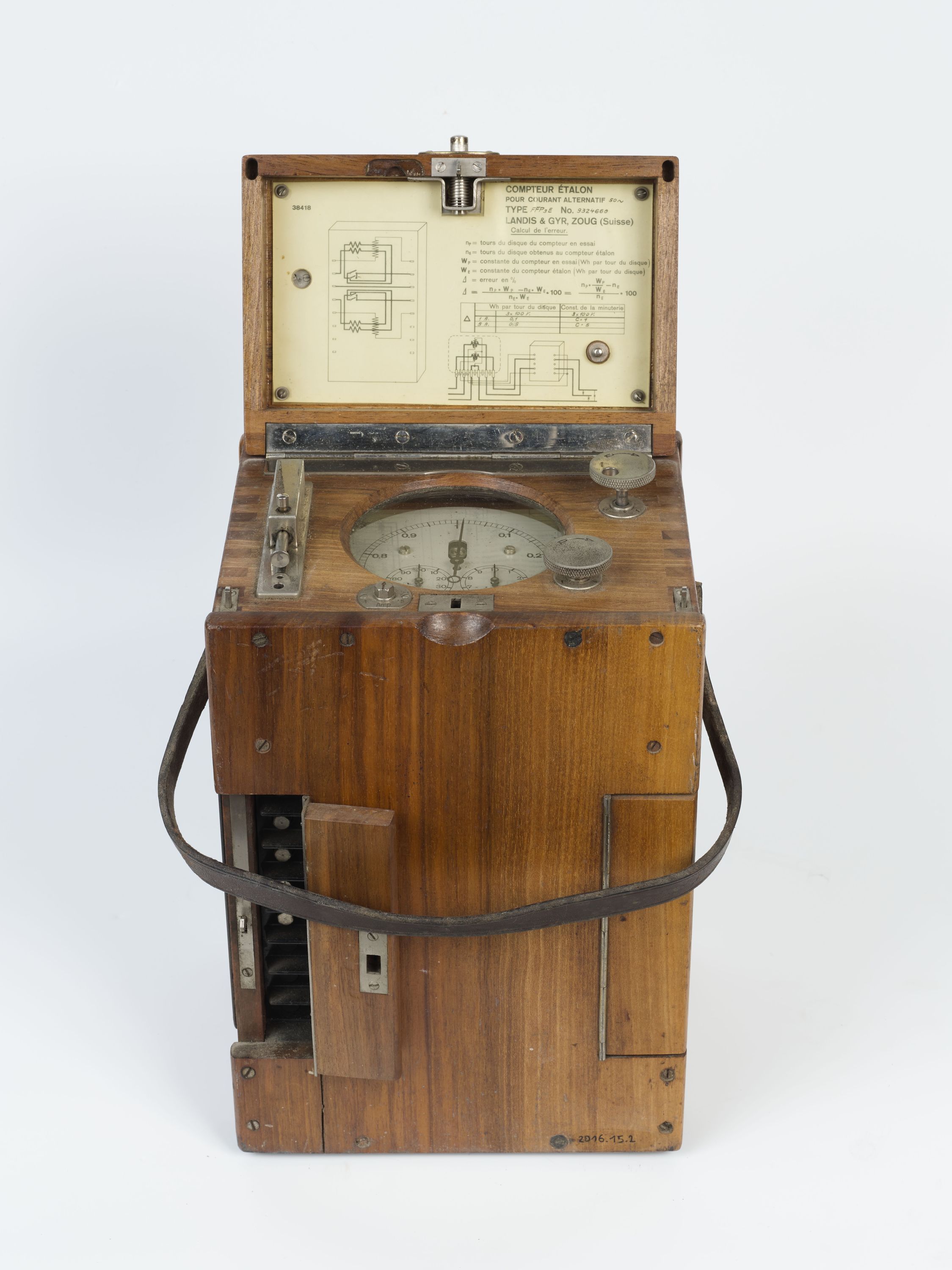 Compteur étalon composé d'un coffret en bois avec un couvercle qui protège le cadran, une lanière en cuir et des trappes verticales pour les branchements.