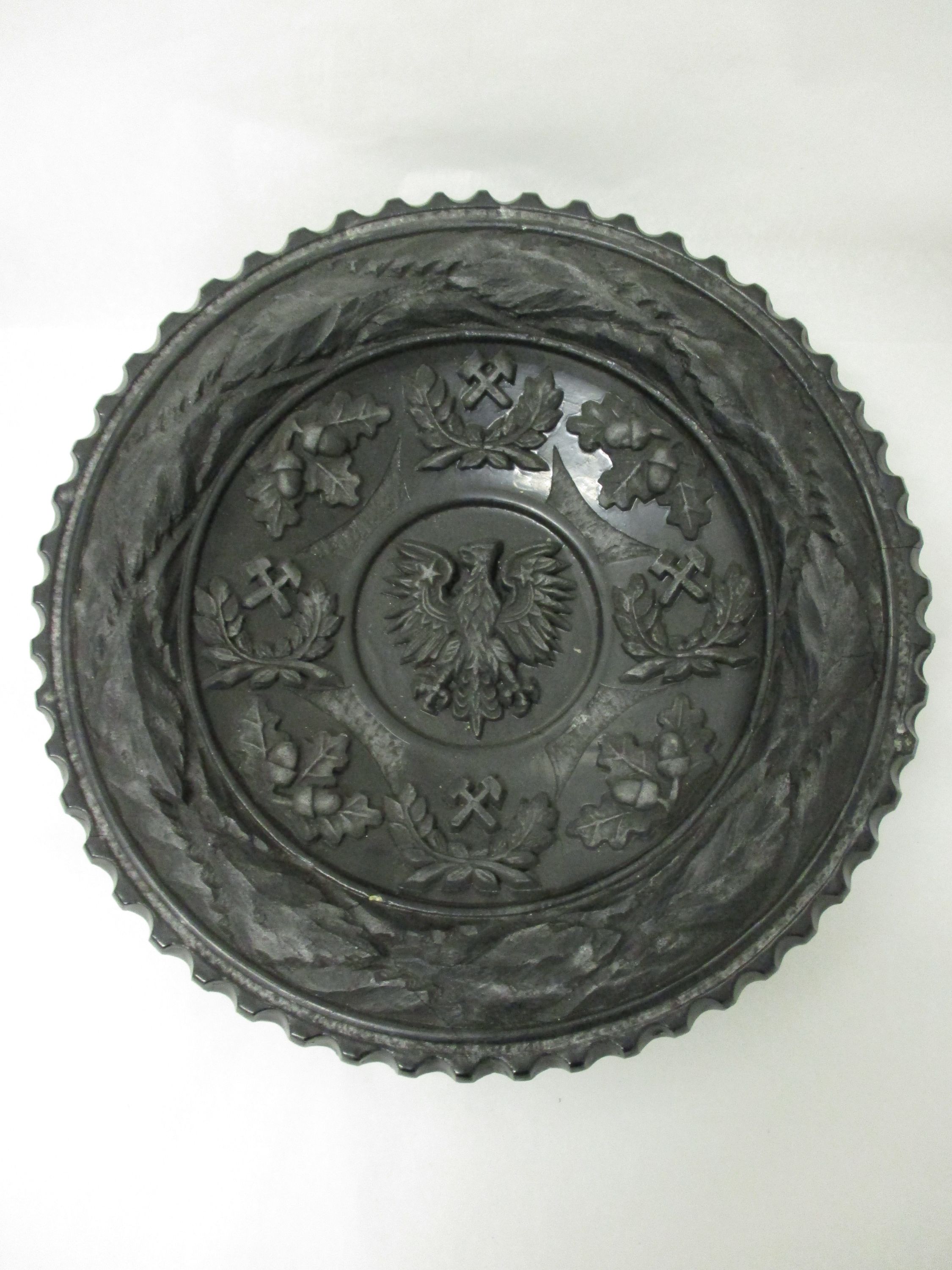 Assiette commémorative en charbon représentant un aigle entouré de glands, de feuilles de chêne, de lauriers, de maillets et de marteaux croisés.