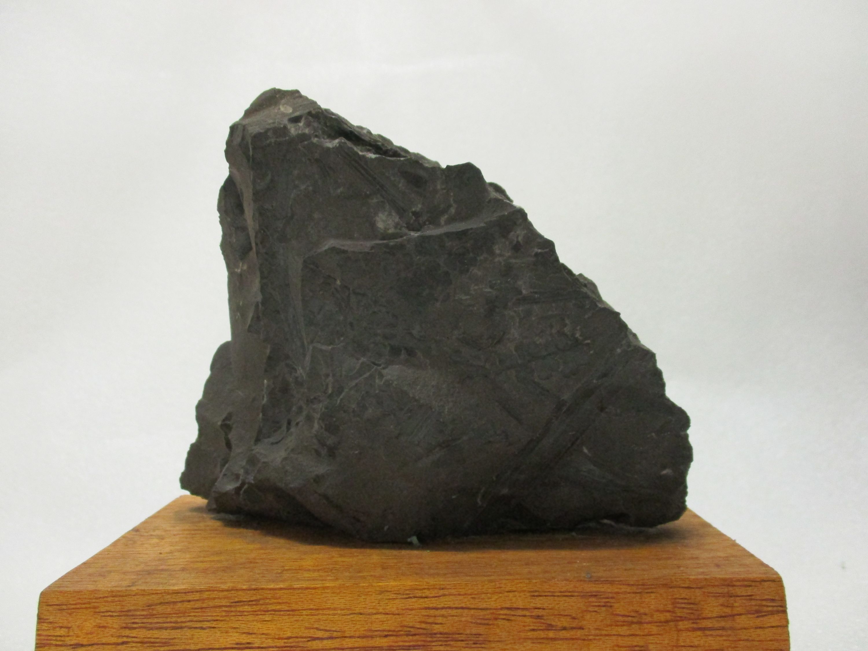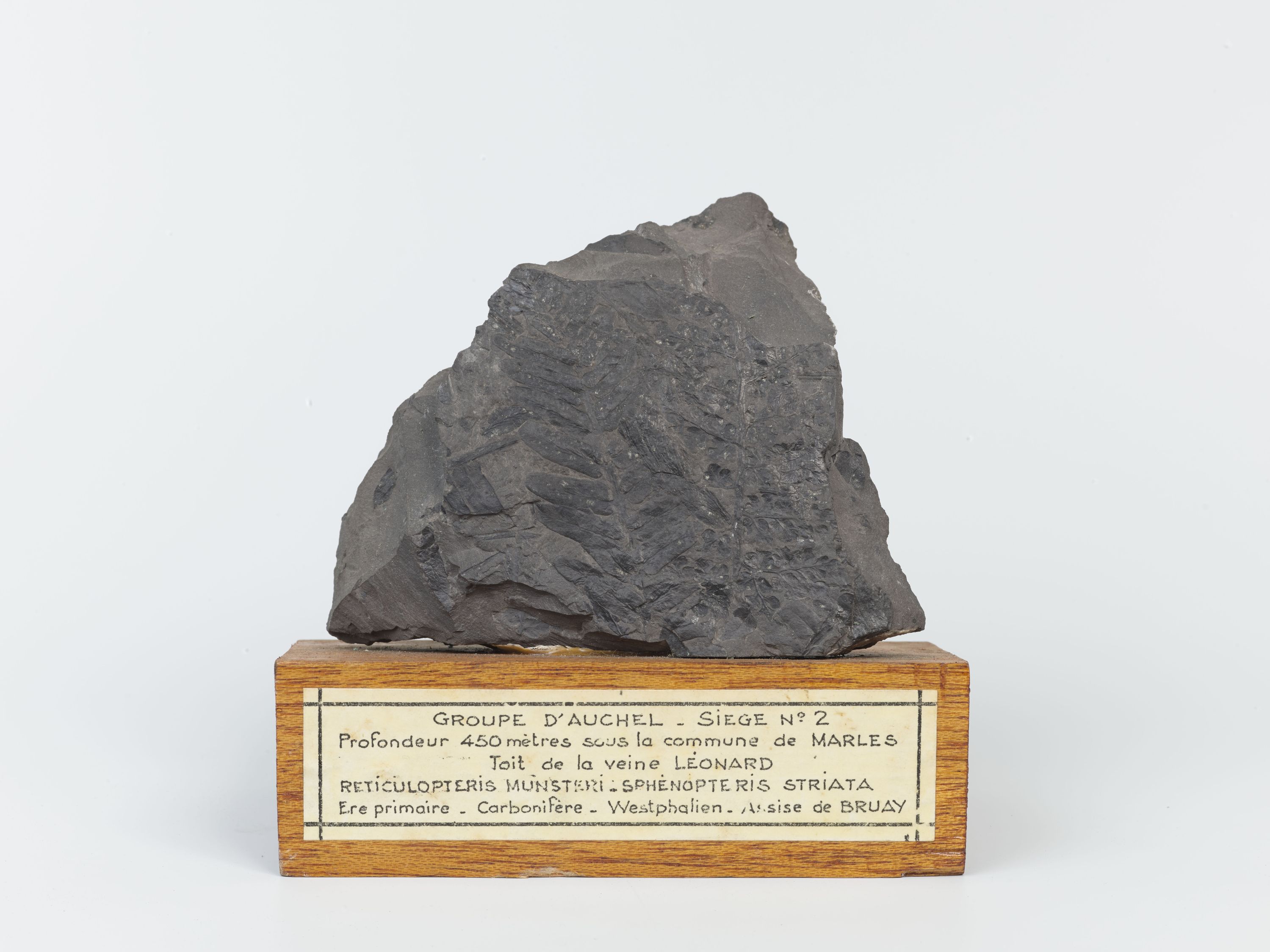 Fossile houiller de Reticulopteris Münsteri et Sphenopteris Striata collé sur un socle en bois.