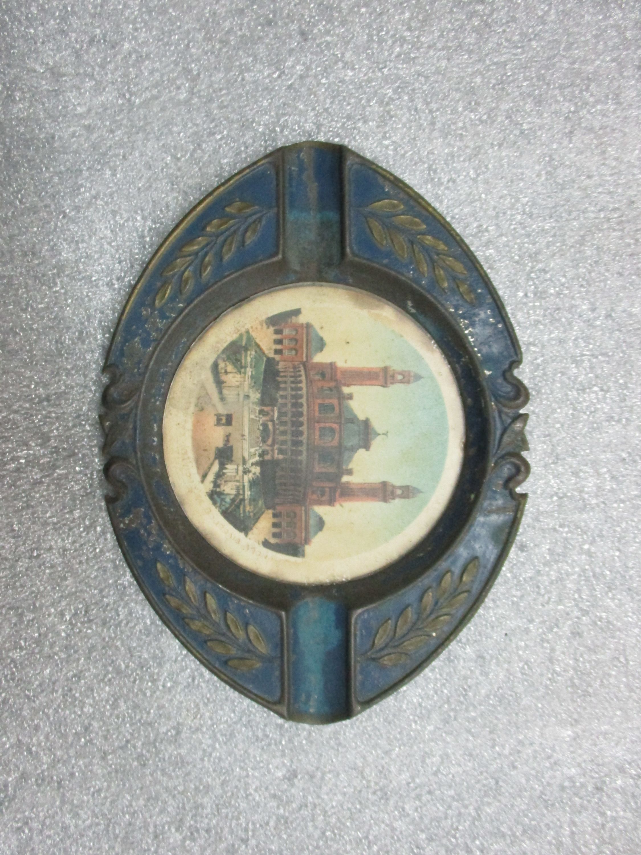Cendrier ovale en métal peint en bleu avec au fond une vue du Trocadéro;