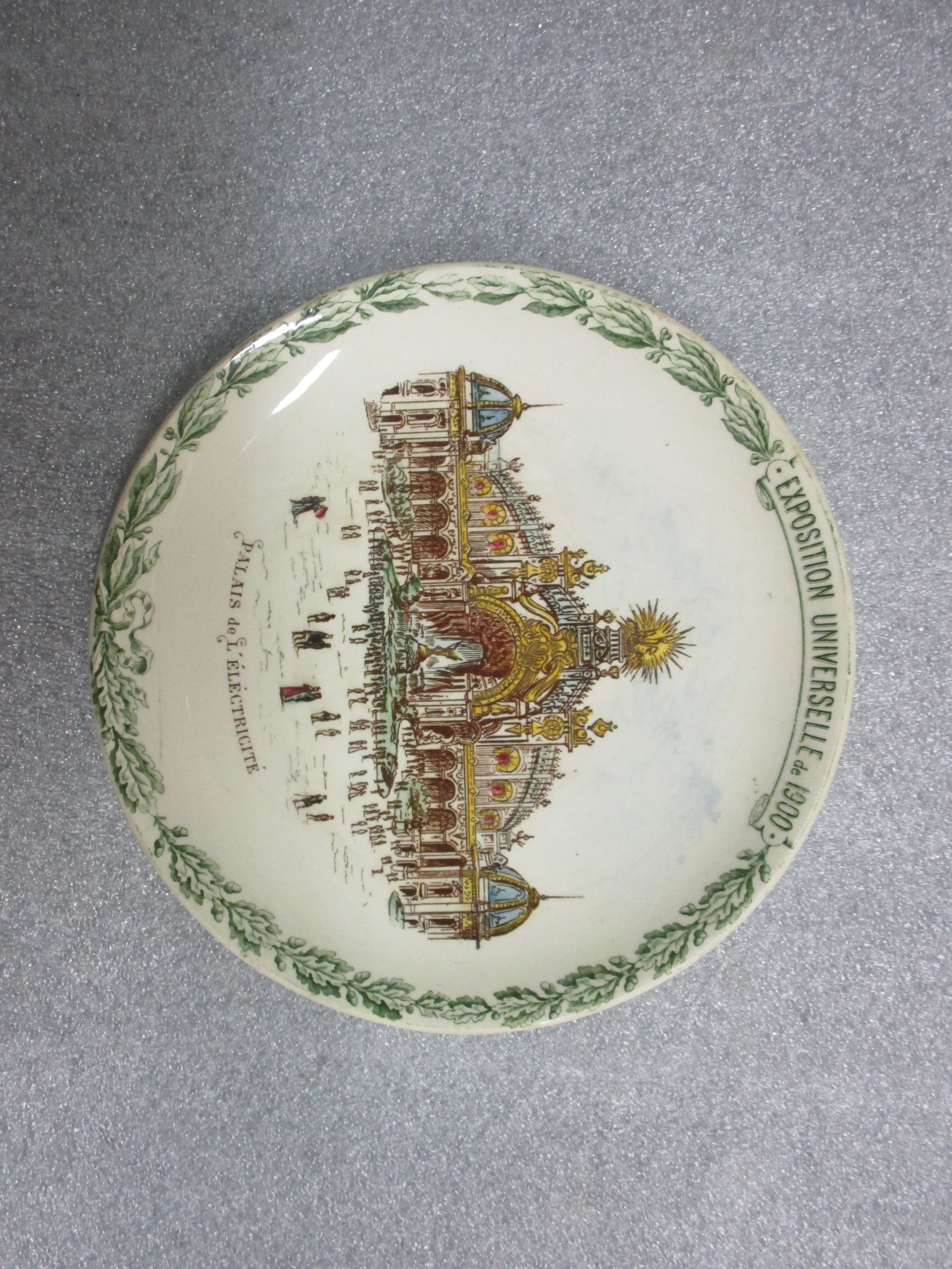 Assiette circulaire en faïence blanche avec une vue du Palais de l'Electricité de Exposition Universelle de 1900.
