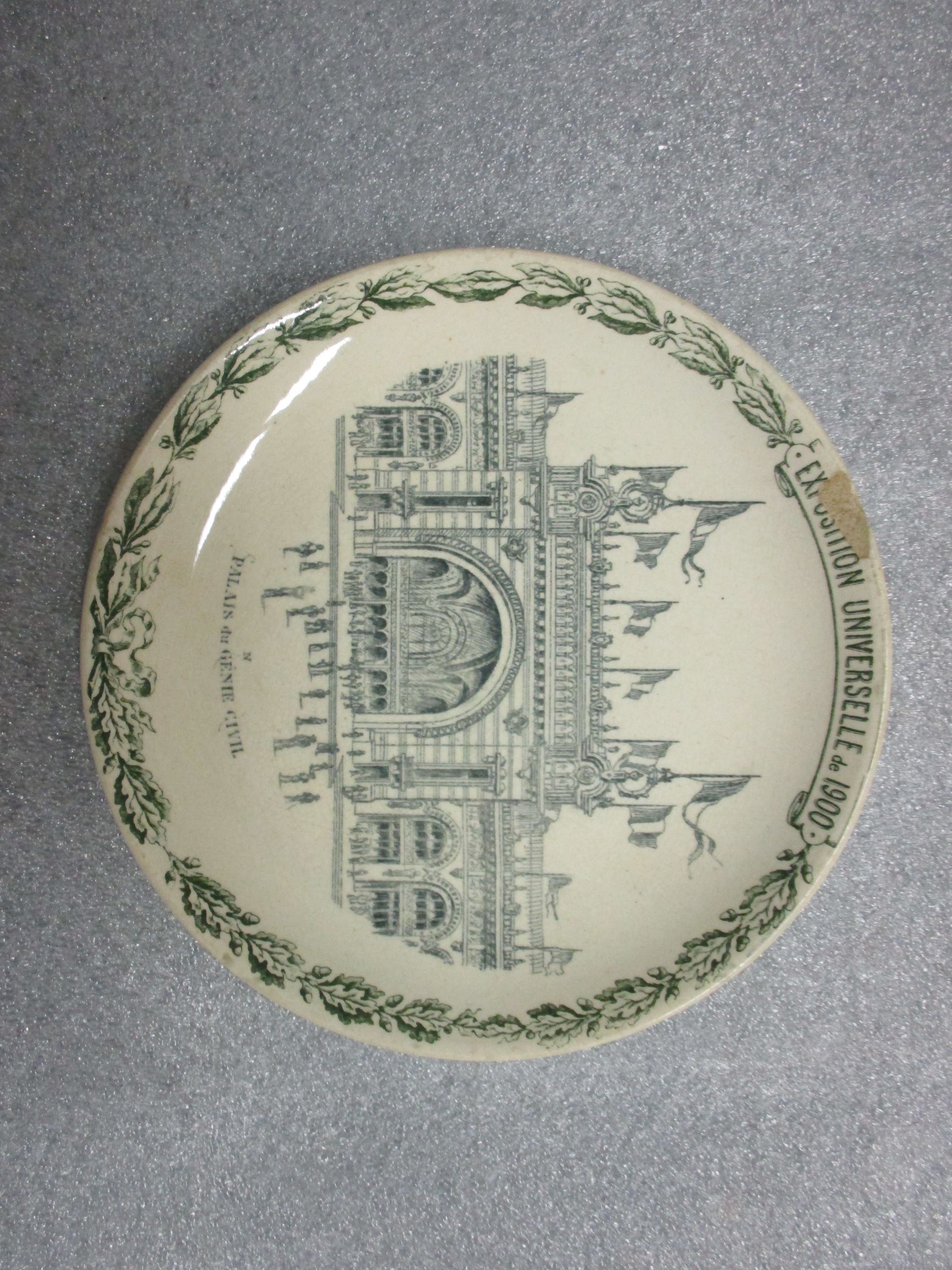 Assiette circulaire en faïence blanche avec une vue du Palais du Génie civil de l'Exposition Universelle de 1900.