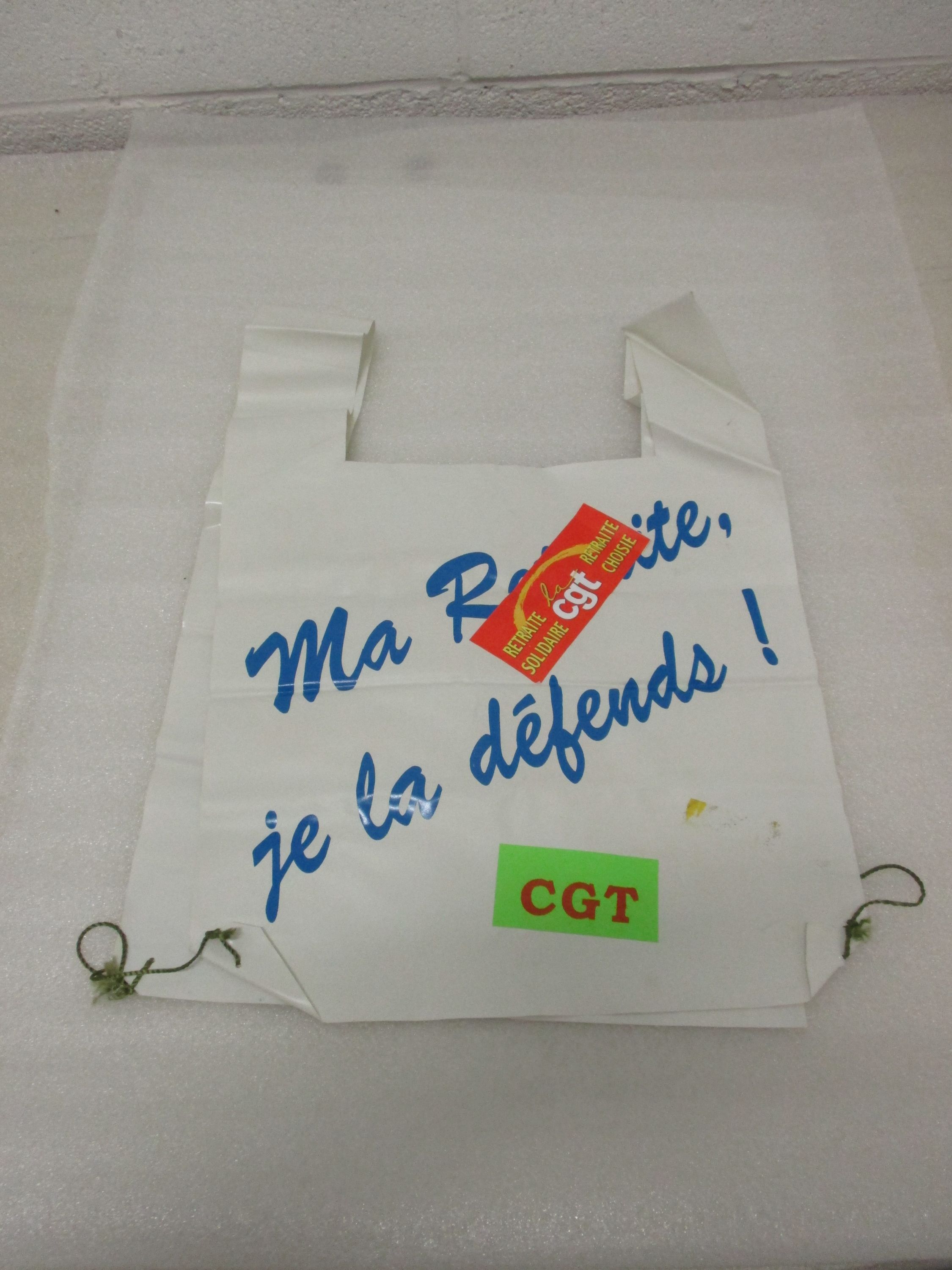 Deux dossards en plastique blanc avec des autocollants CGT.
