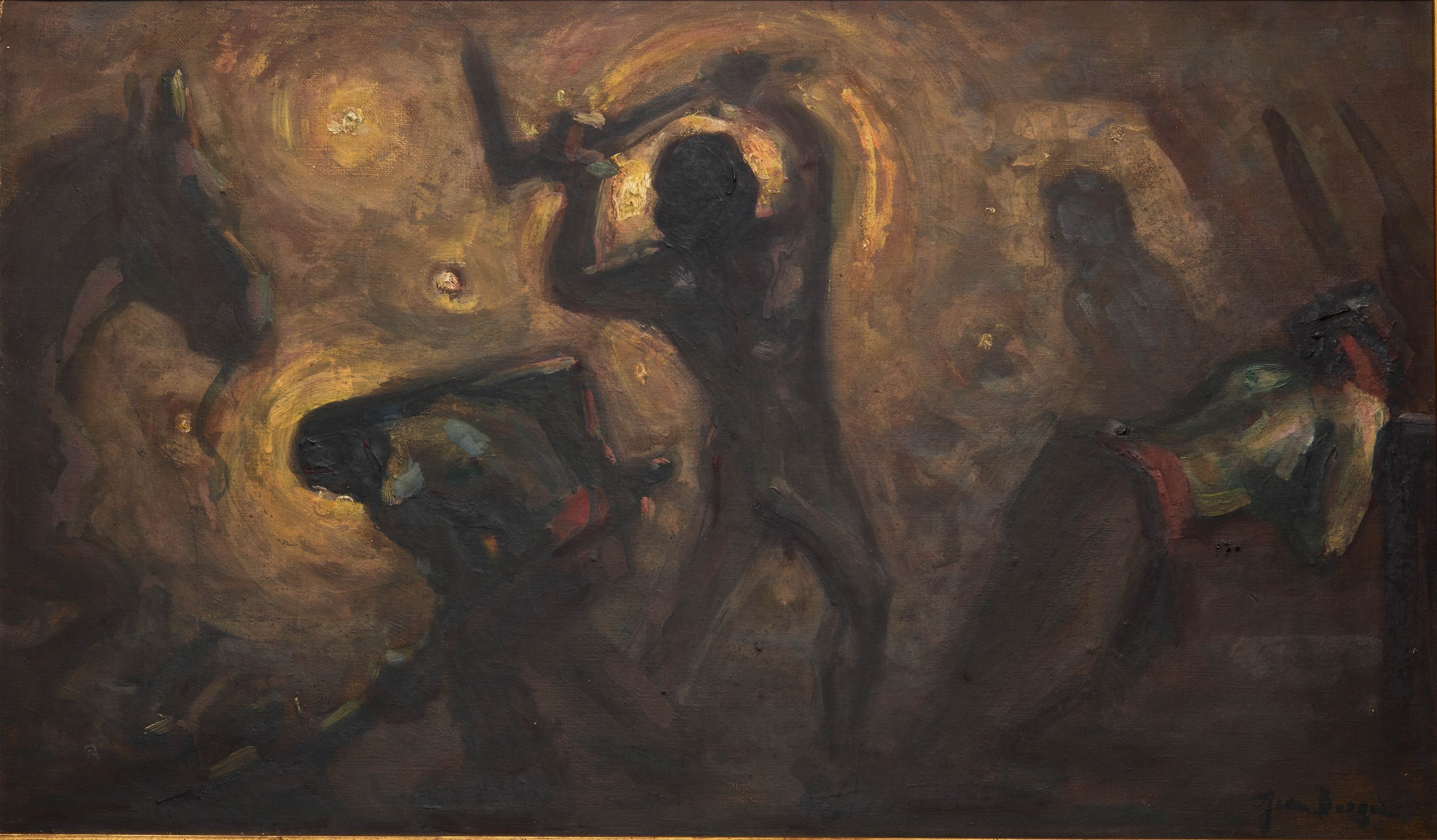 La tête du cheval se trouve à gauche, un premier mineur courbé ramasse le charbon au sol, un second utilise le pic pour abattre le charbon, un troisième semble pousser une berline et le quatrième est seulement une silhouette dans le fond.