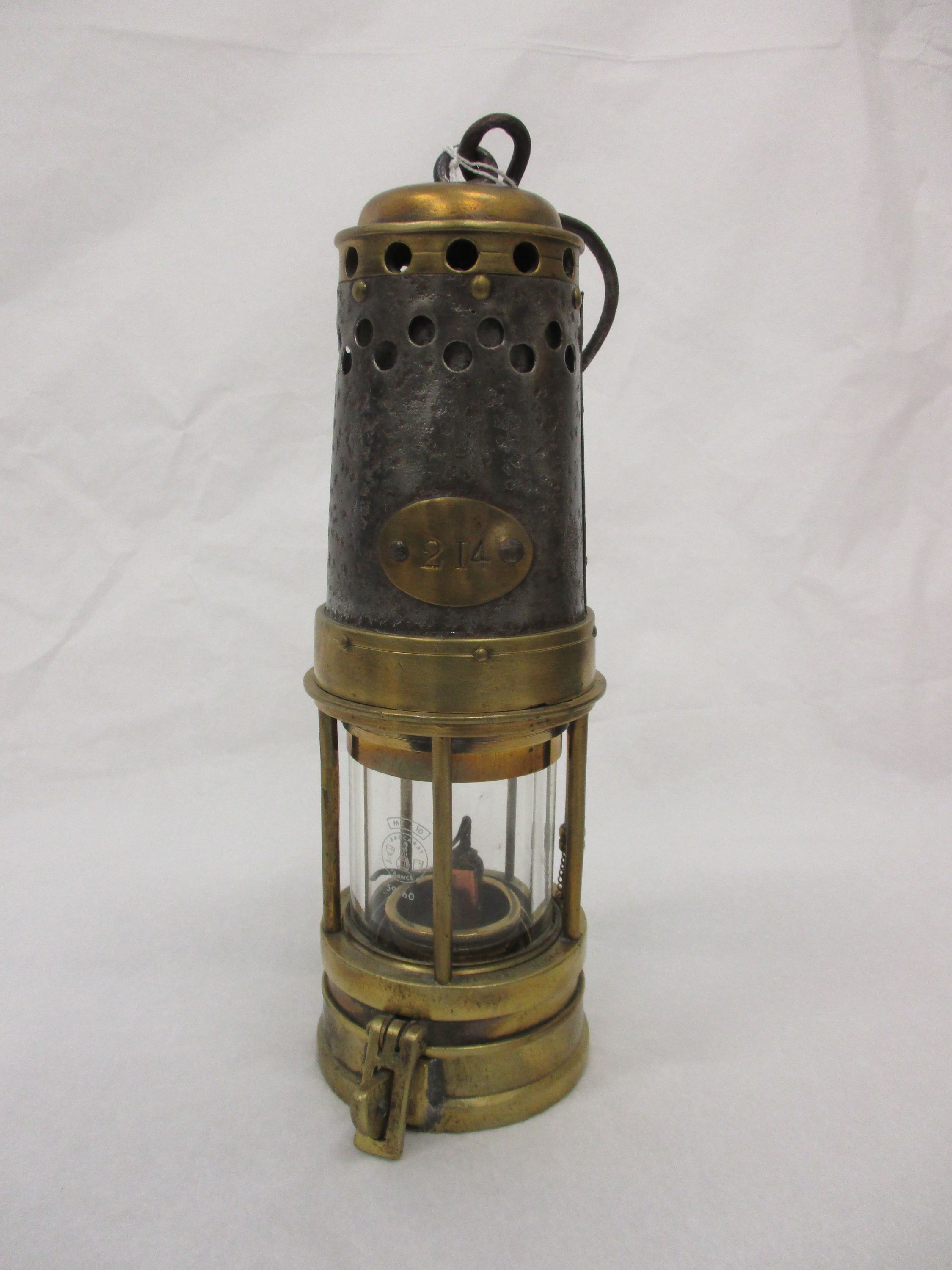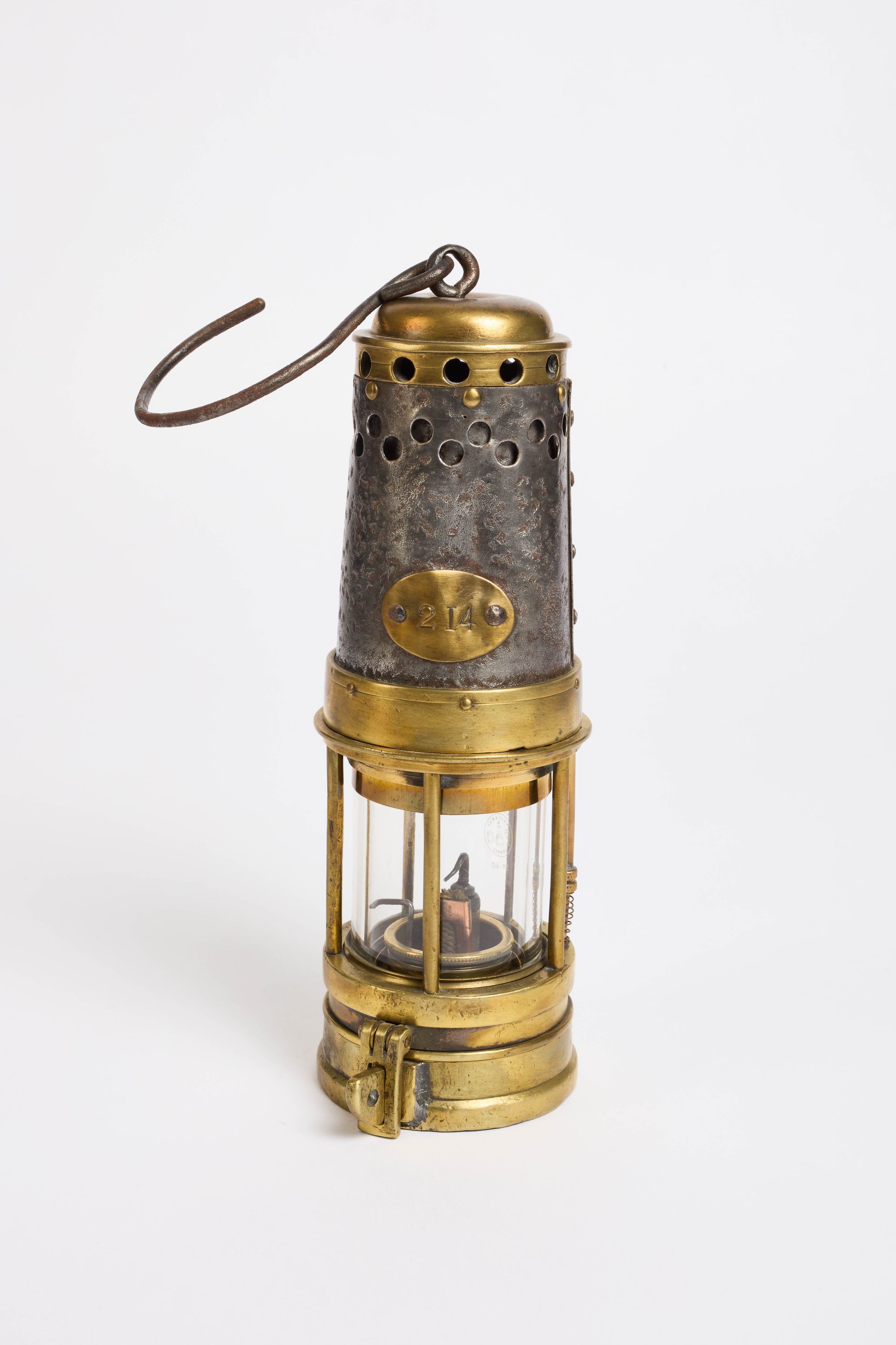 Lampe de mine à huile du fabriquant anglais Naylor, avec une fermeture à rivet. La cuirasse est percée au sommet de trois rangées de trous. La rangée supérieure sert à l'évacuation des gaz brûlés. Les deux rangées inférieures peuvent se fermer en tournant une virole bloquant l'entrée d'air.