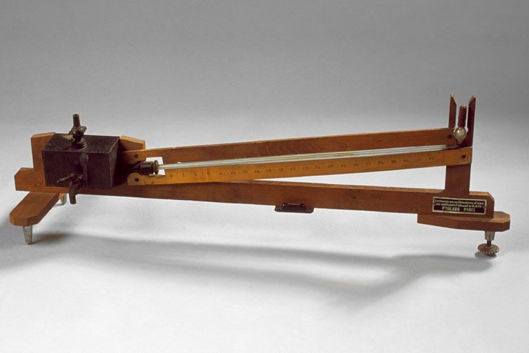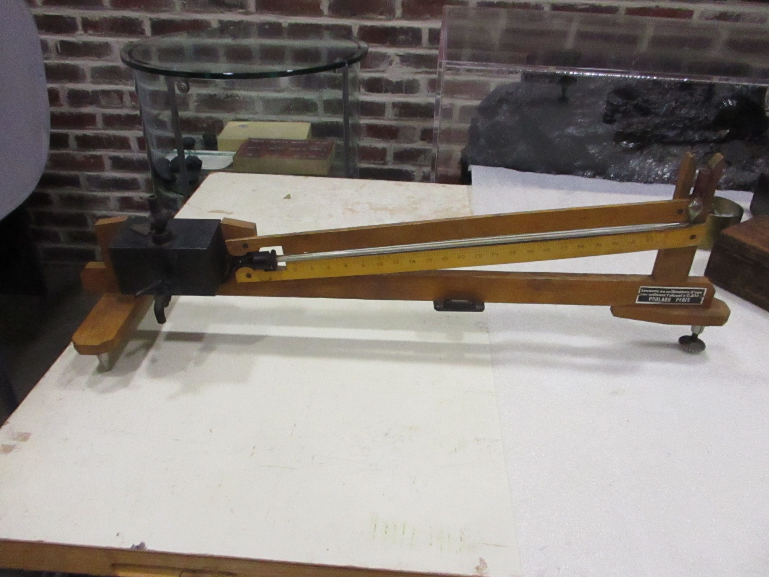 Niveau de géomètre de marque PROLABO composé d'une règle graduée sur un socle en bois et en métal avec un tube en verre penché.