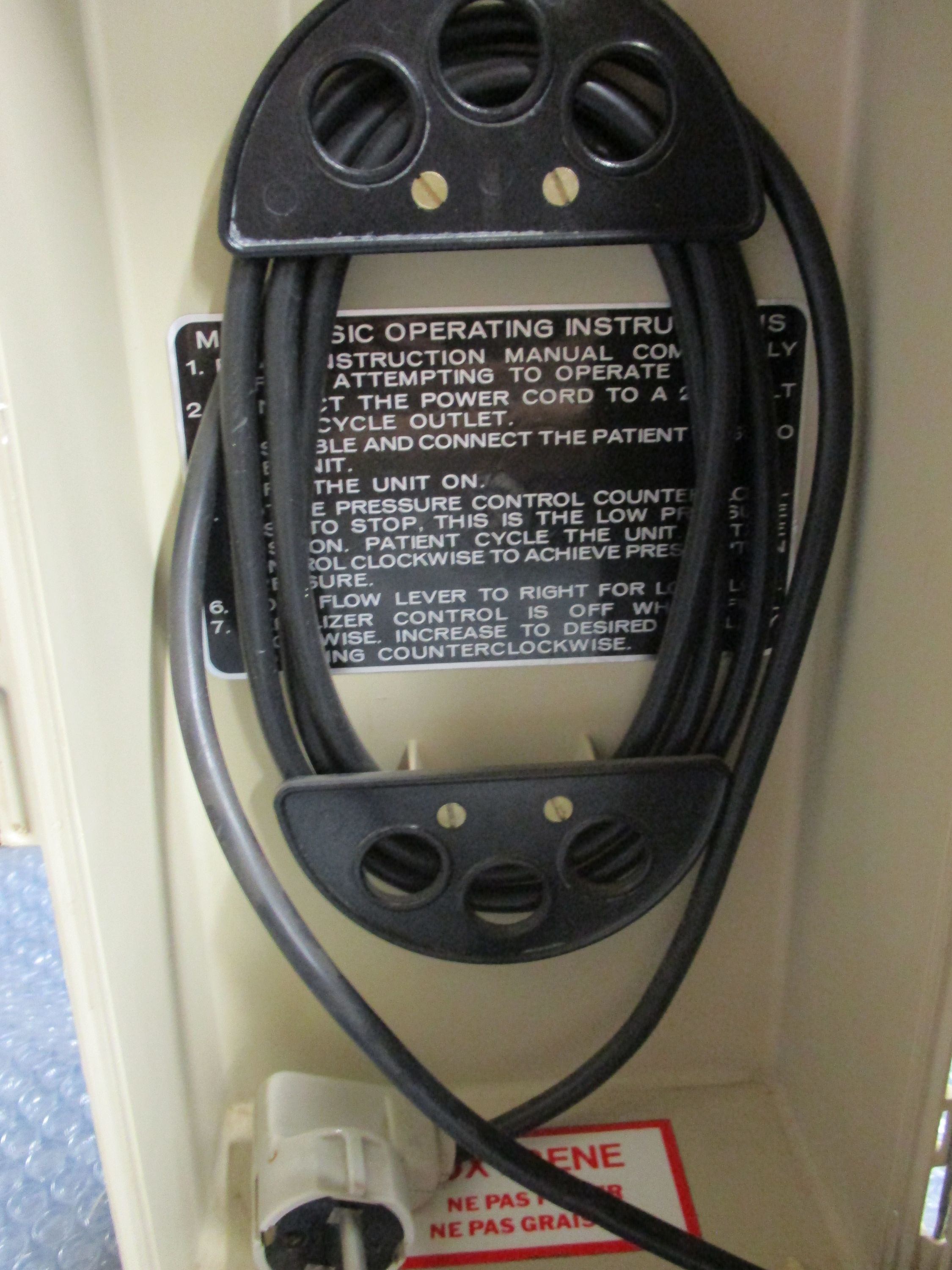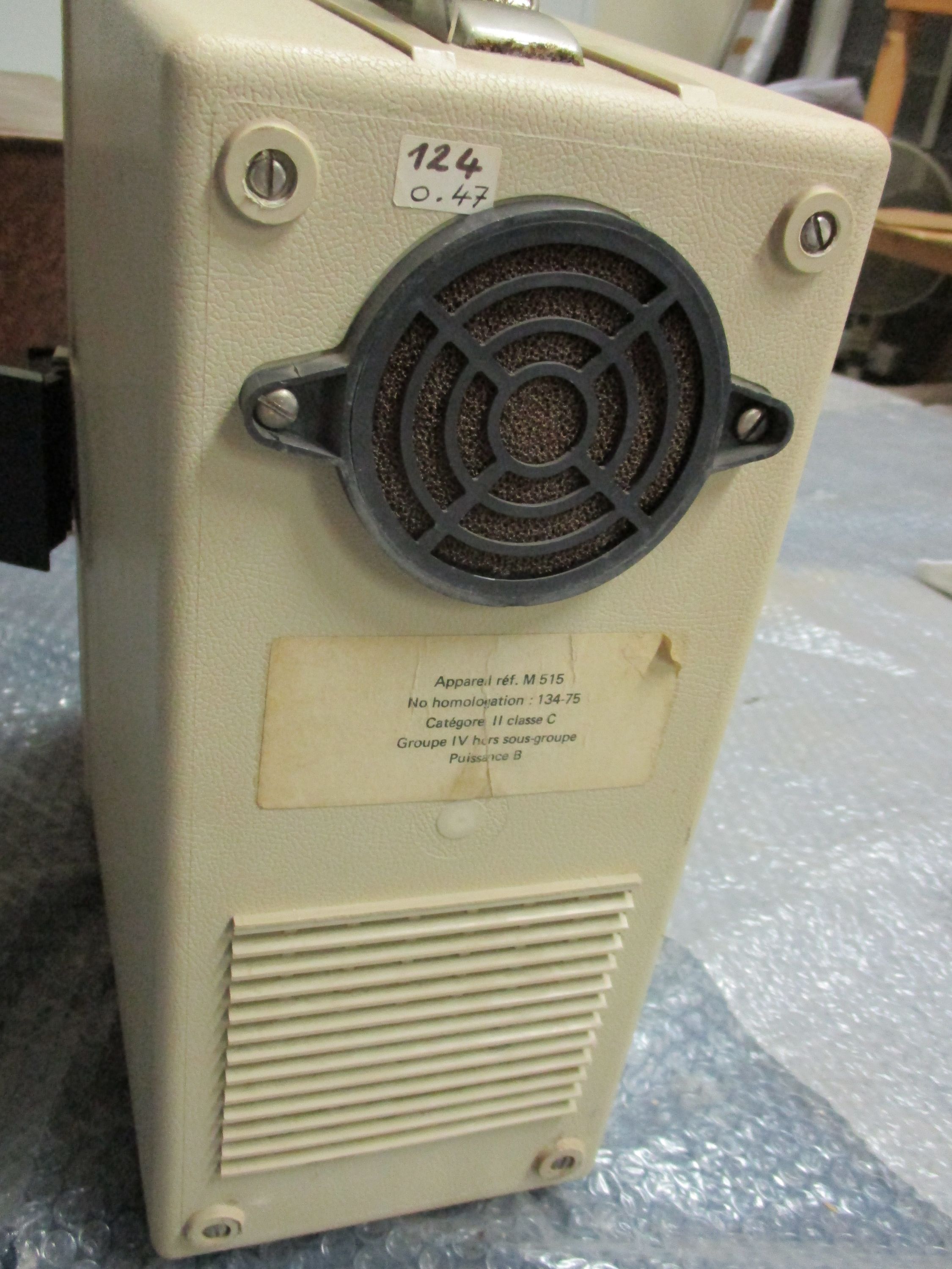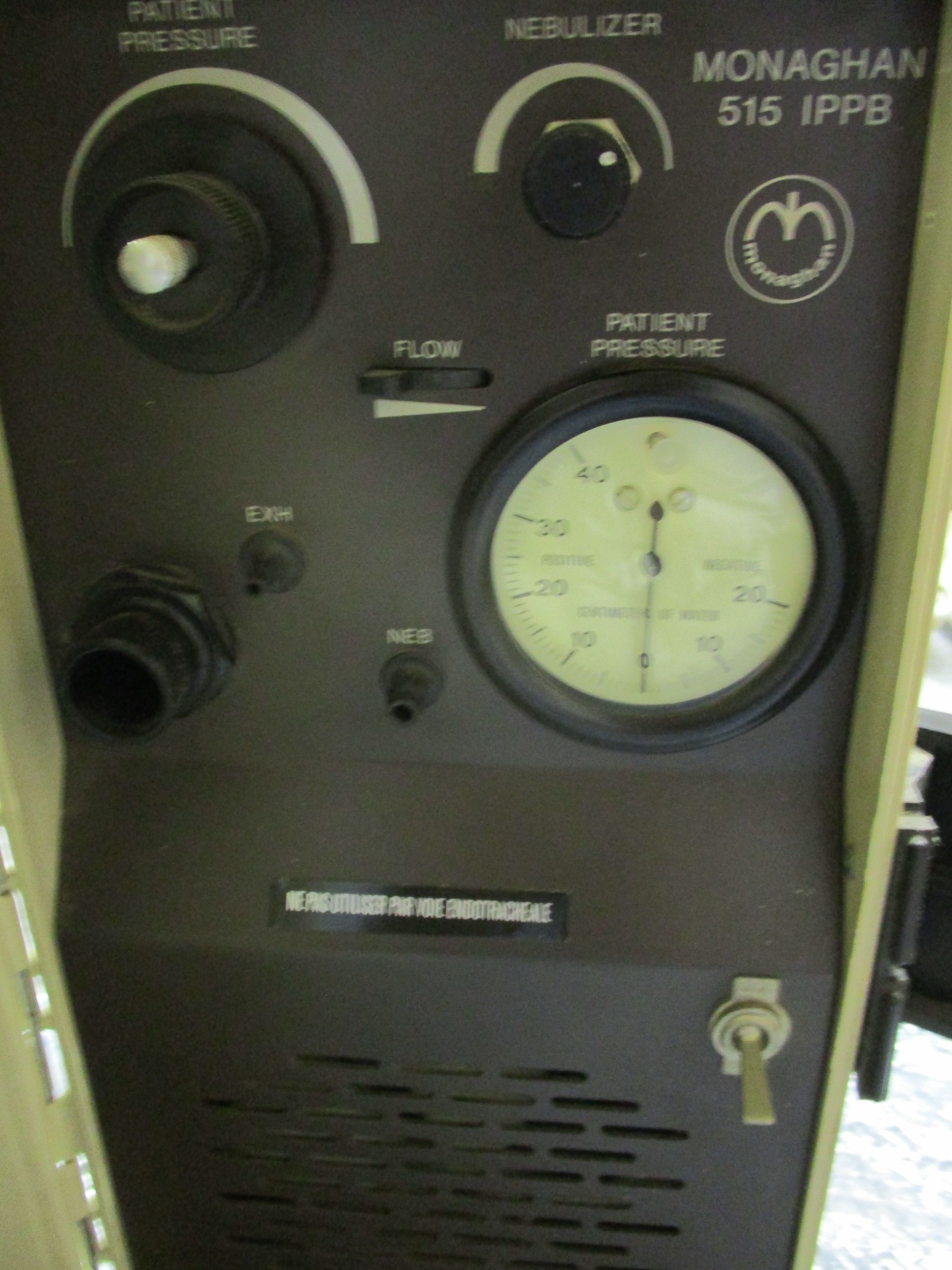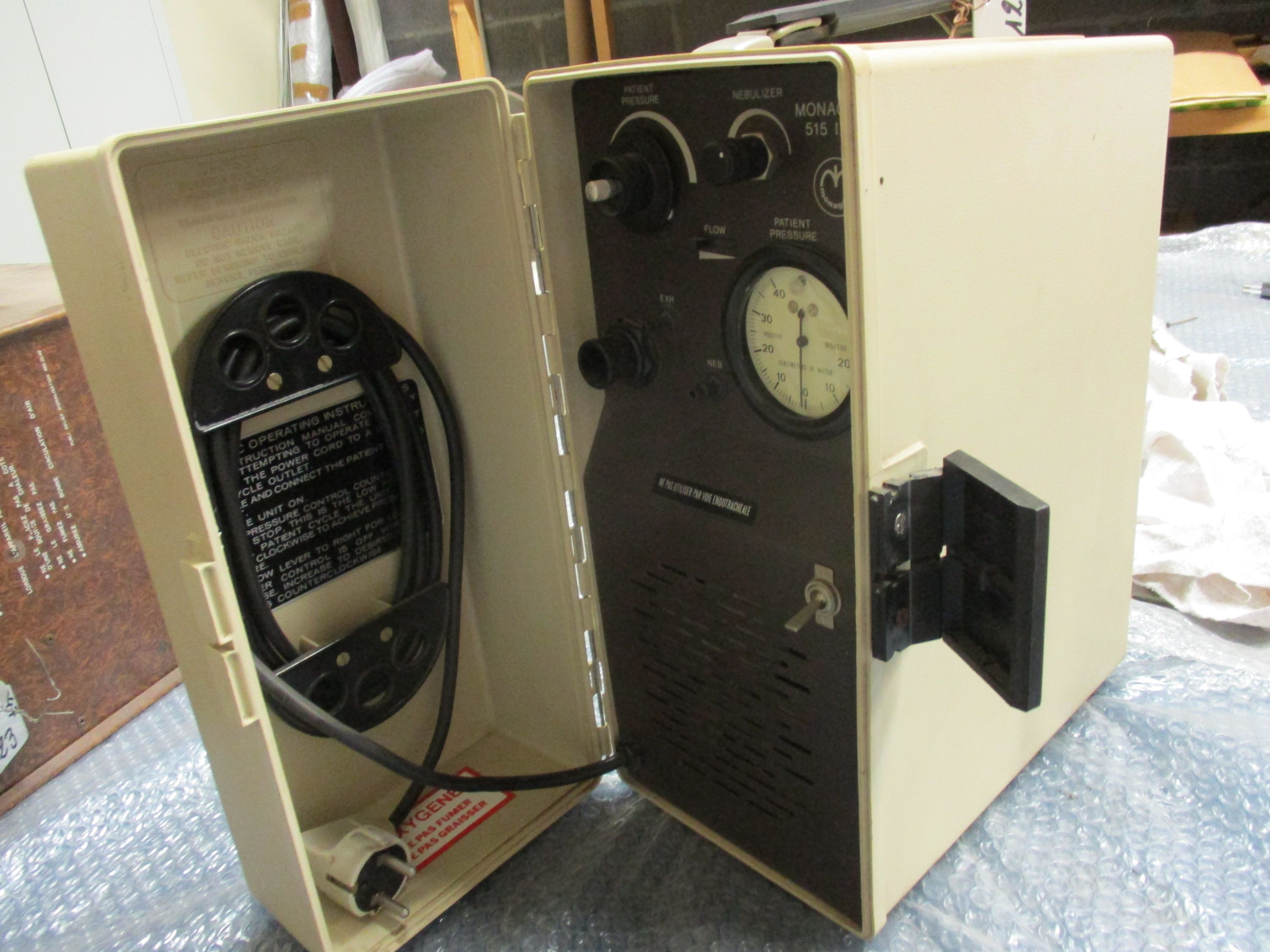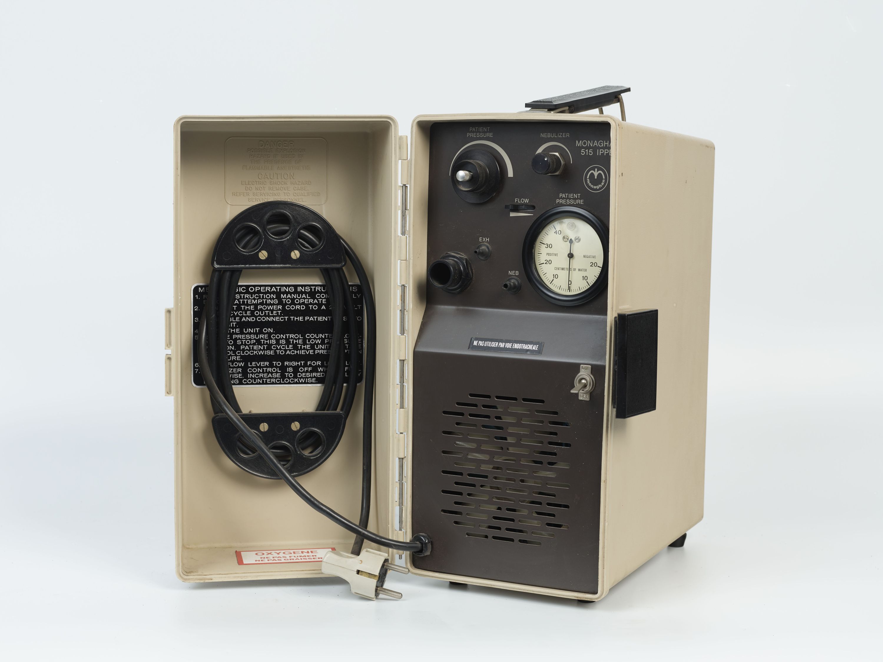 Relaxateur de pression Monaghan 515 IPPB modèle 1965 composé d'un boitier en plastique beige avec une poignée noire et un filtre en mousse. A l'intérieur, l'appareil possède un cadran à aiguille, un fil électrique et des boutons.