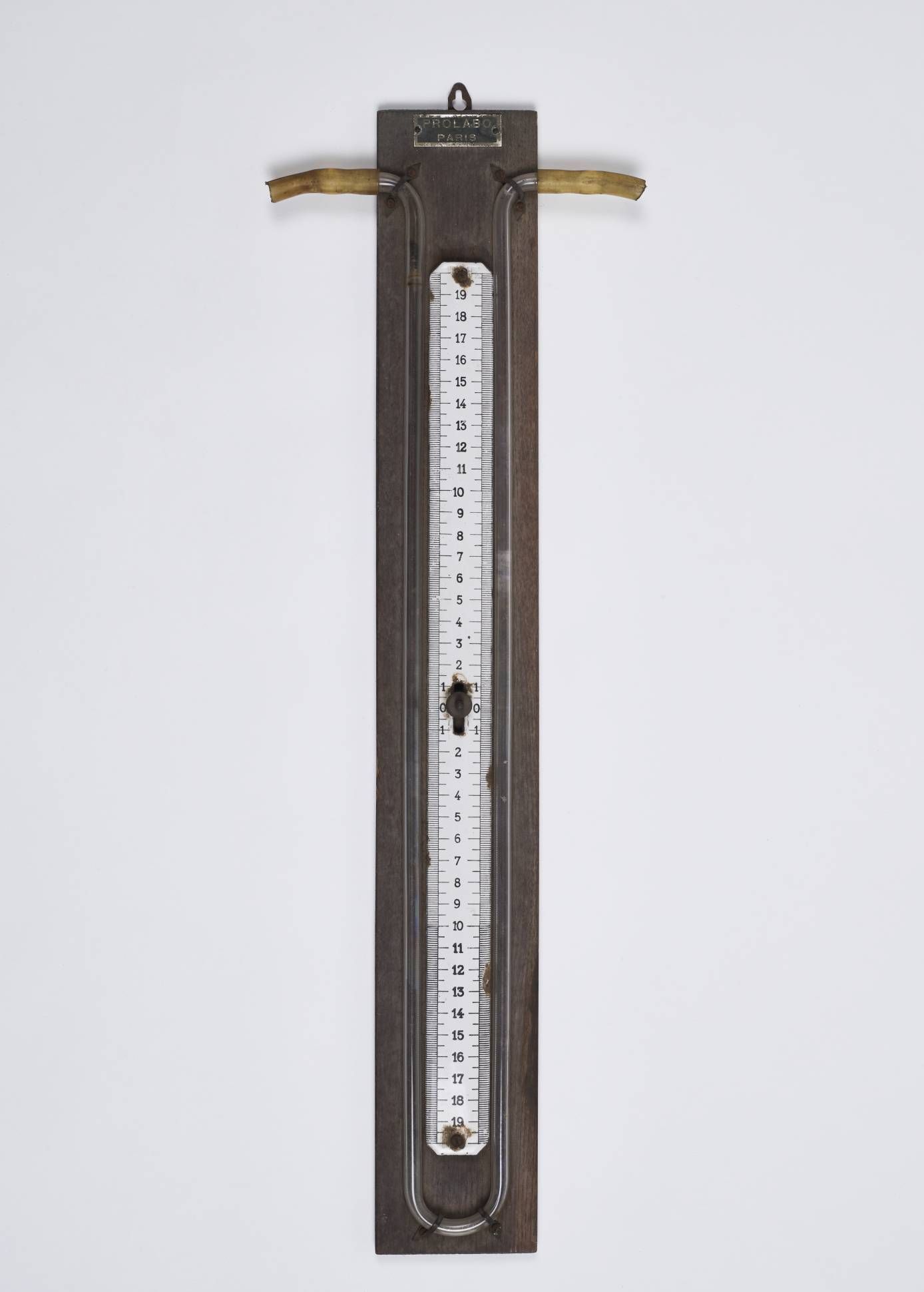 Manomètre à eau gradué de 0 à 19, composé d'un tube en verre formant un U et fixé sur une planche en bois. A chaque extrémité du tube en verre, on trouve un fragment de tube en caoutchouc.