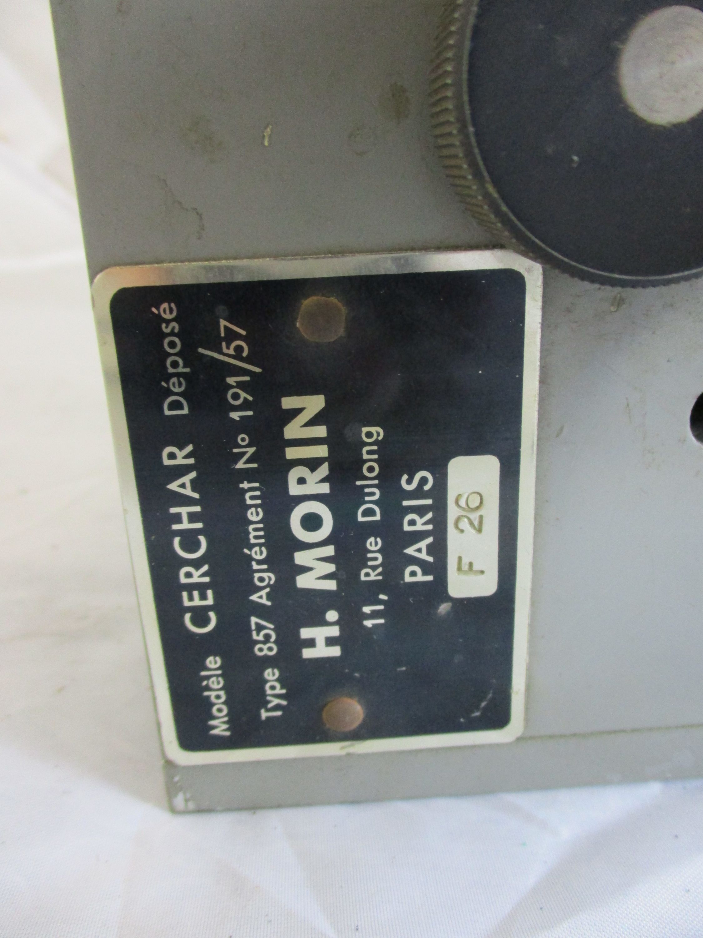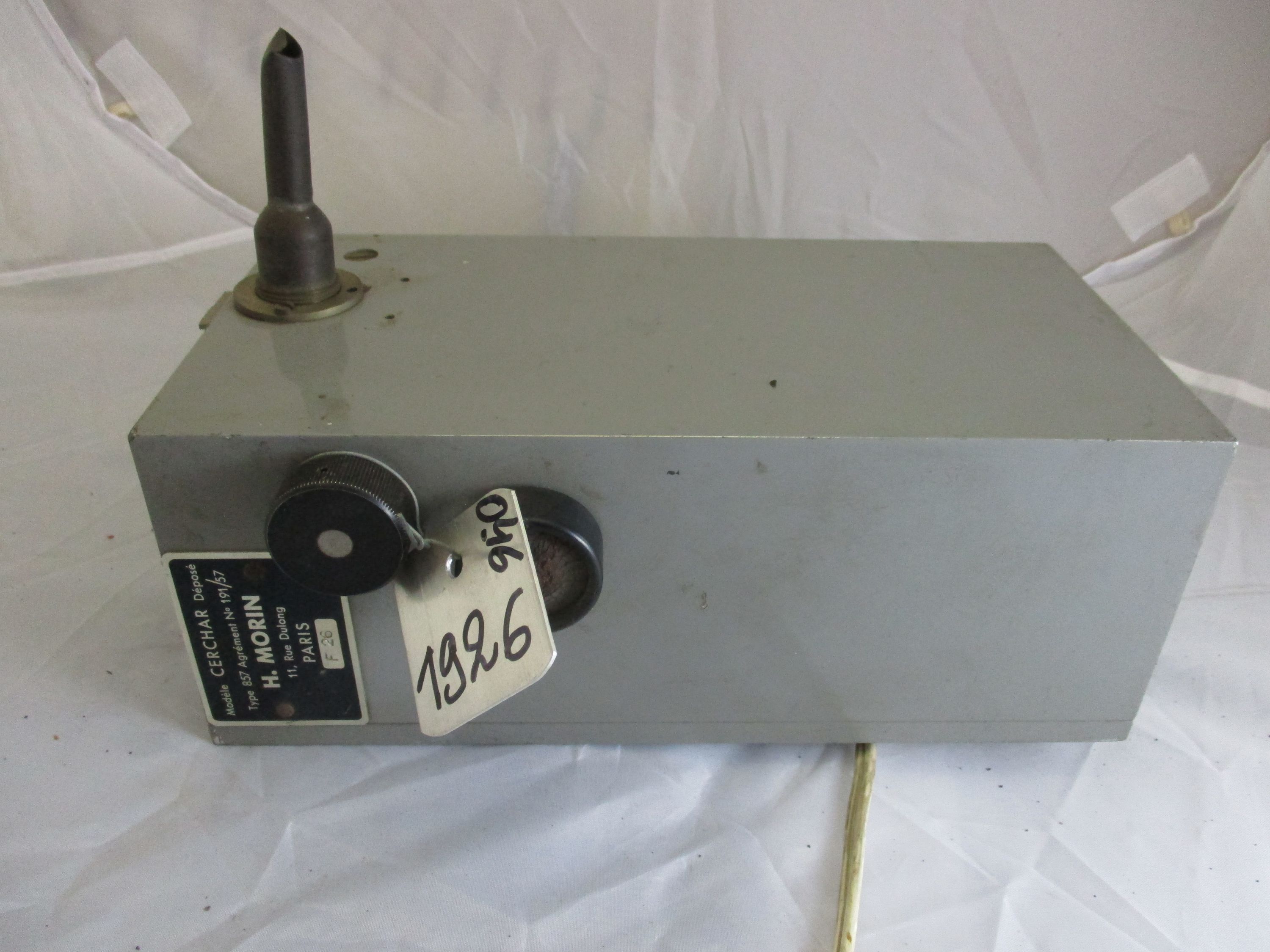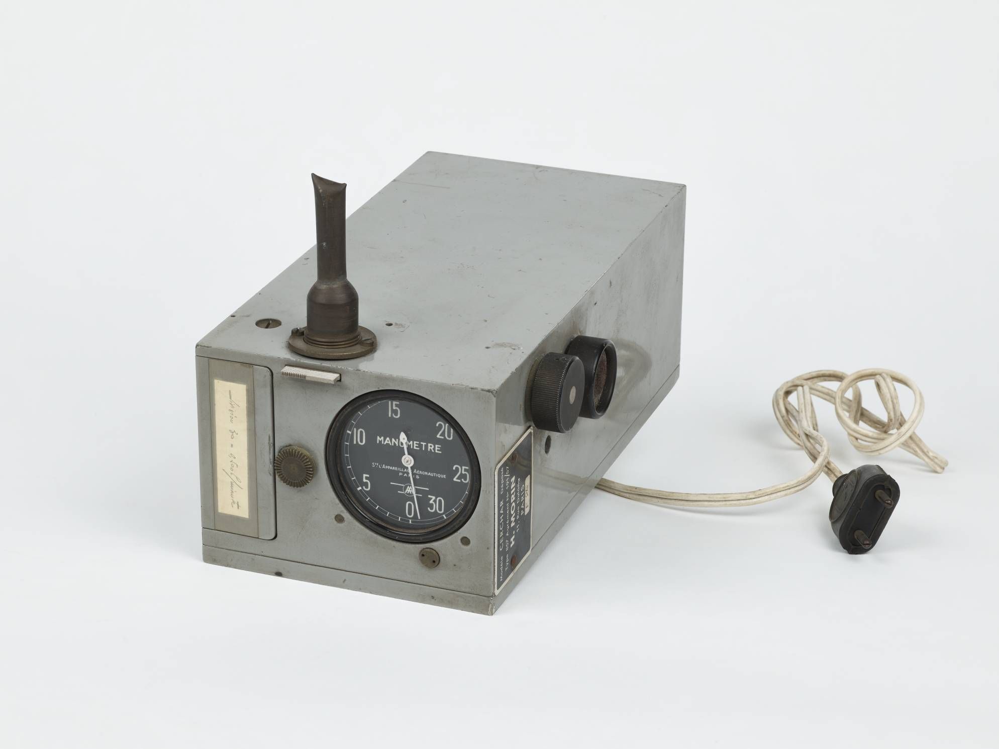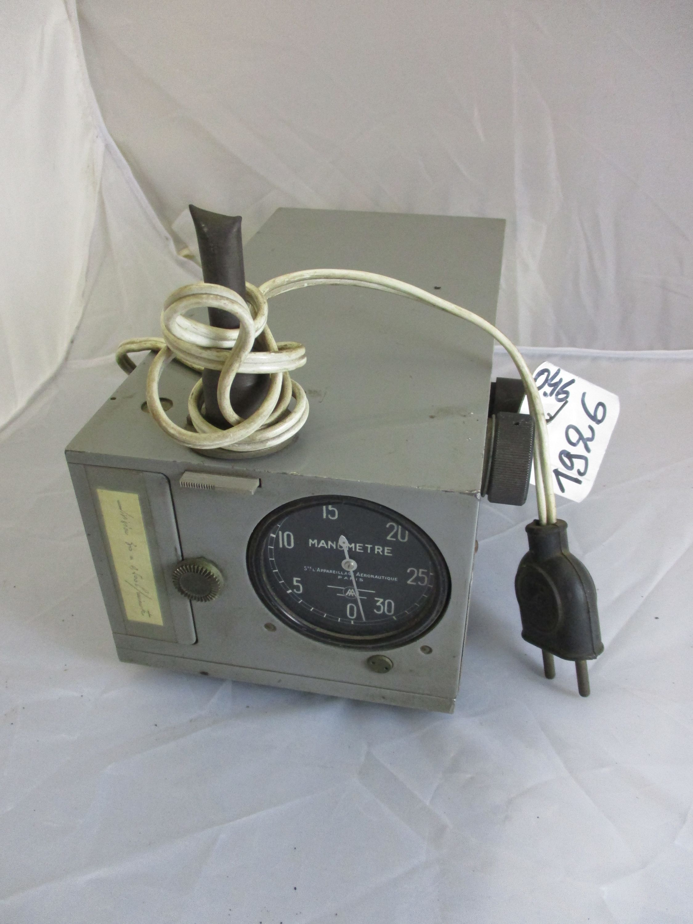 Manomètre composé d'un boitier gris avec un cadran et une aiguille, un fil électrique blanc, deux boutons noirs.
