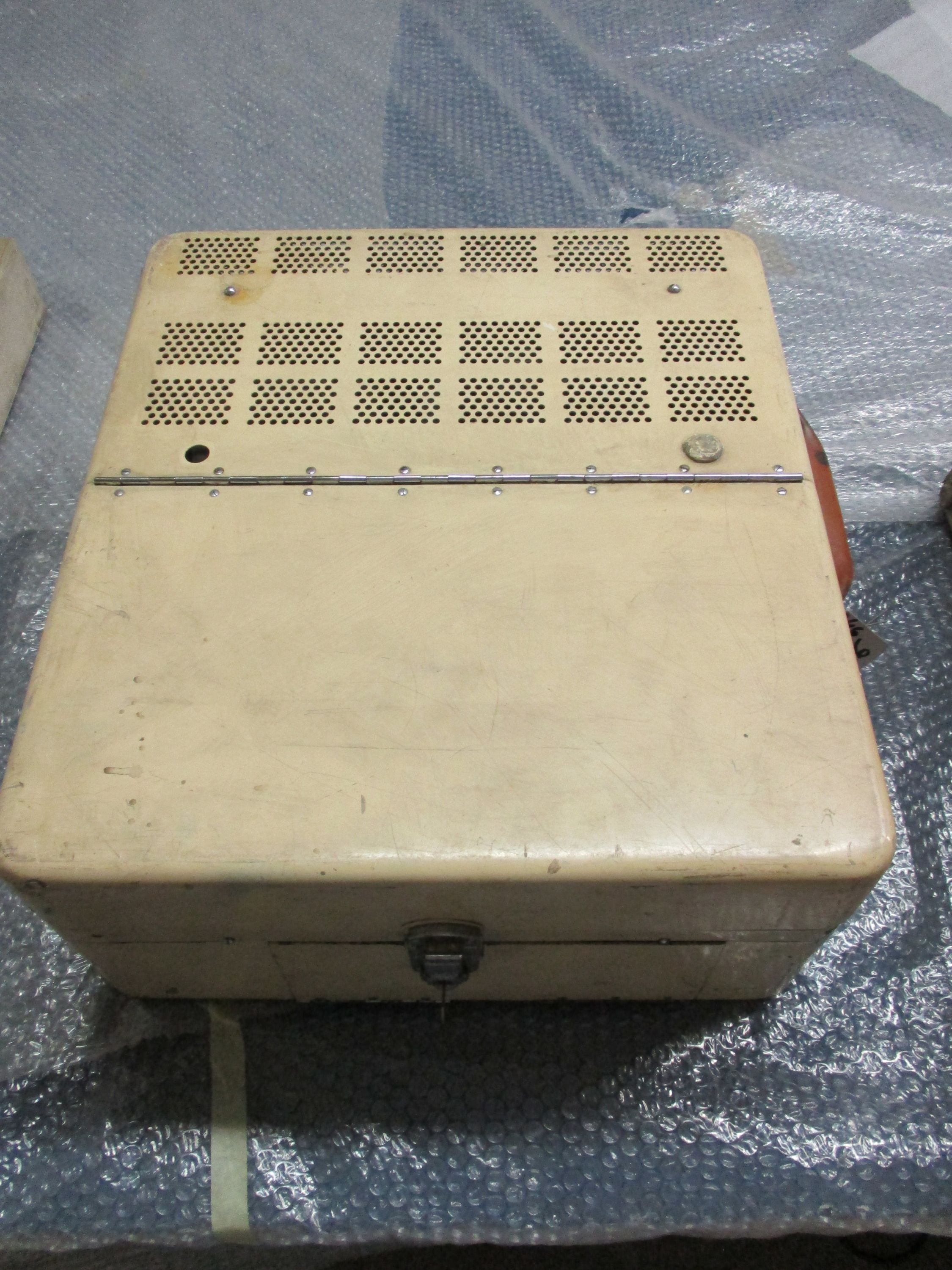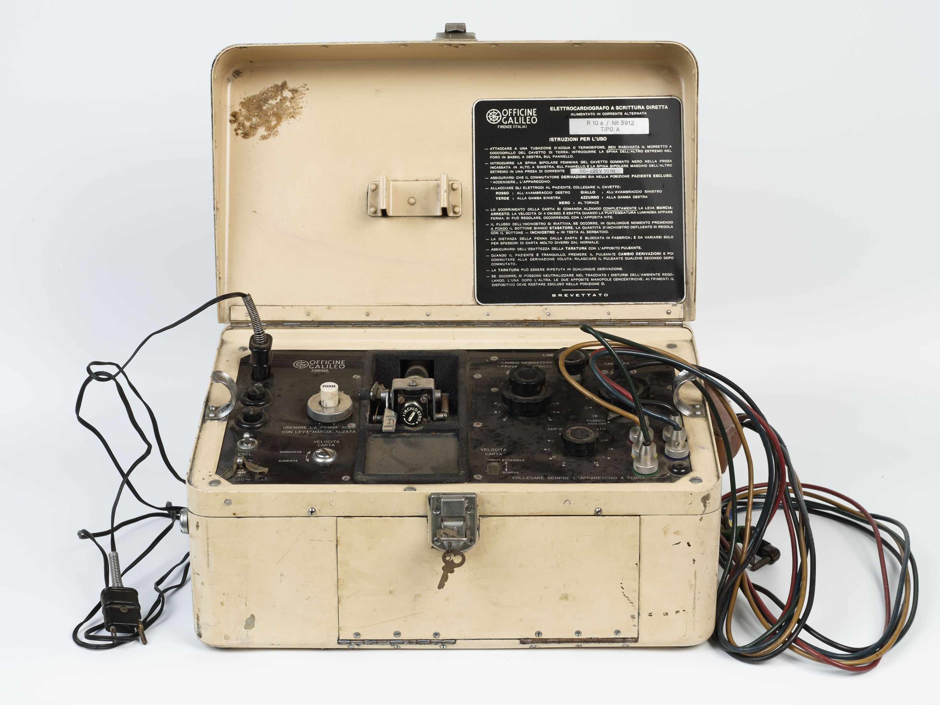 Electrocardiographe de marque italienne composé d'un boitier en tôle émaillée de couleur crème avec un capot qui s'ouvre pour laisser apparaître l'appareil composé de fils électriques et de boutons.