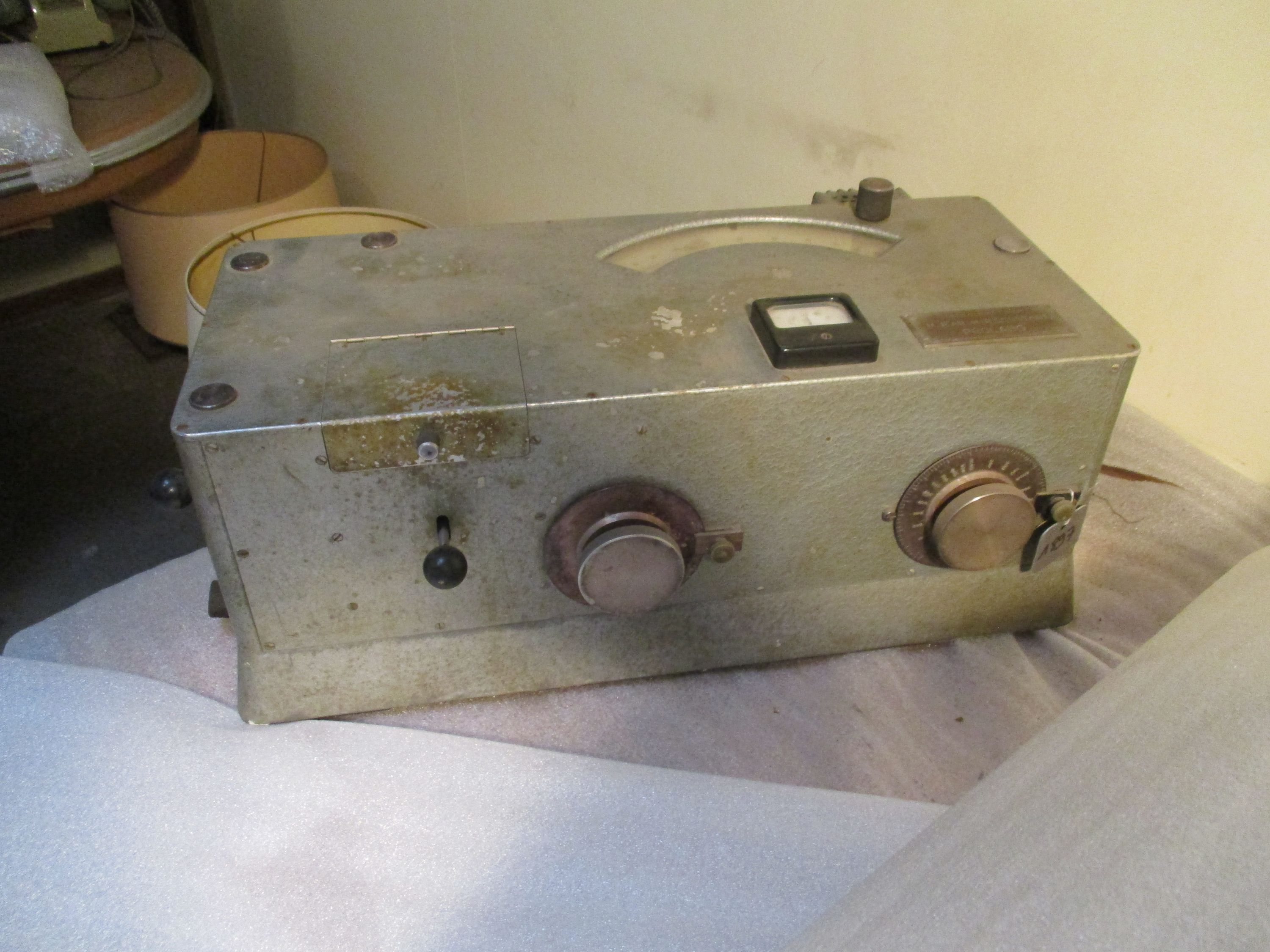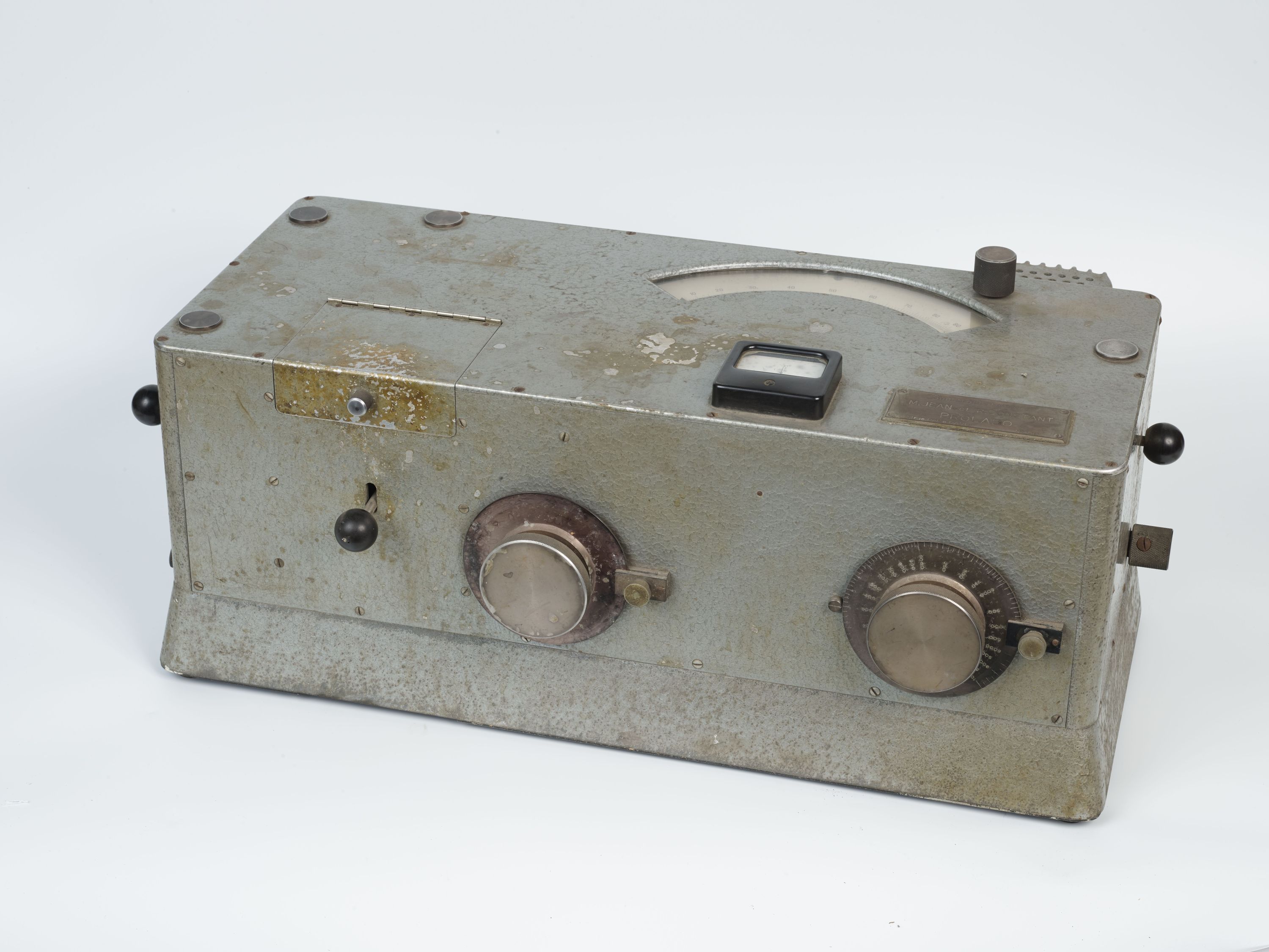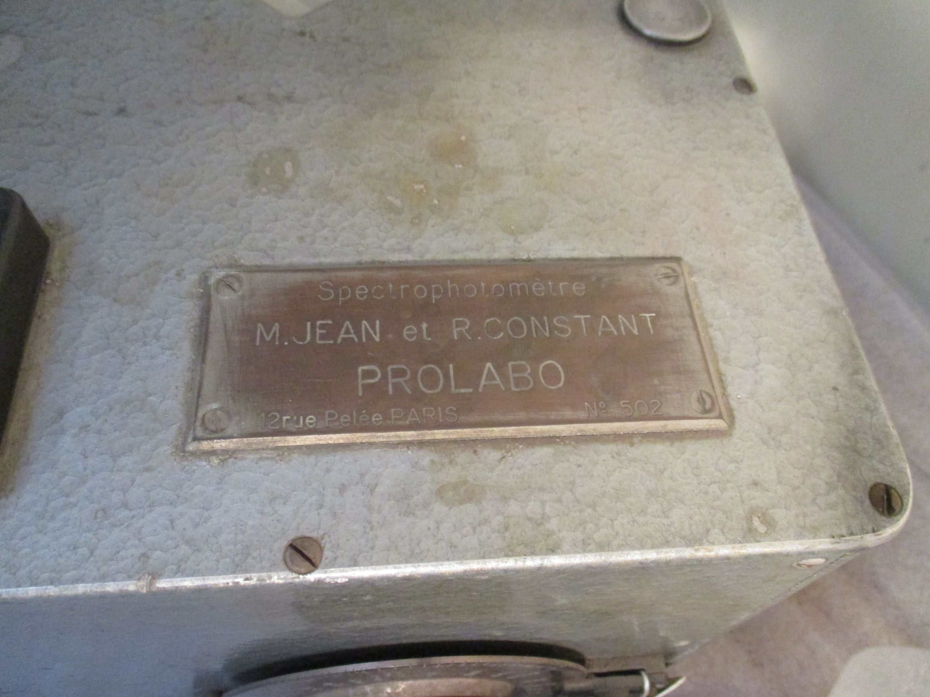 Spectrophotomètre rectangulaire en tôle émaillée grise, des boutons en plastique noir et un cadran en plastique.