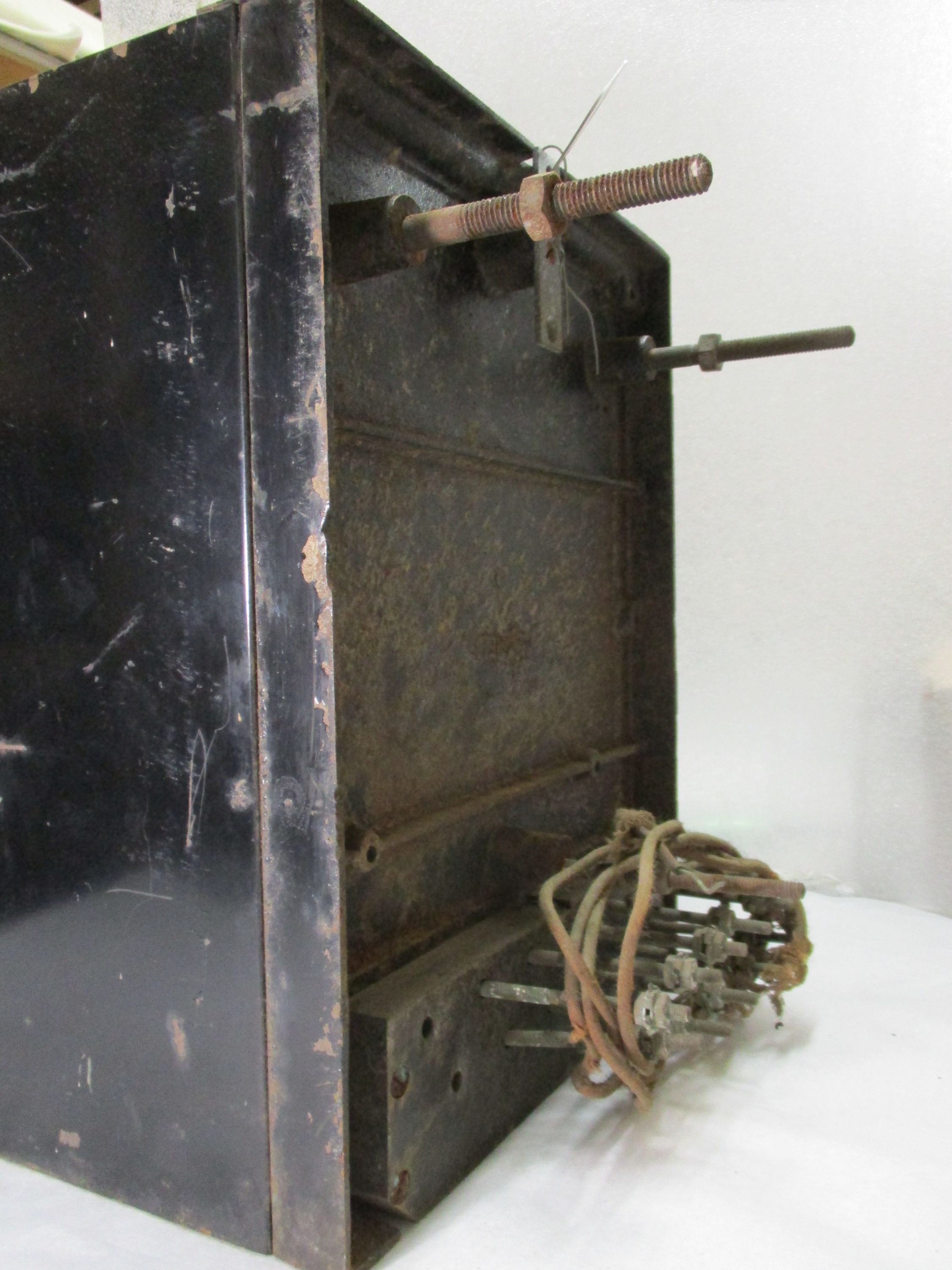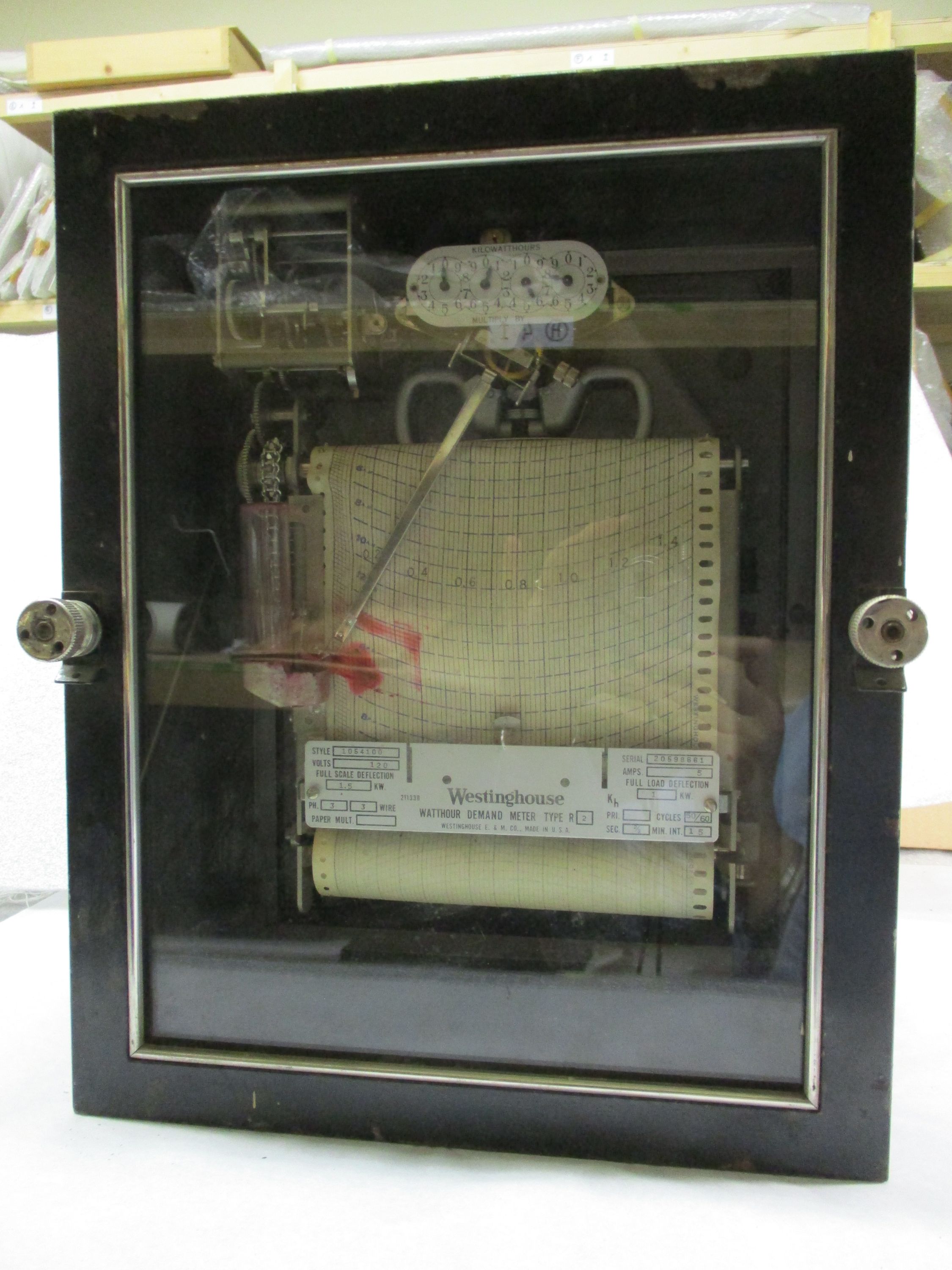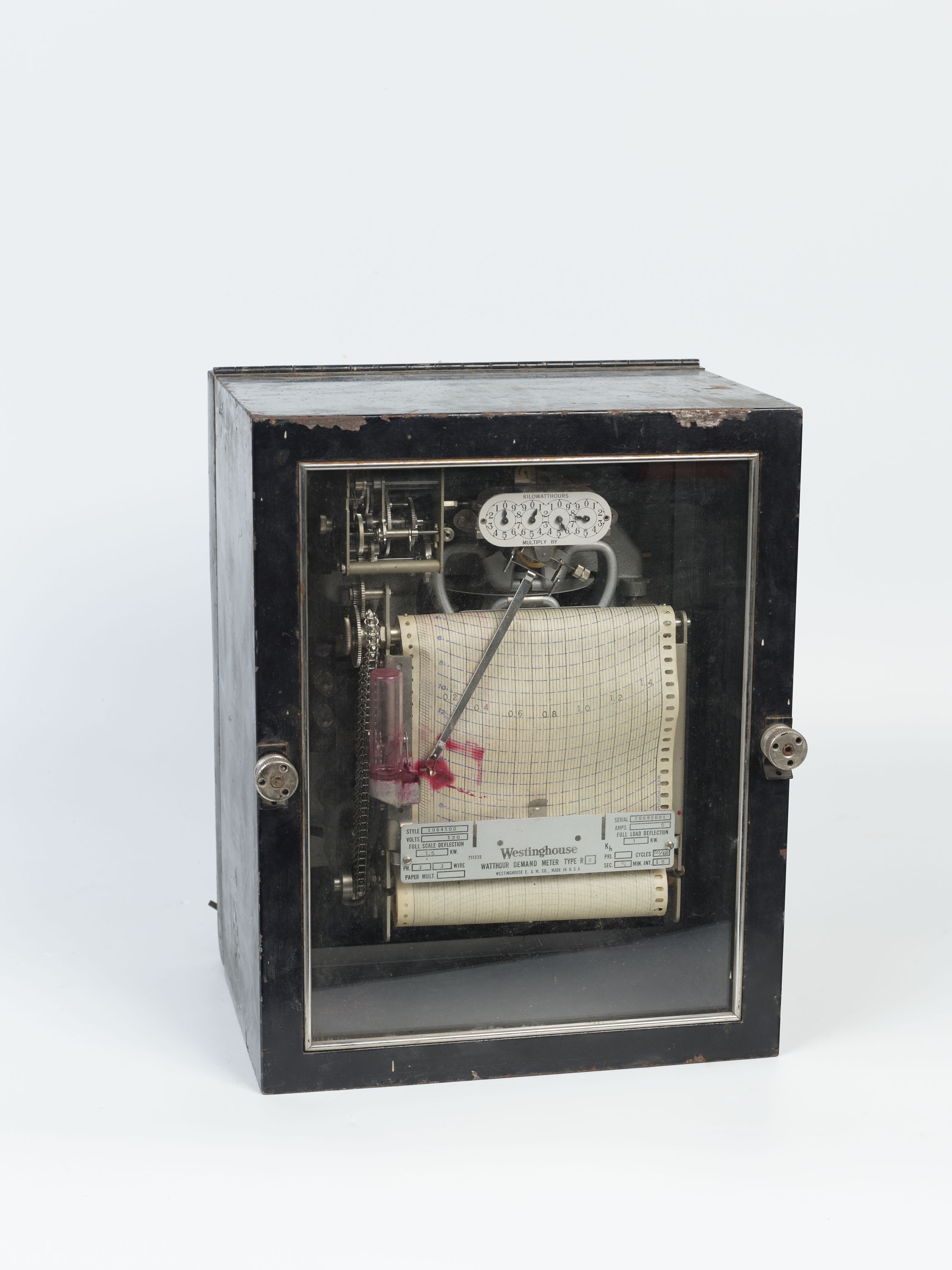 Mécanisme de mesure avec un système de report sur papier millimètré dans un coffret mural en métal se fermant par une porte vitrée.