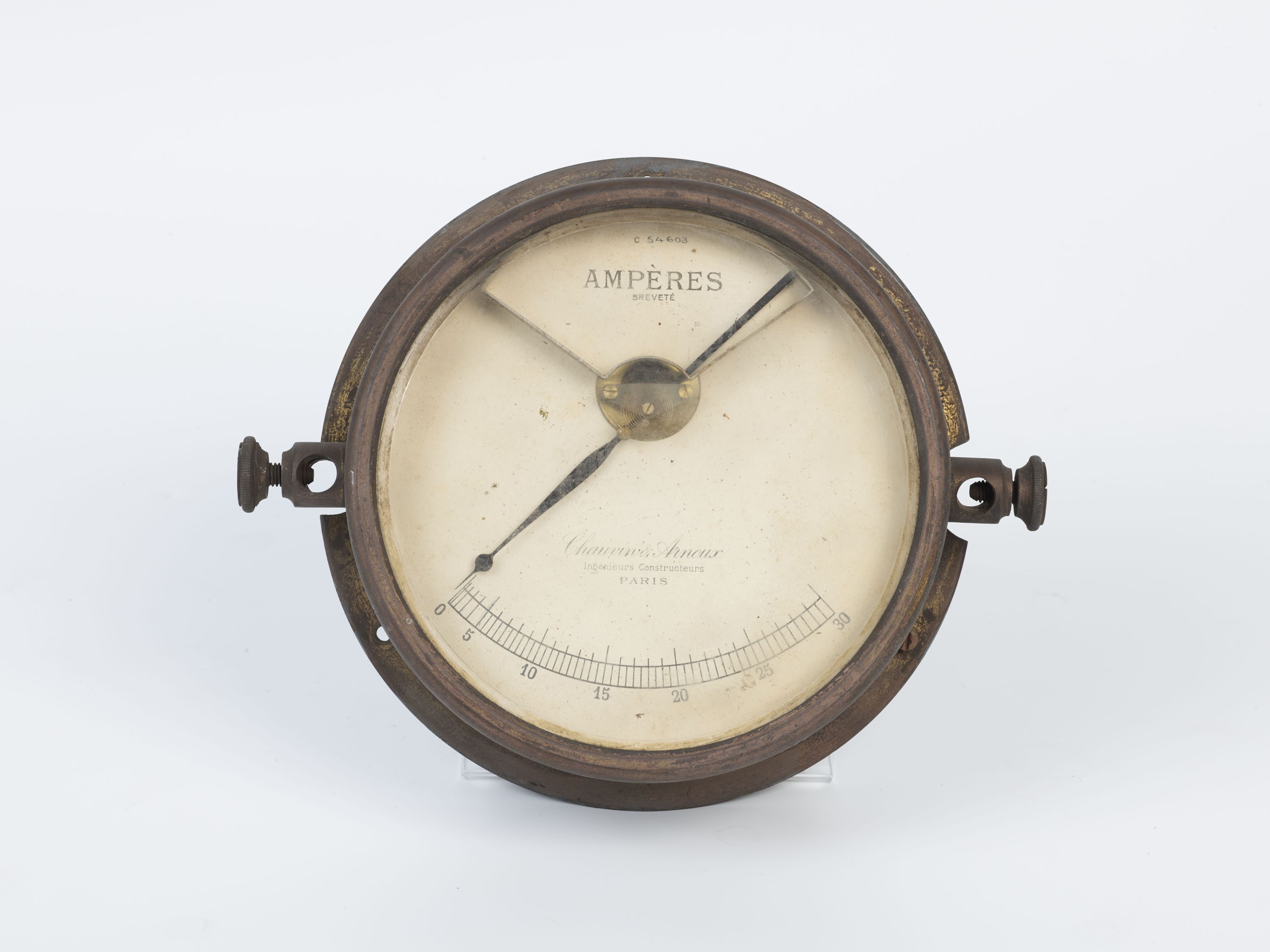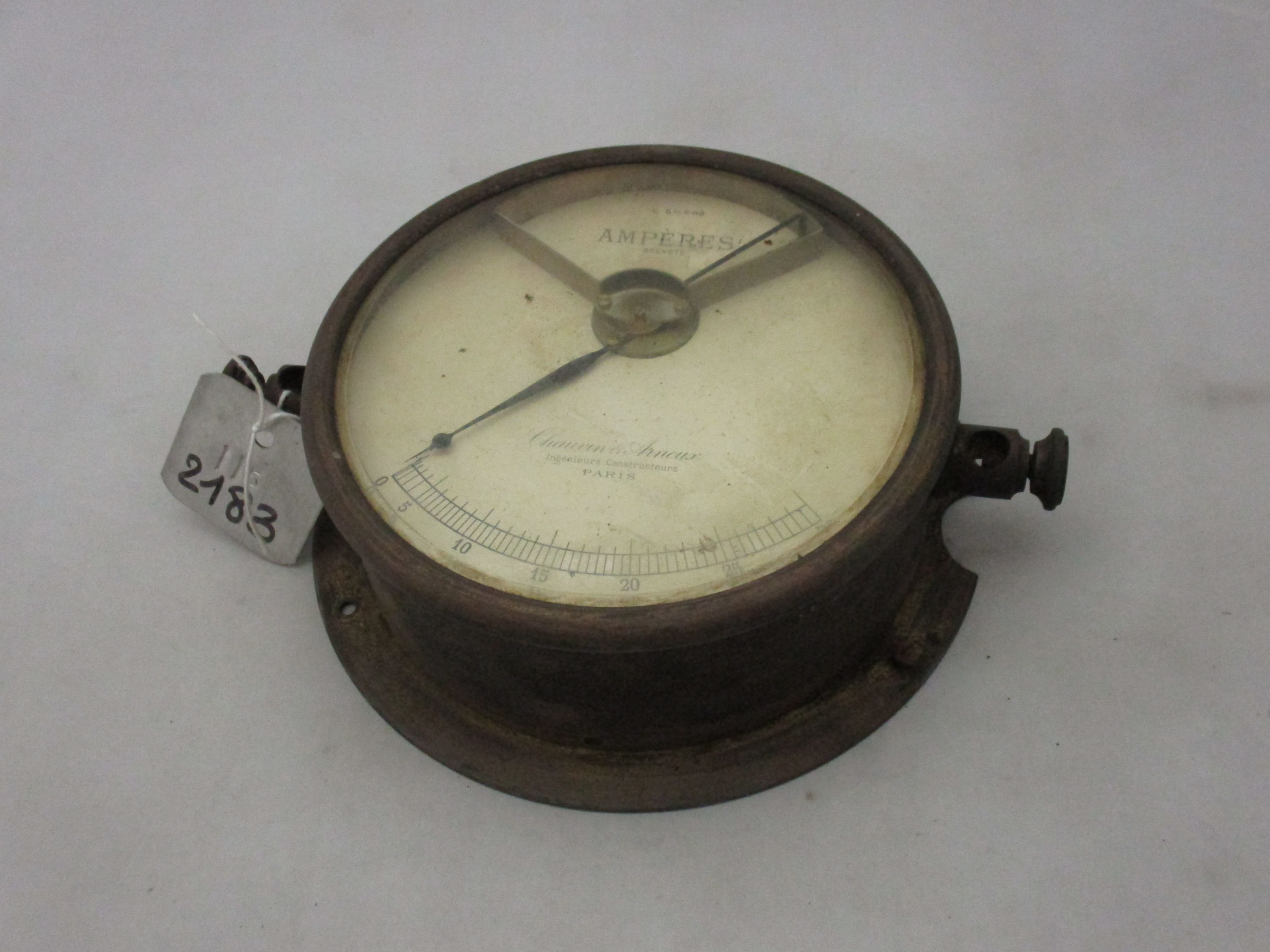 Cet ampèremètre Chauvin & Arnoux est un boîtier circulaire en métal équipé d'une aiguille mobile, d'un cadran