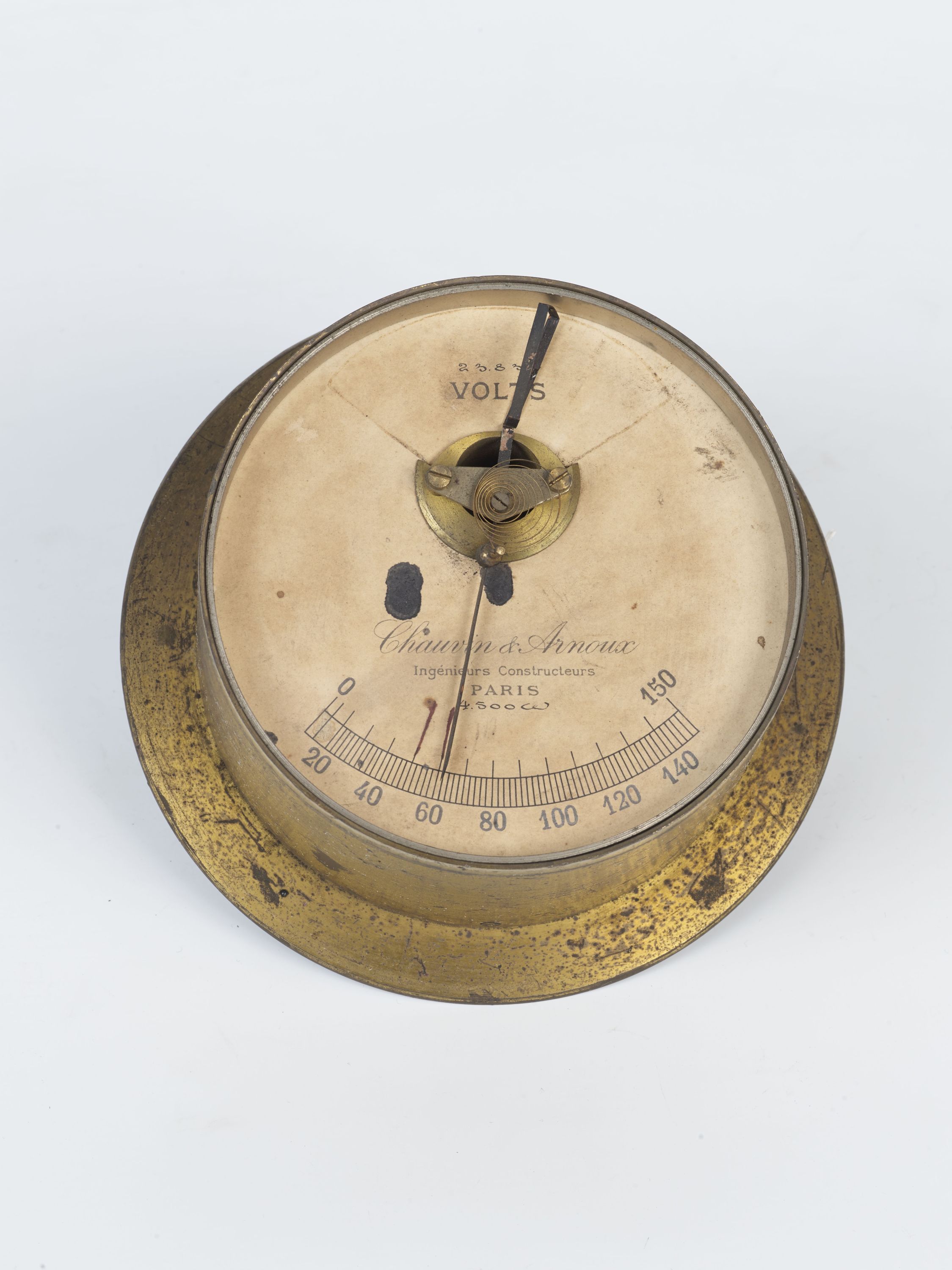 Ce voltmètre Chauvin & Arnoux est composé d'un cadran circulaire, sans vitre, gradué de 0 à 150 volts, doté d'une