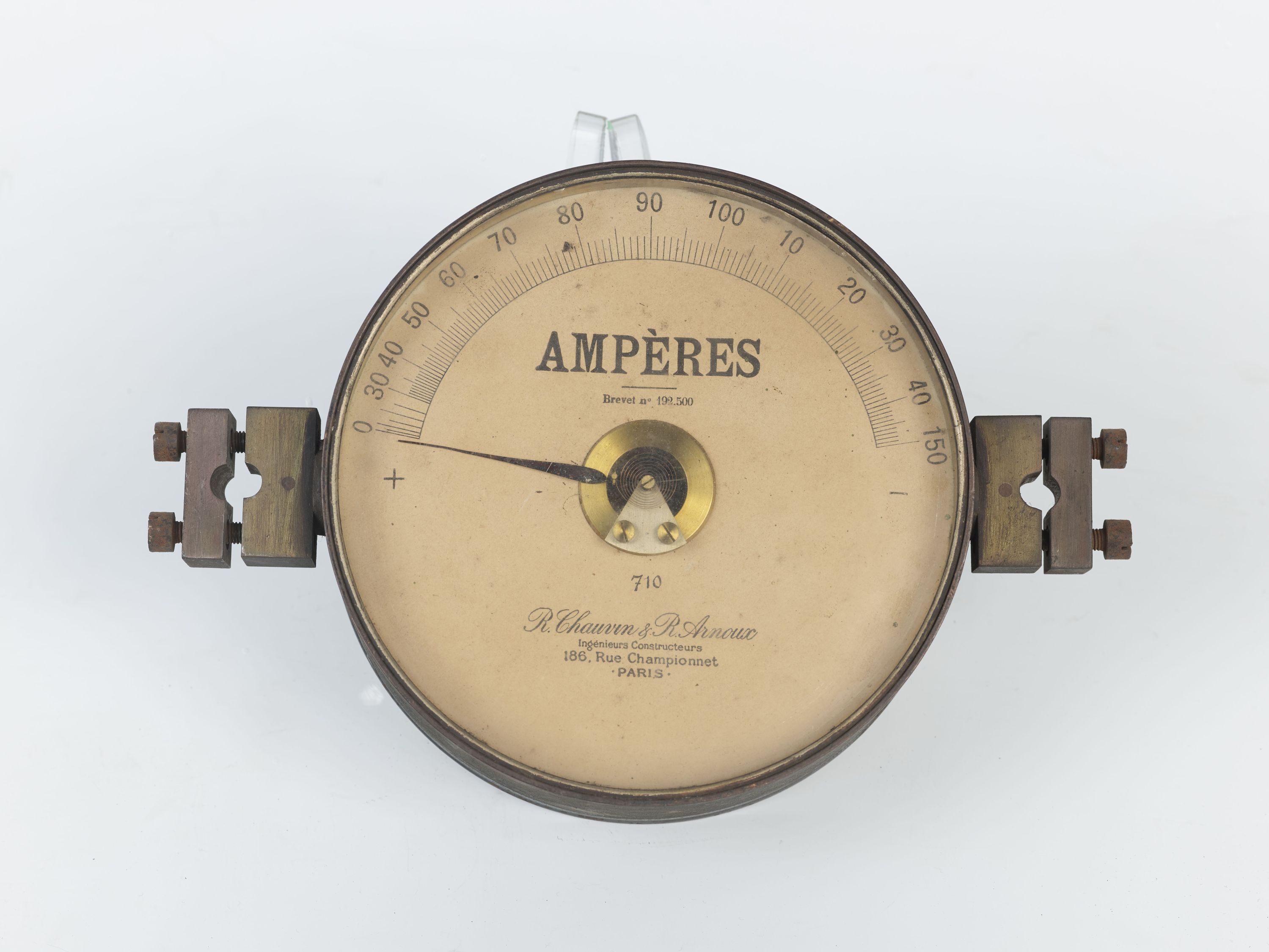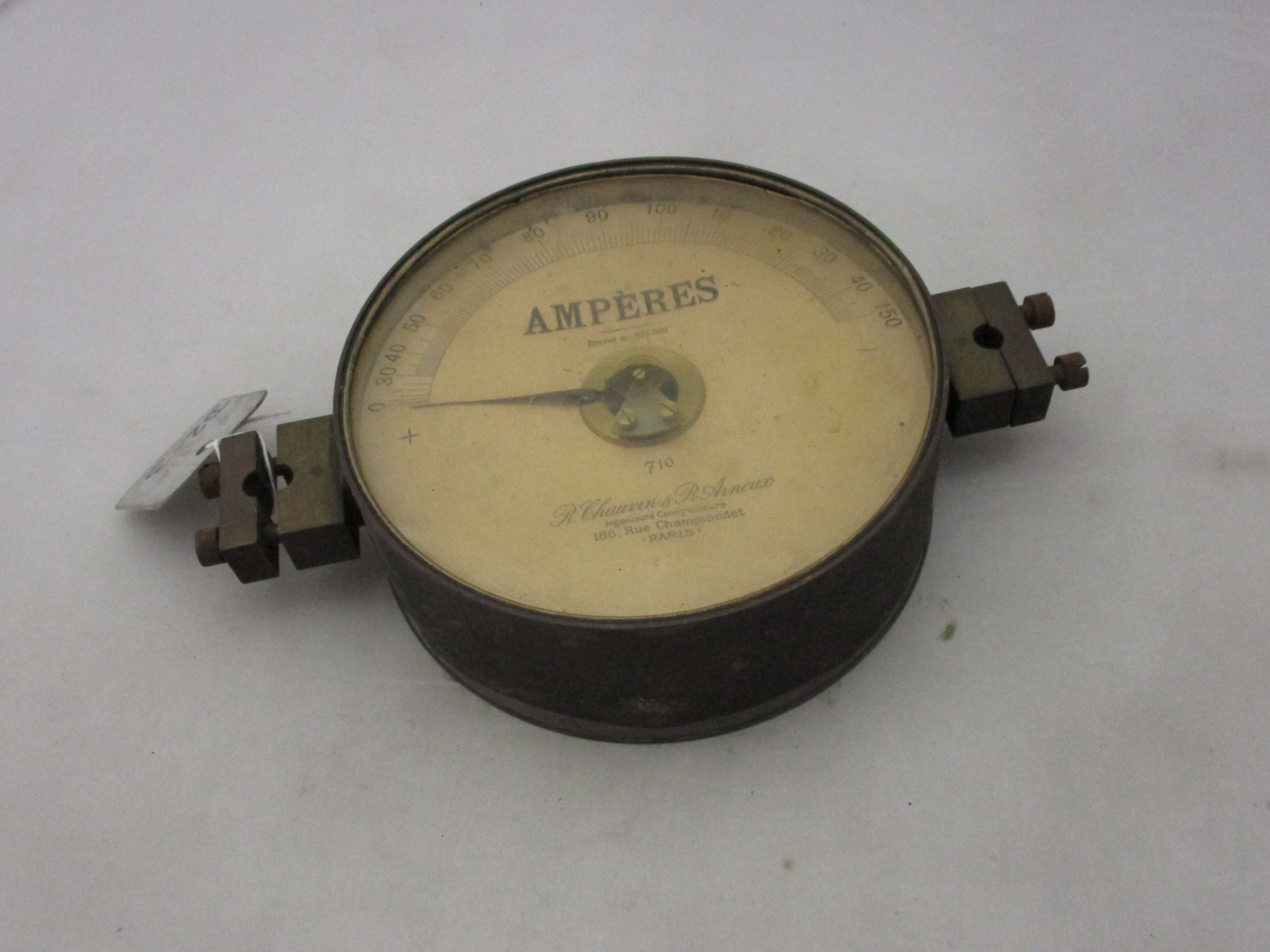 Cet ampèremètre Chauvin & Arnoux est un boîtier circulaire en métal équipé d'une aiguille mobile, d'un cadran