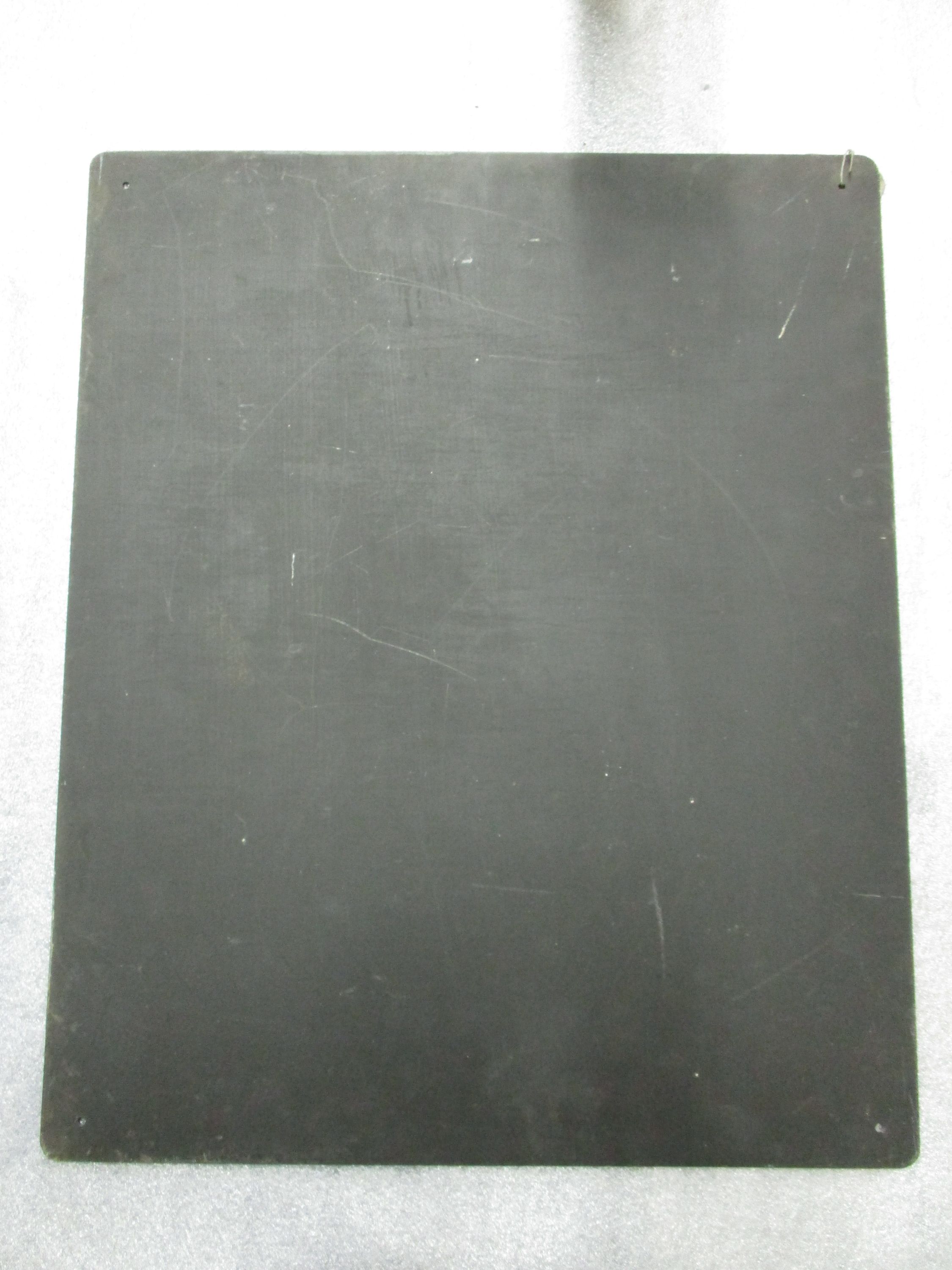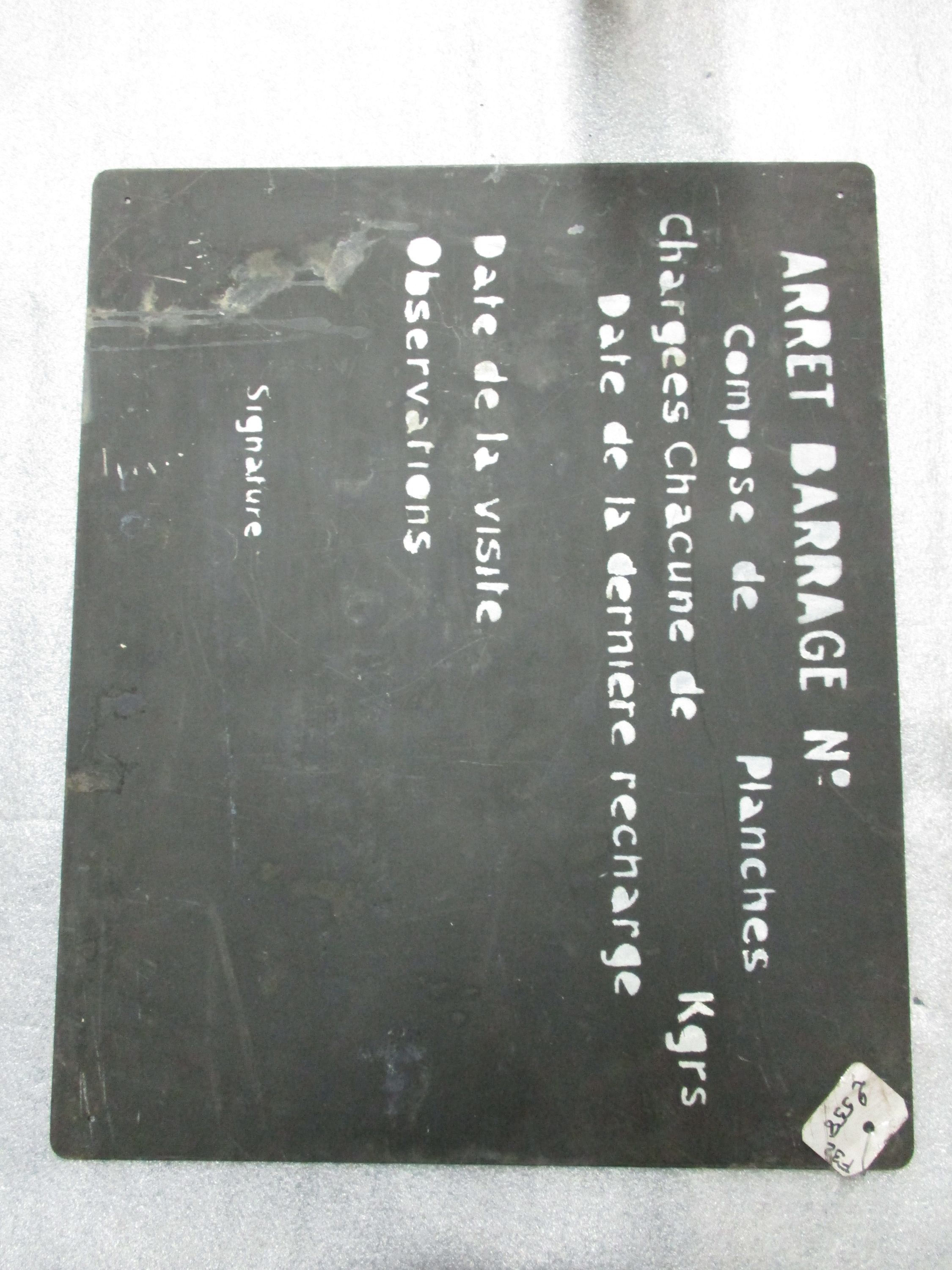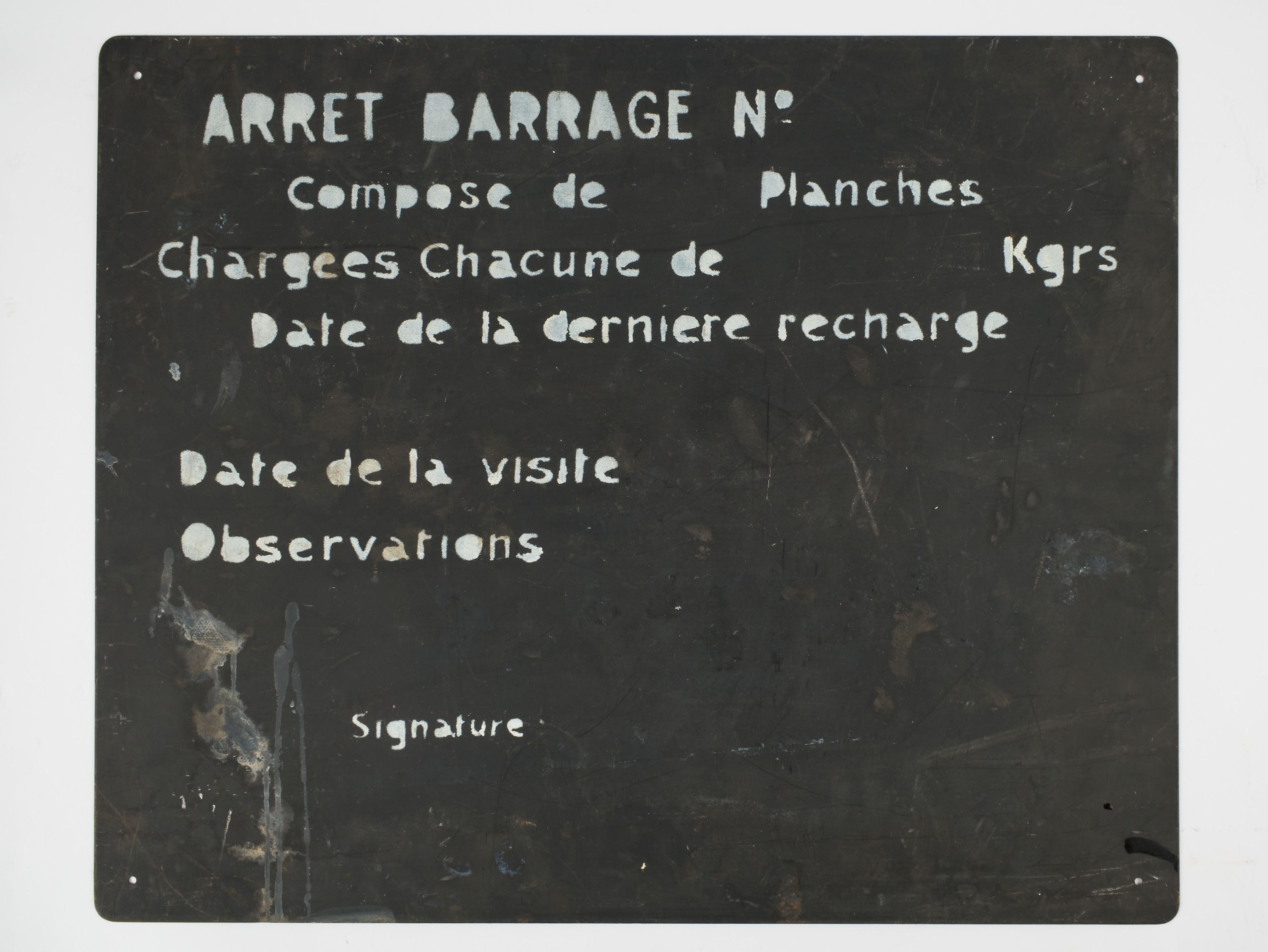 Panneau rectangulaire en métal peint en noir avec des inscriptions en blanc.