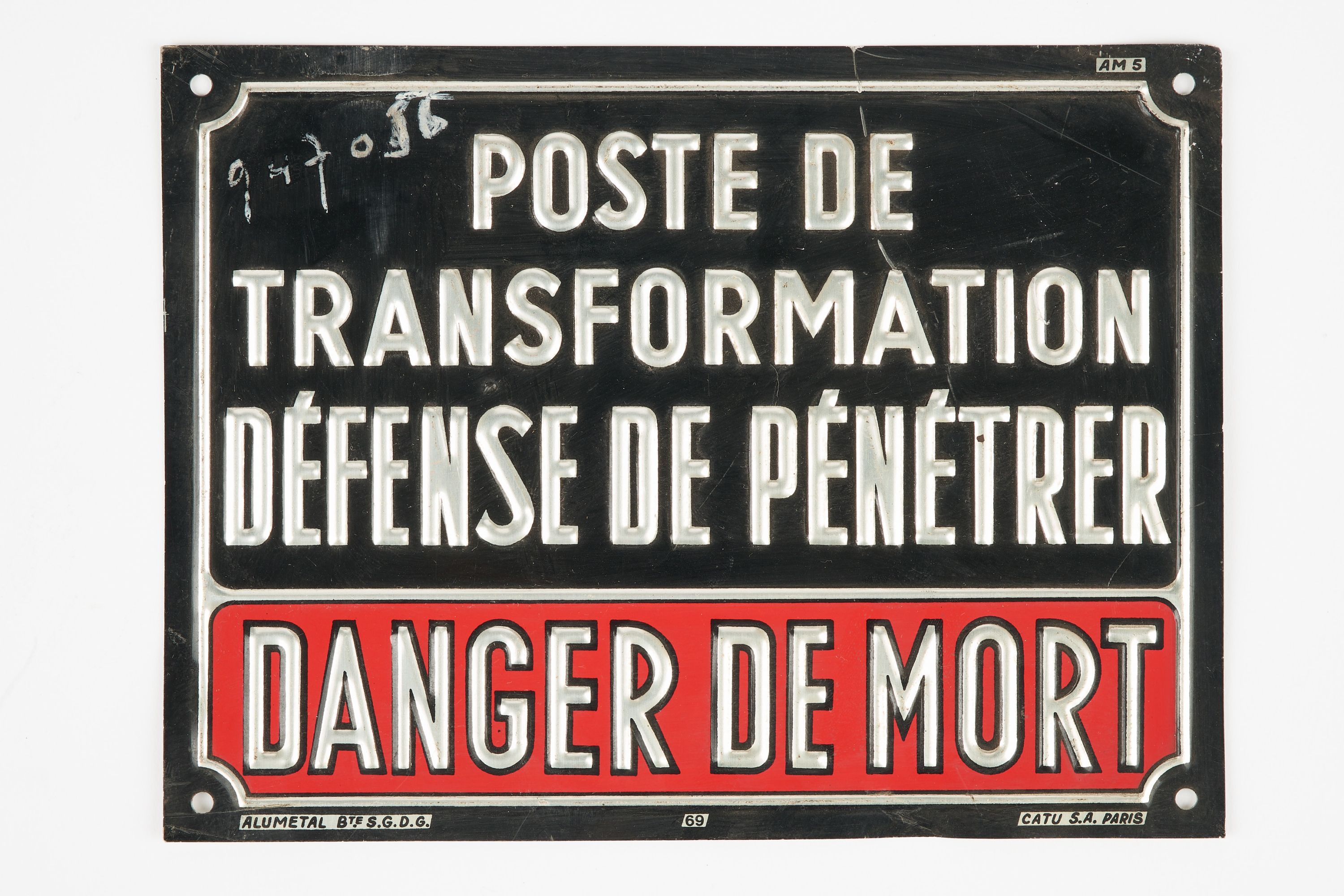 Alu fond noir et rouge lettres en relief grises : POSTE DE TRANSFORMATION - DEFENSE DE PENETRER - DANGER DE MORT