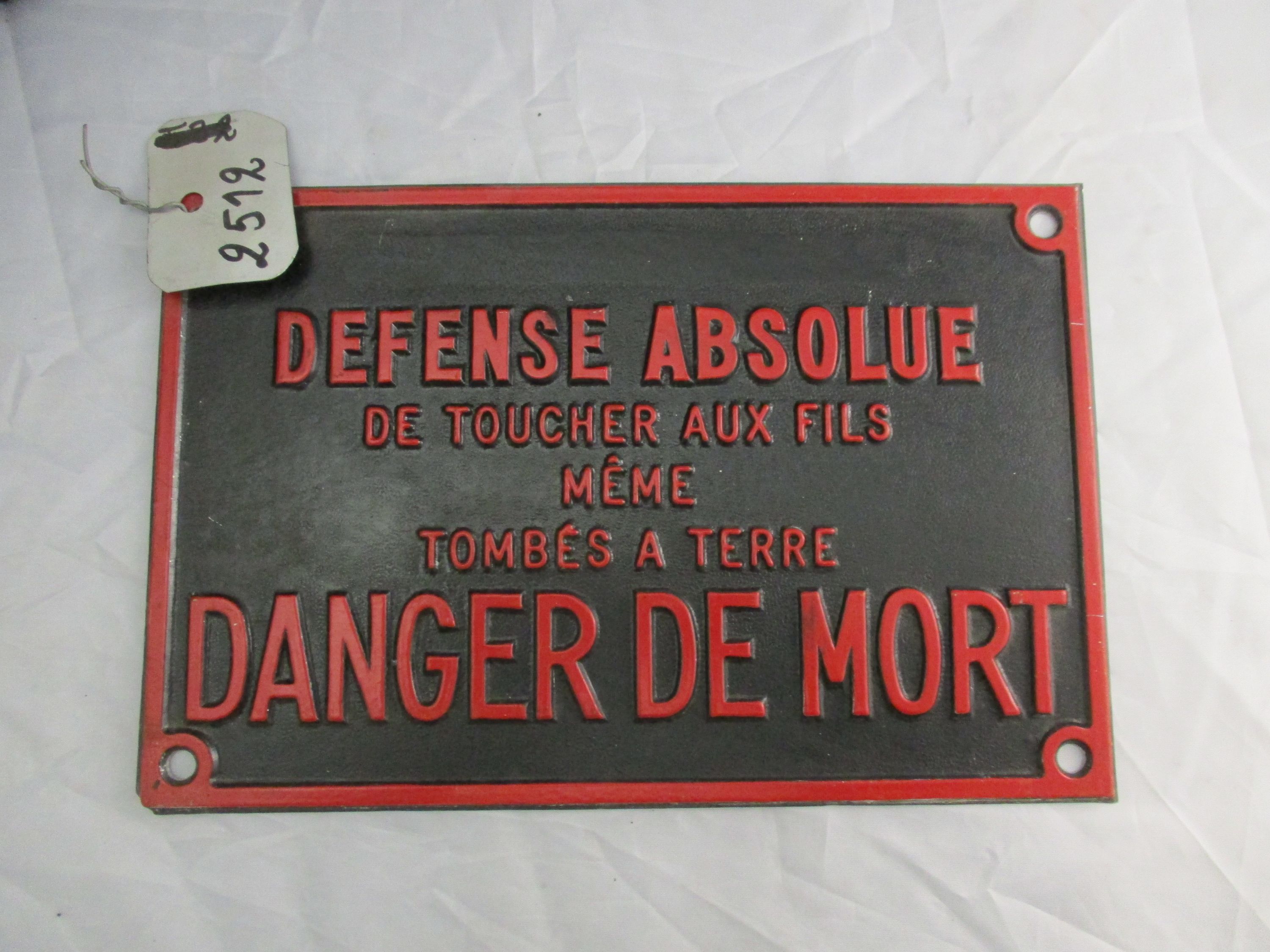Alu fond noir lettres en relief rouge : DEFENSE ABSOLUE DE TOUCHER AUX FILS MEME TOMBES A TERRE - DANGER DE MORT